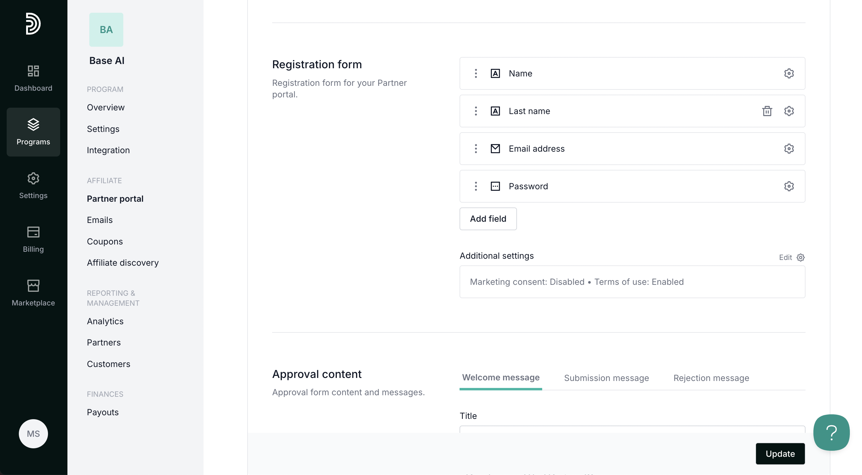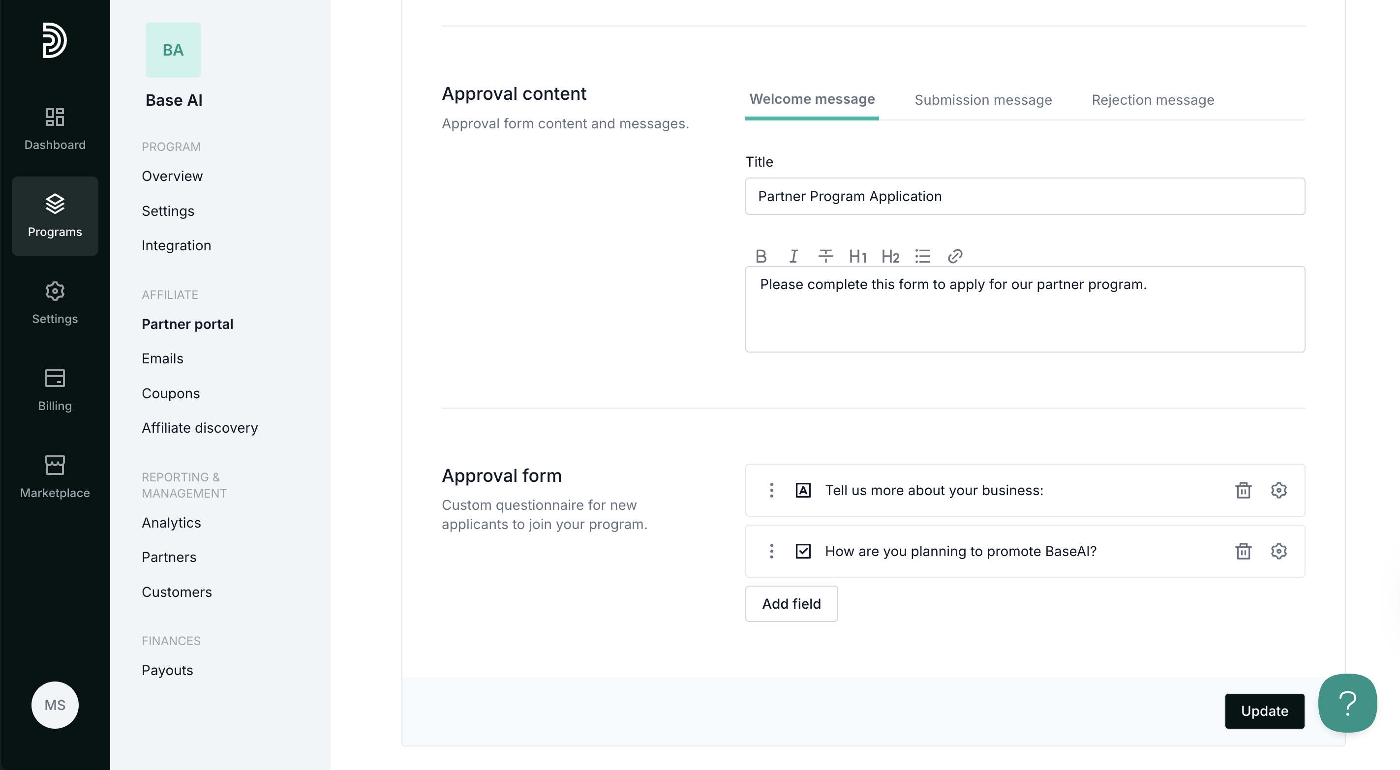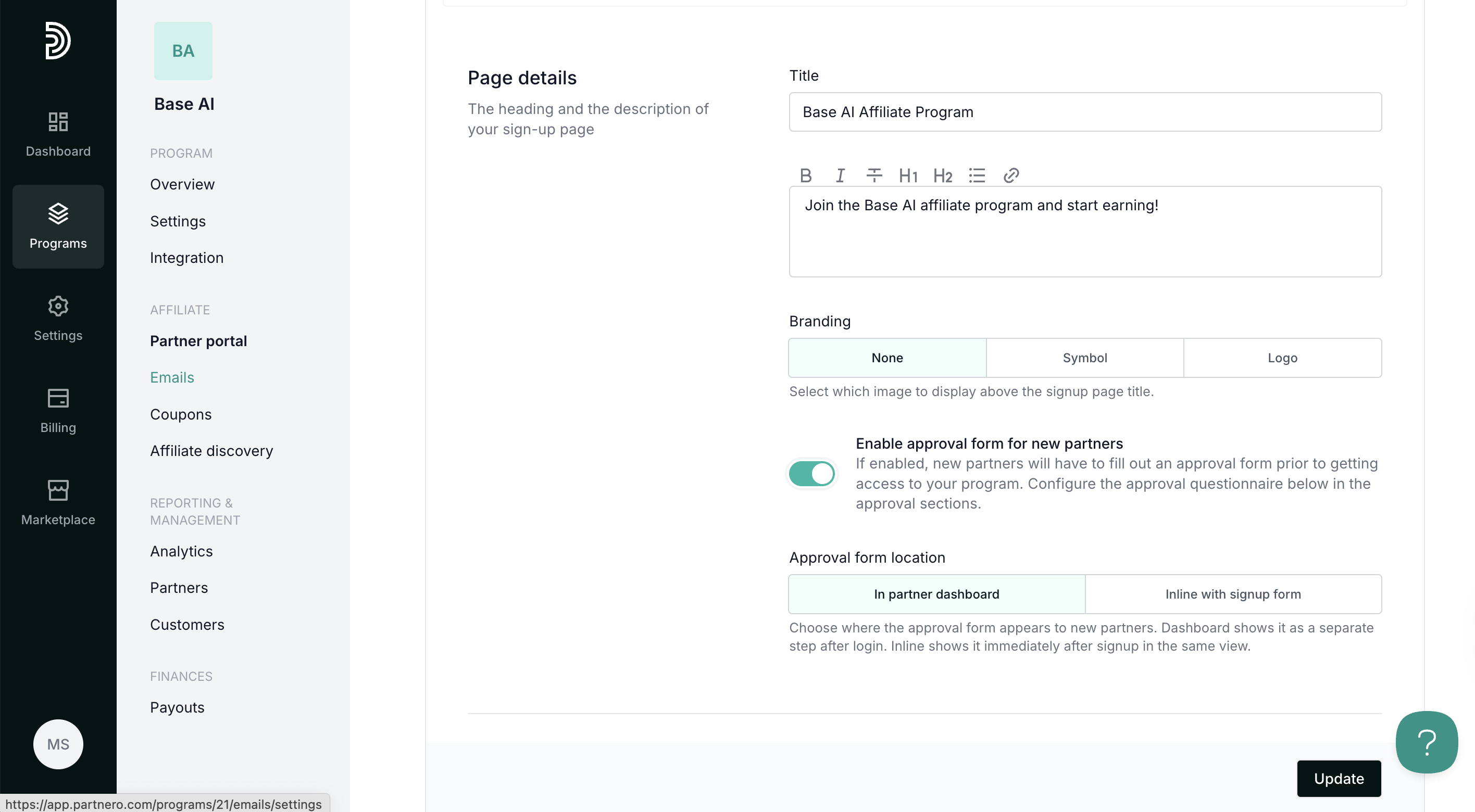 Add a title and description to welcome your new partners. Choose your branding option and enable partner approval forms.