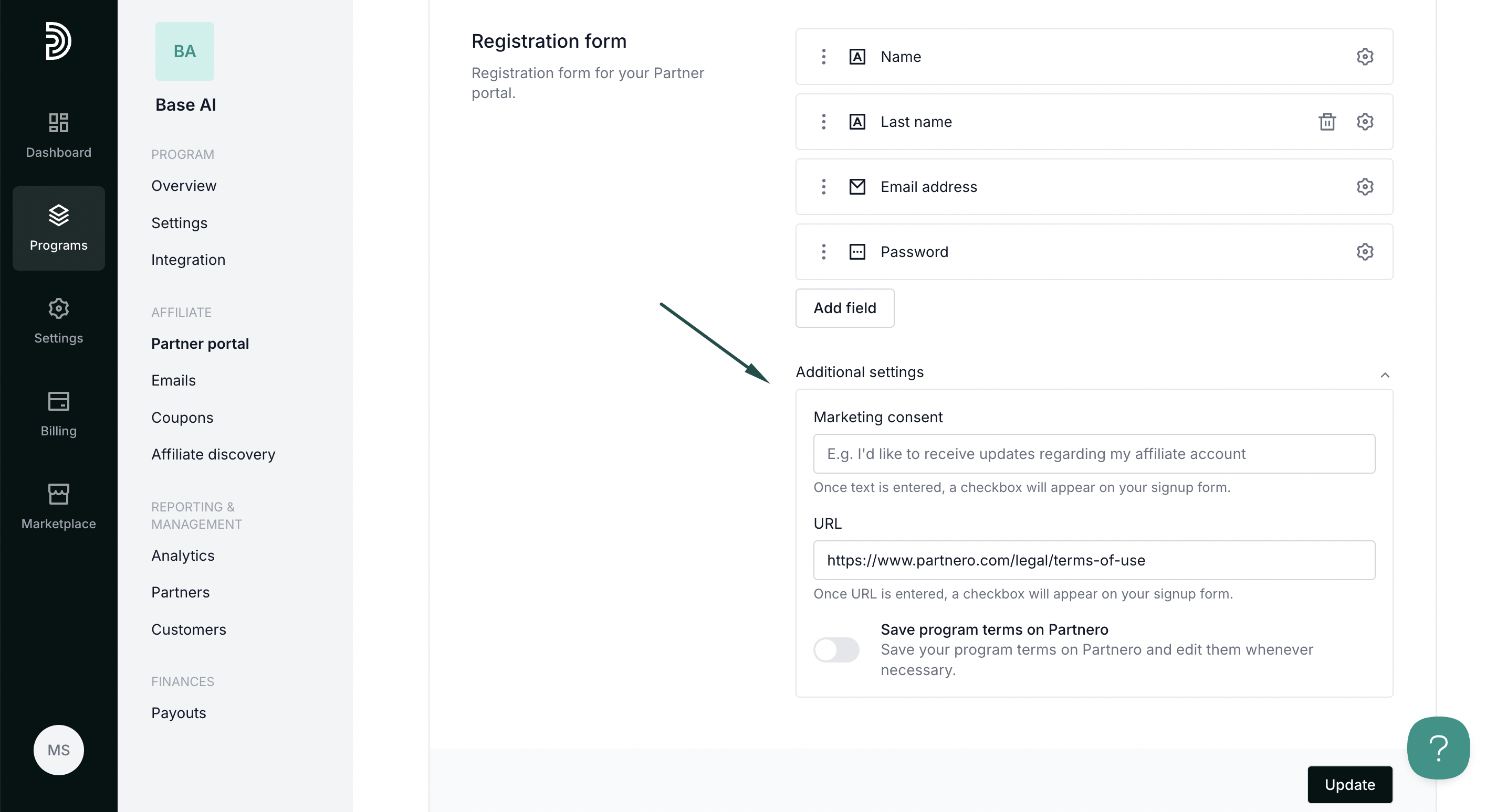 Terms of use - add a link to your partner program terms. Once added, a checkbox will be shown under the registration form. Partners will have to check the box to proceed with the registration. Alternatively, you can save program terms on Partnero. Read more.