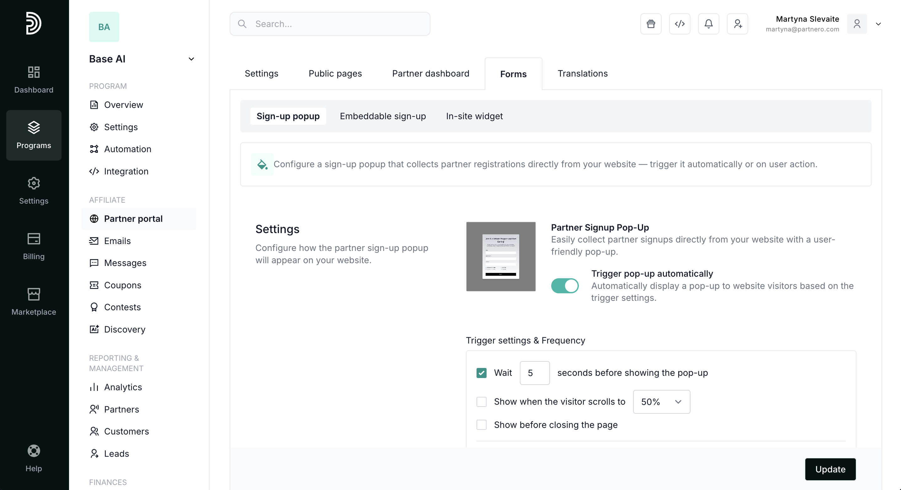 The forms tab allows you to create pop-up or embeddable forms to collect new partners on your website.