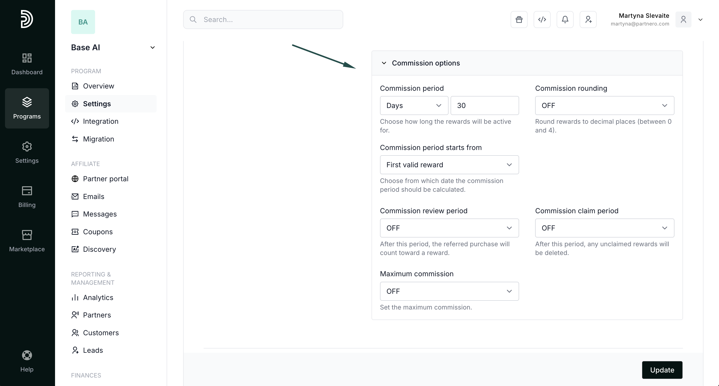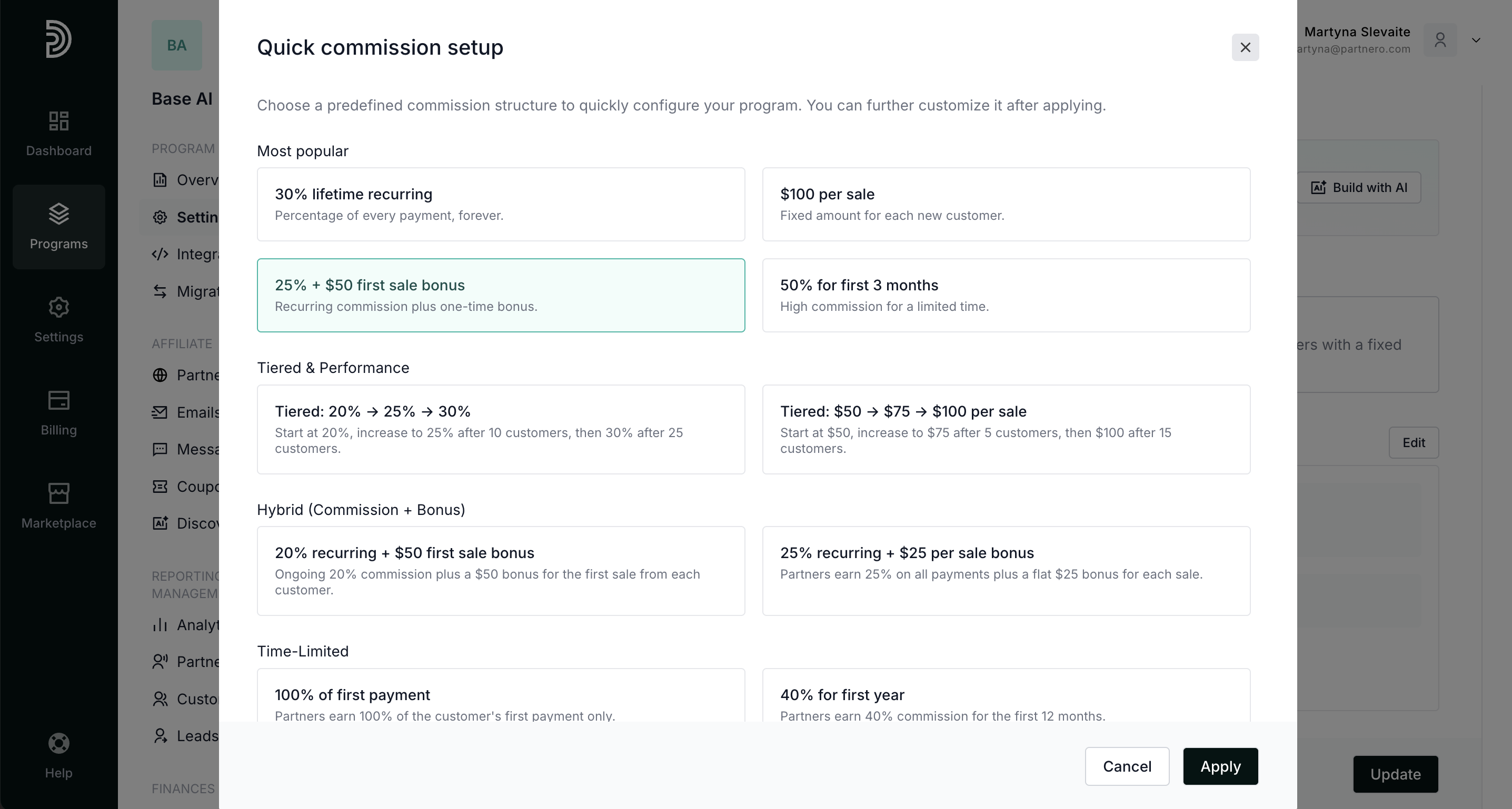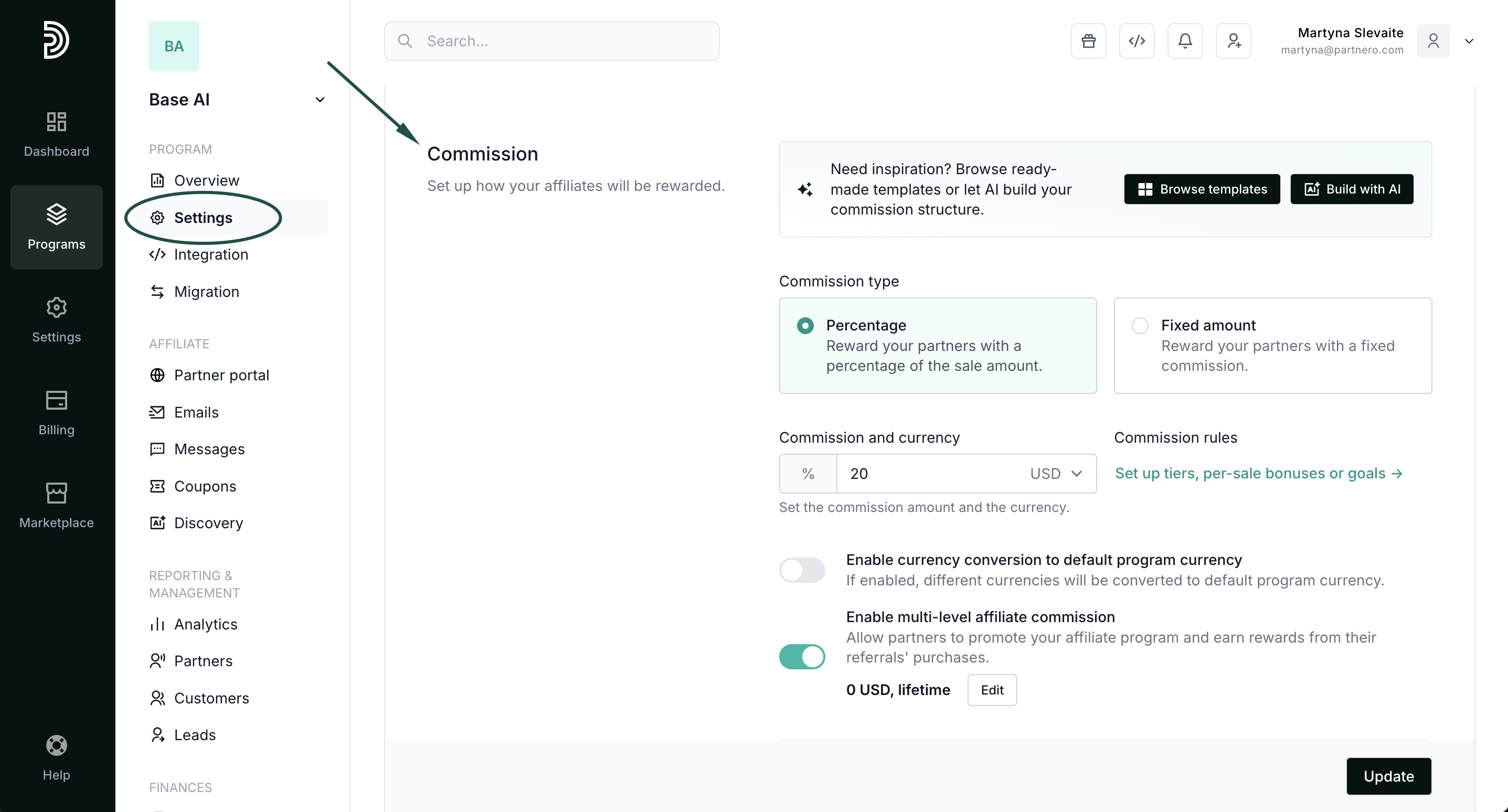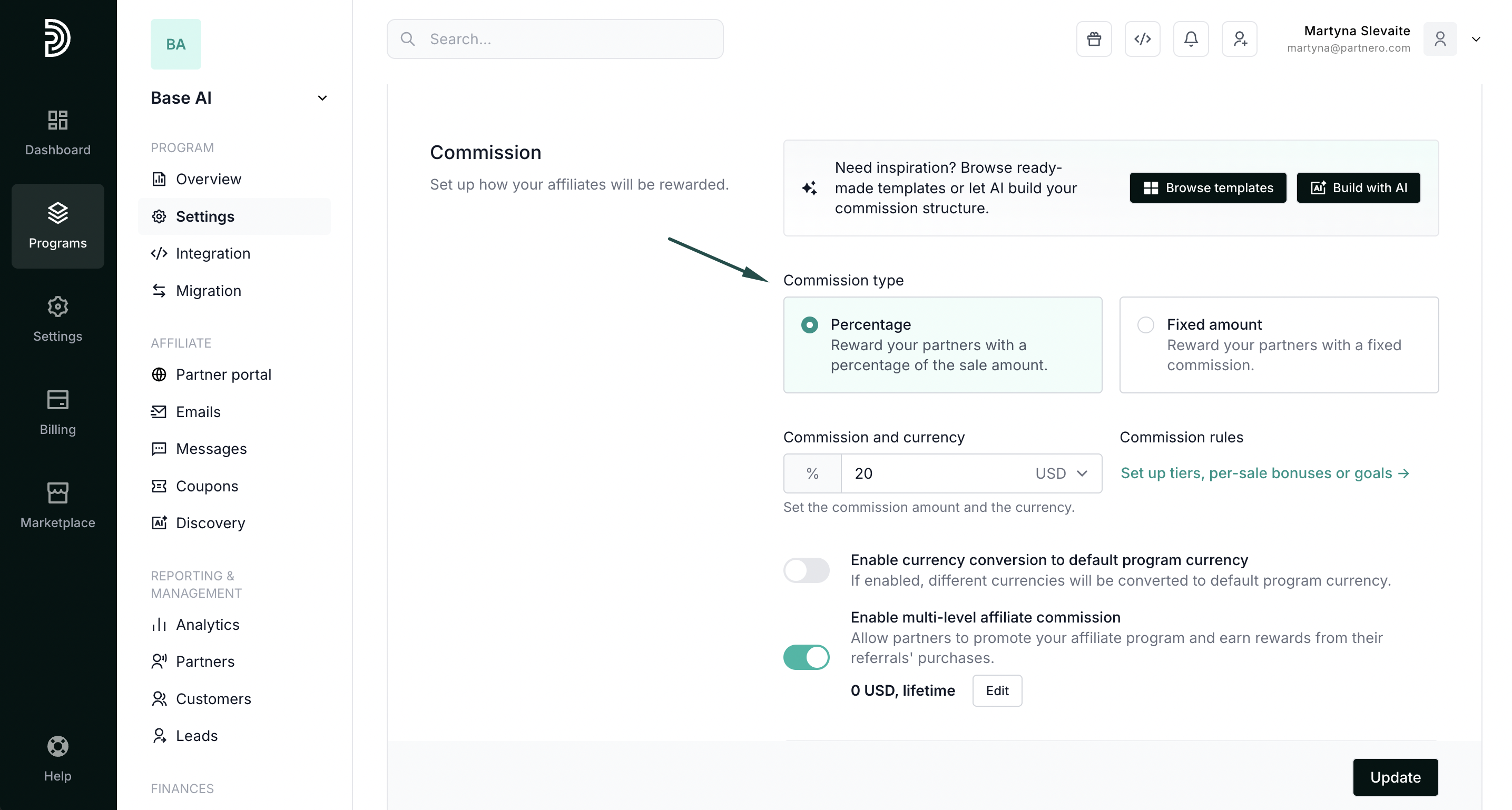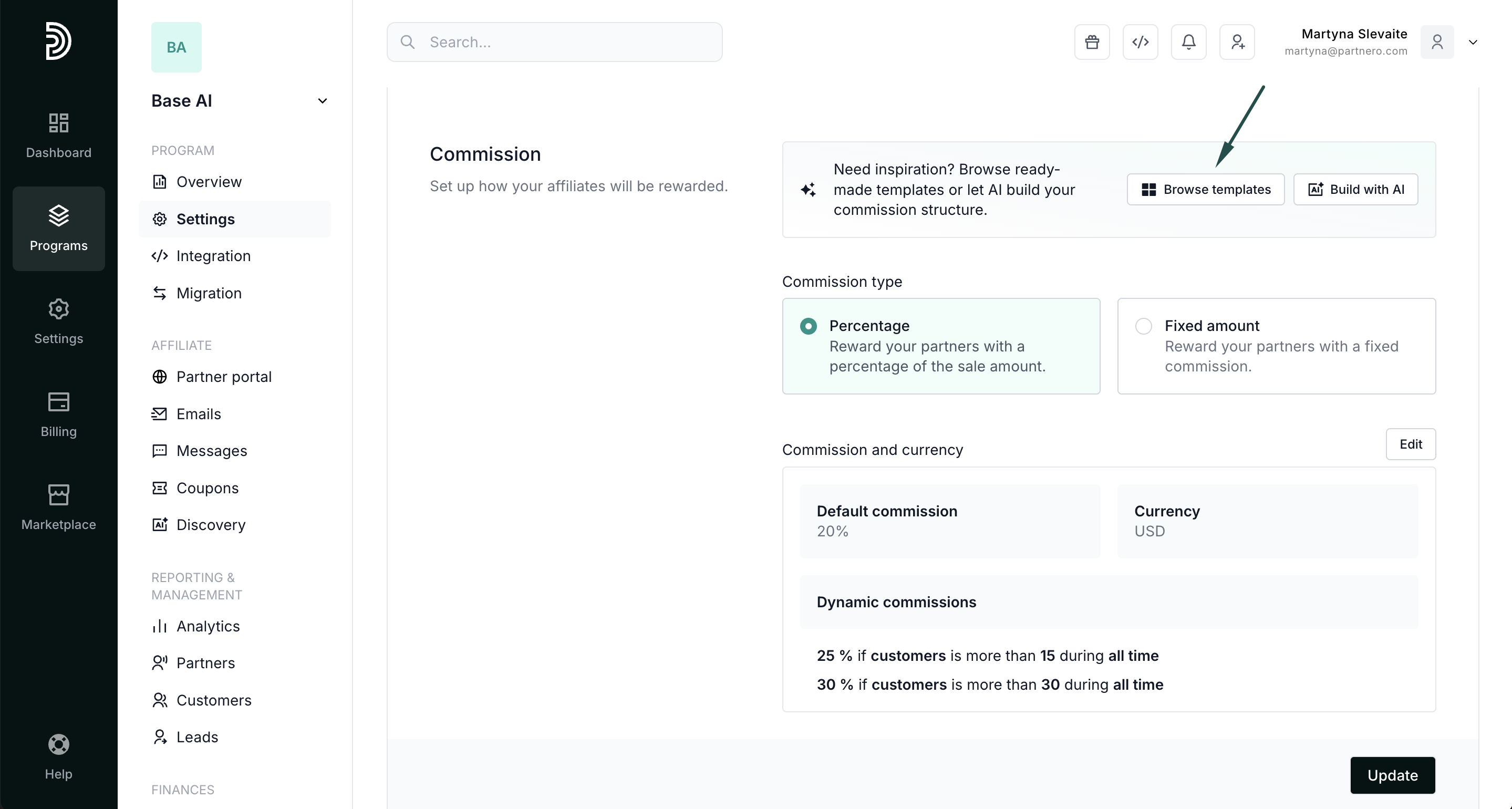 Partnero offers the option to optimize your commission using AI (Read more about using the AI assistant to set up your program commissions here):