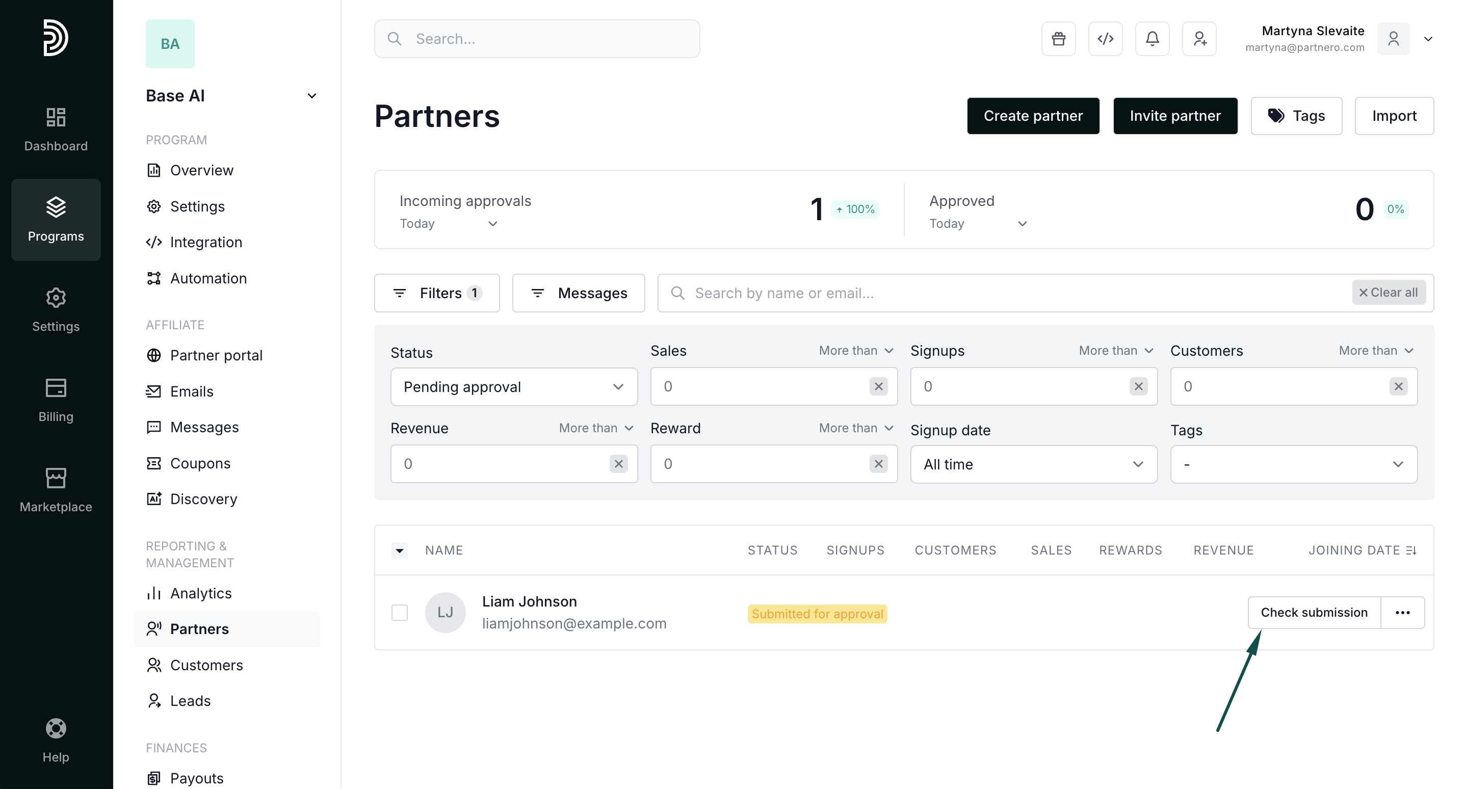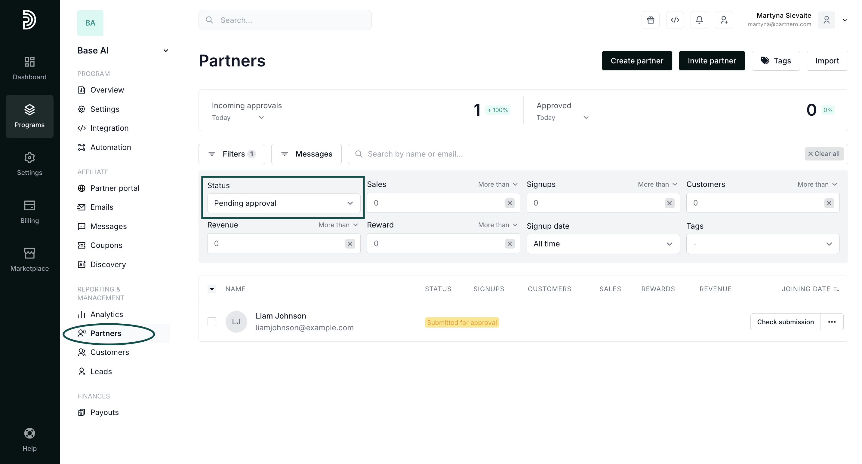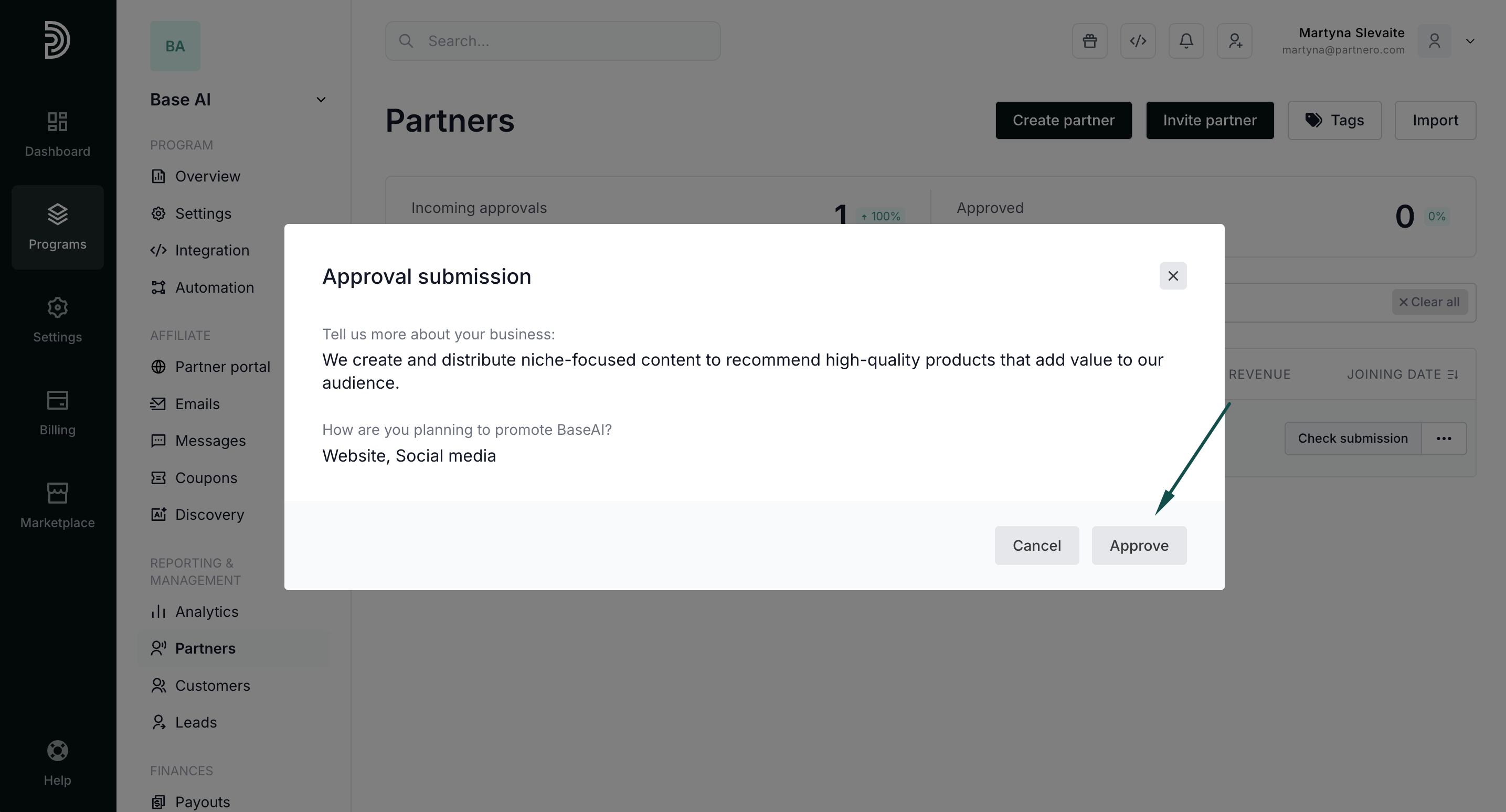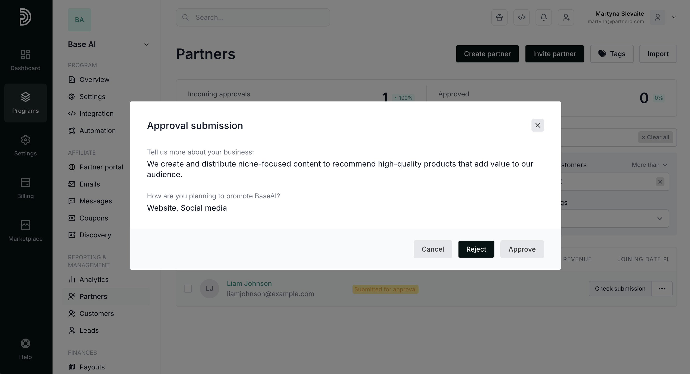When your approval form is ready to go and approvals are enabled, you’ll have to review each new partner and either approve or reject their application.