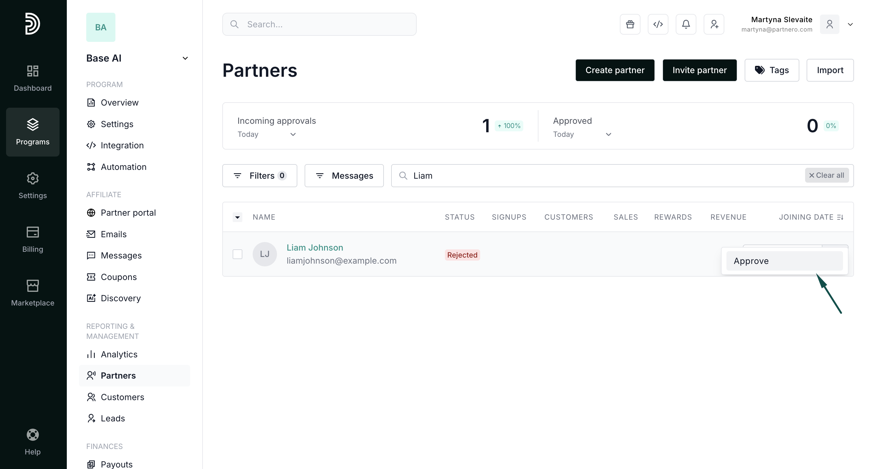 It may happen that a rejected partner will reach out to provide further details, and you’ll decide to approve their application. In order to do that: