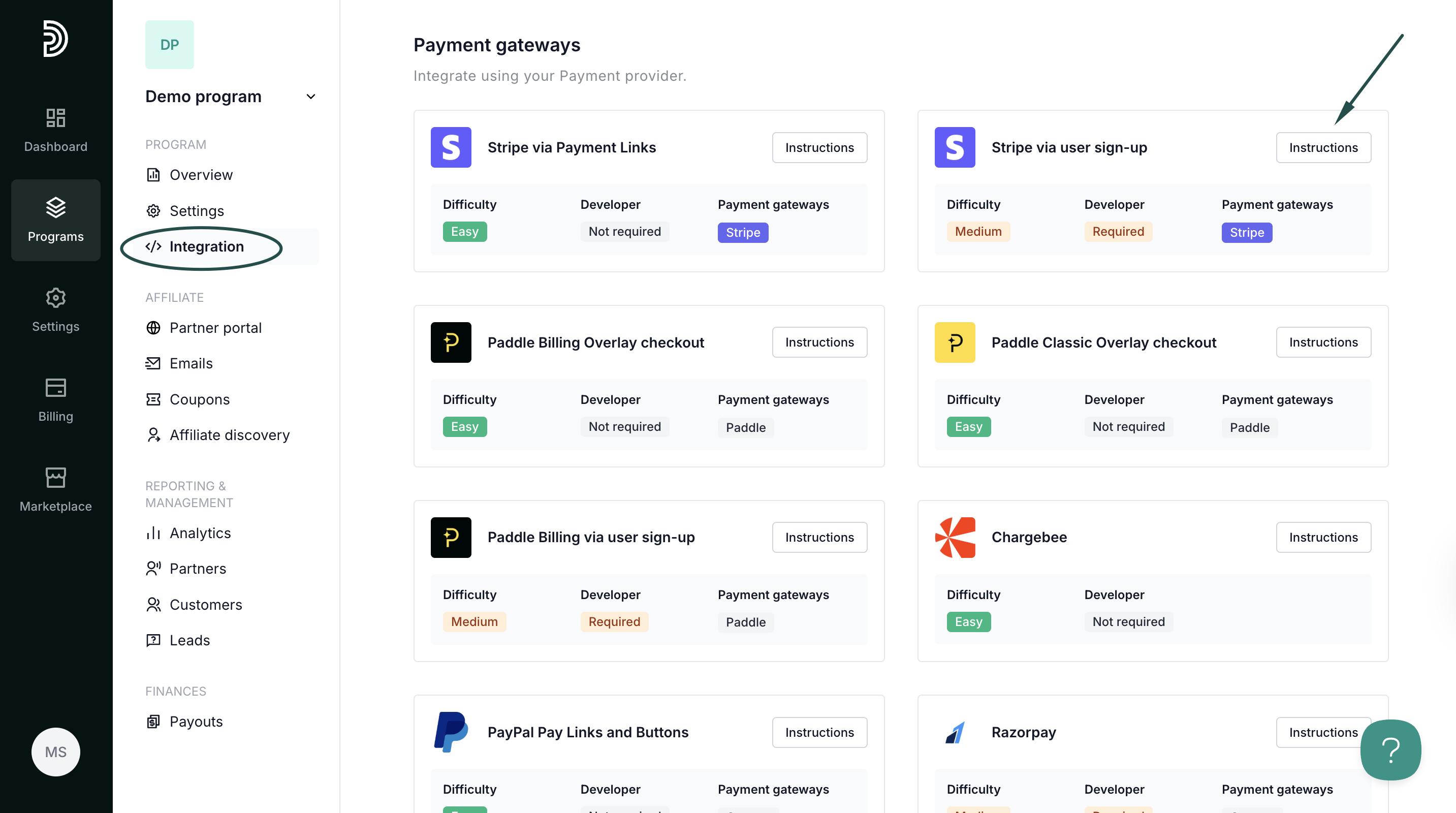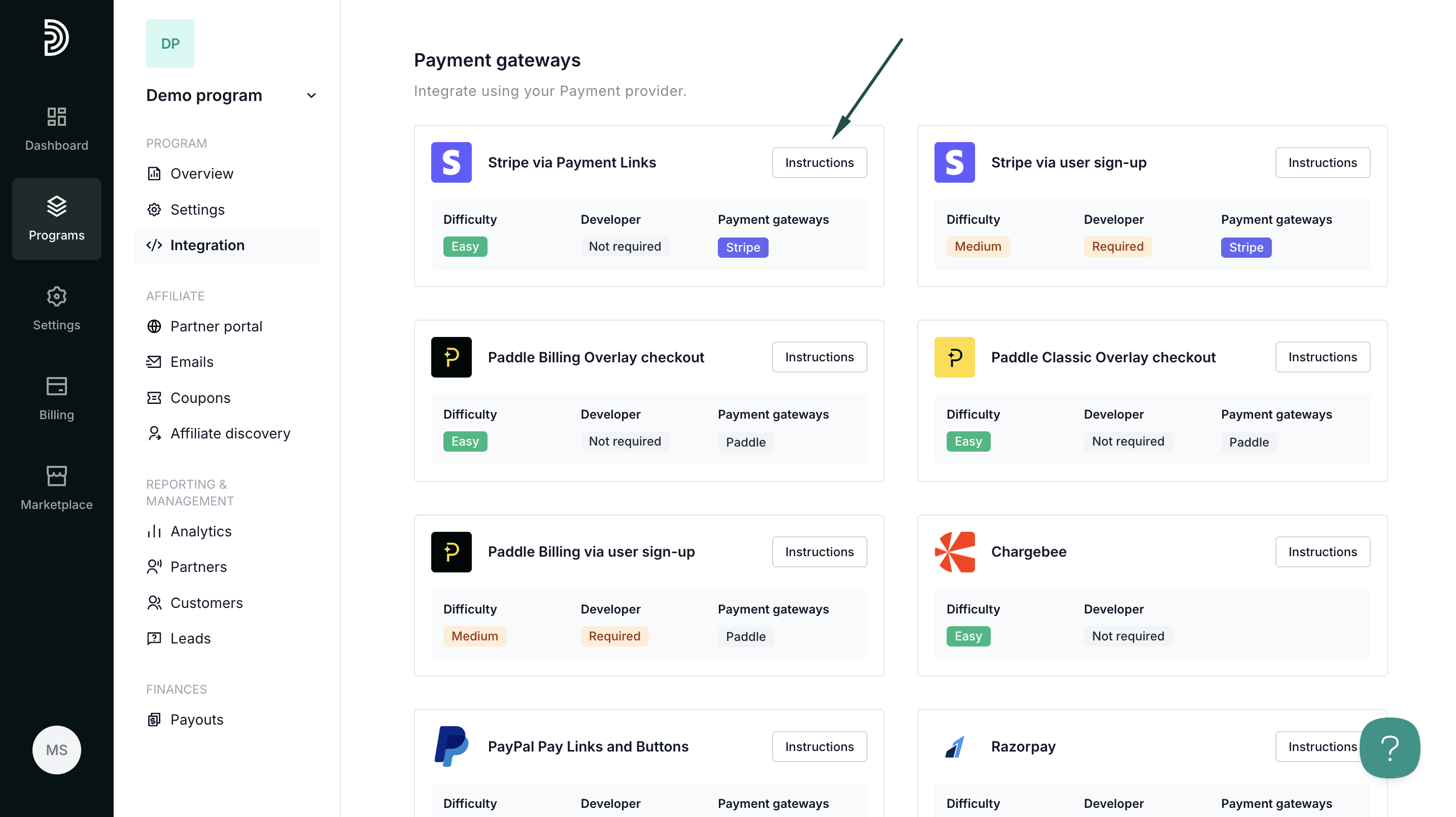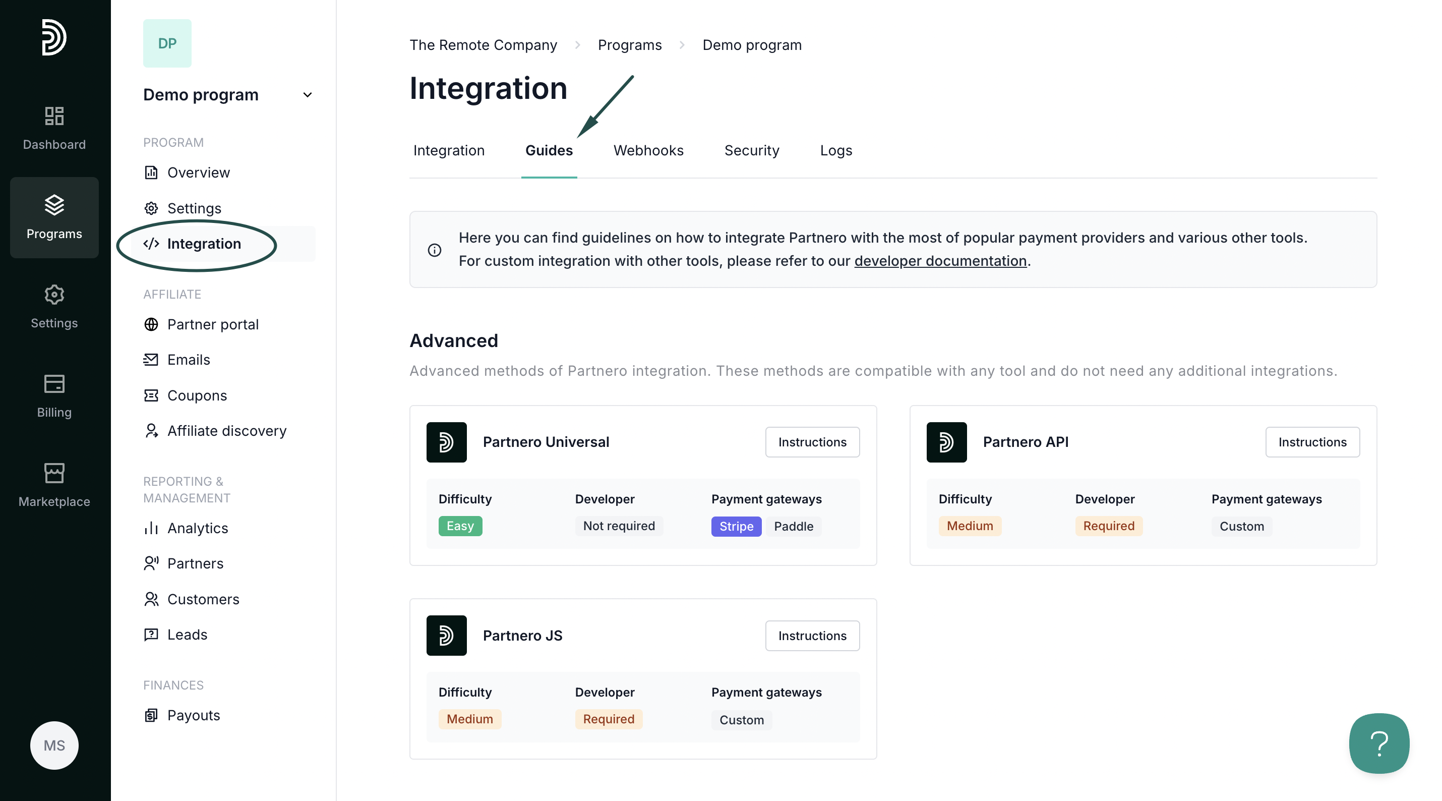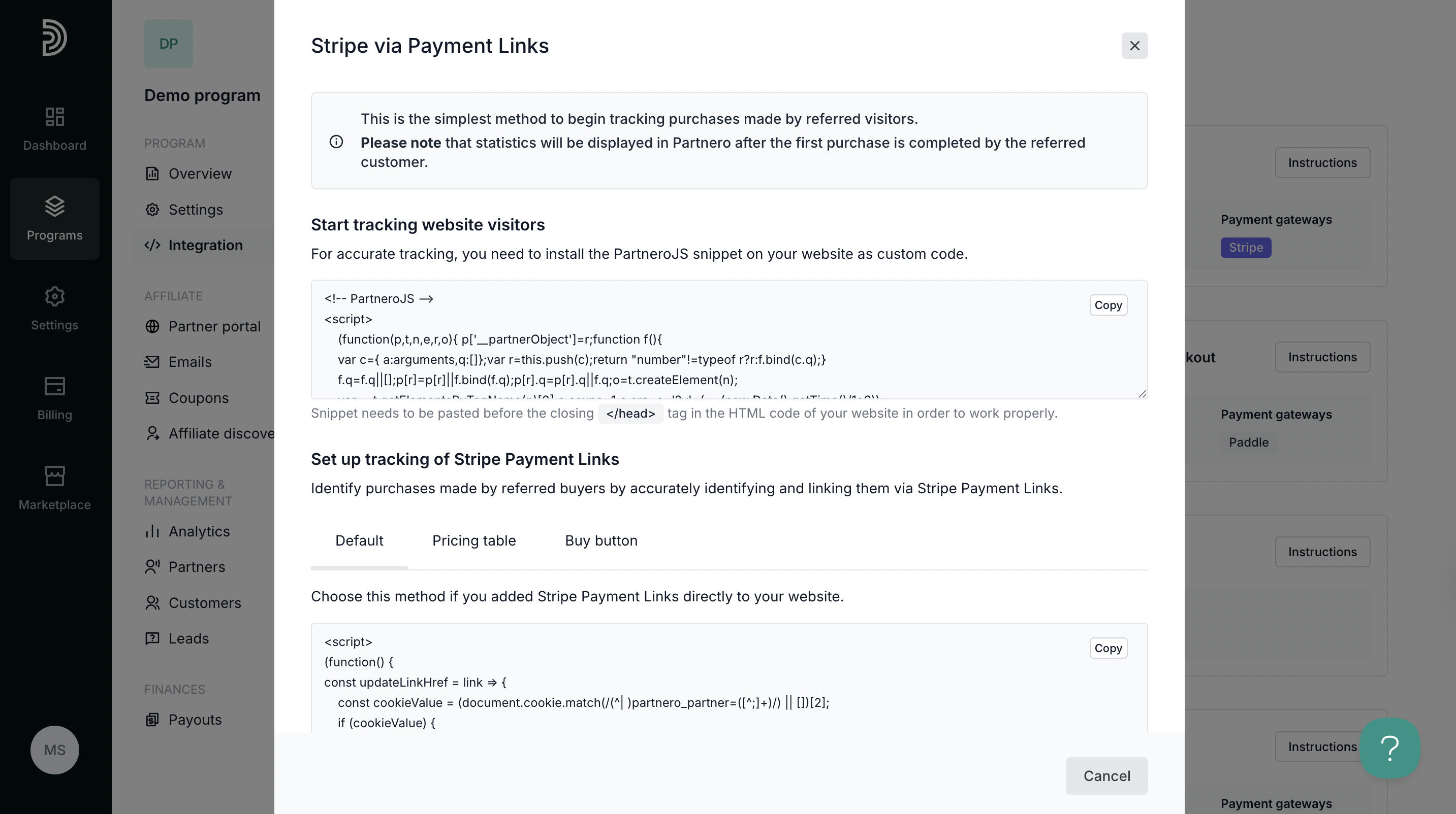 Each Partnero program includes detailed integration guides with ready-to-use code snippets. Choose the method that best matches how your business uses Stripe, and follow the instructions in the corresponding guide.
