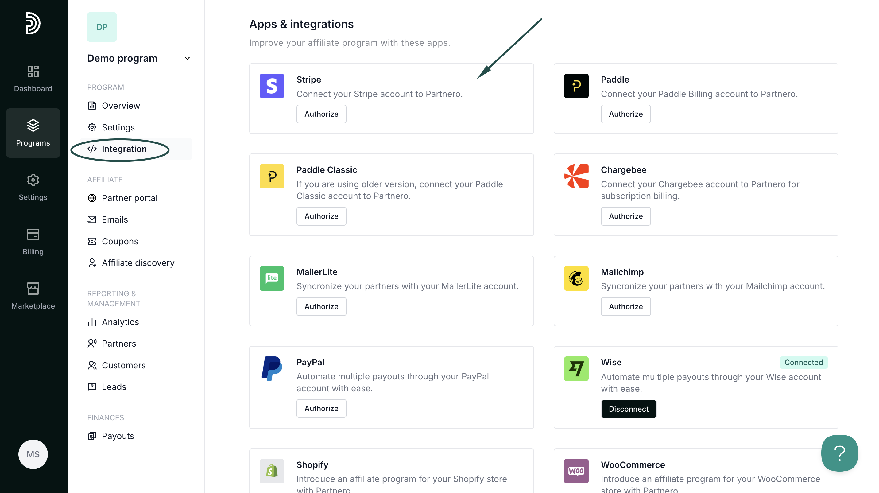Authorizing Stripe under Apps & Integrations allows data about subsequent or recurring purchases made by referred customers to be sent to Partnero.