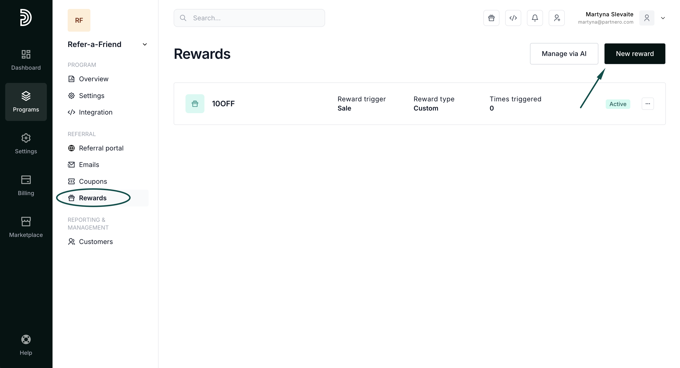 - In your referral program, go to Rewards under Referral. Click New reward: