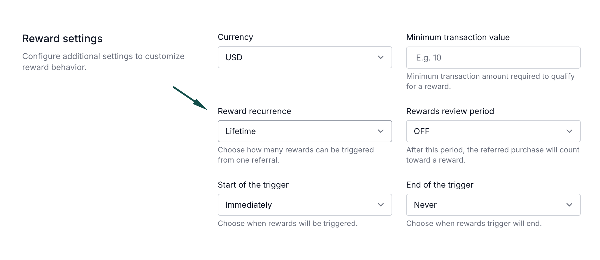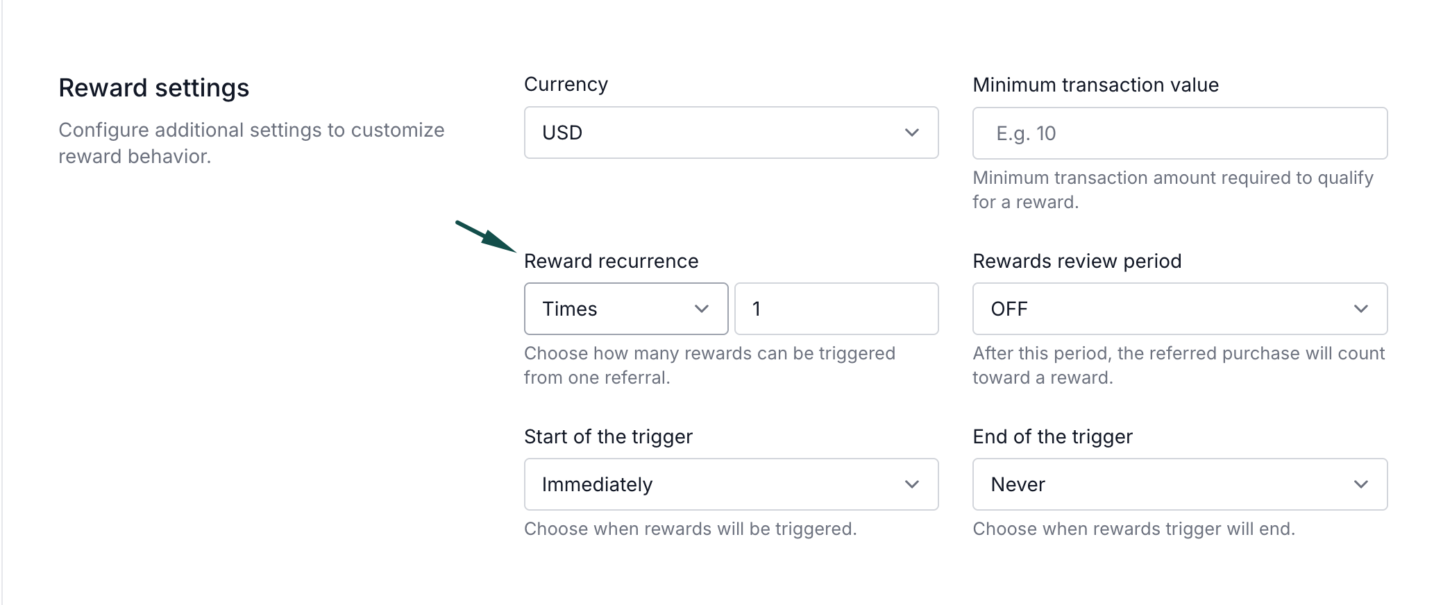 Reward recurrence: select how many rewards your customer receives from a single referral. For example: