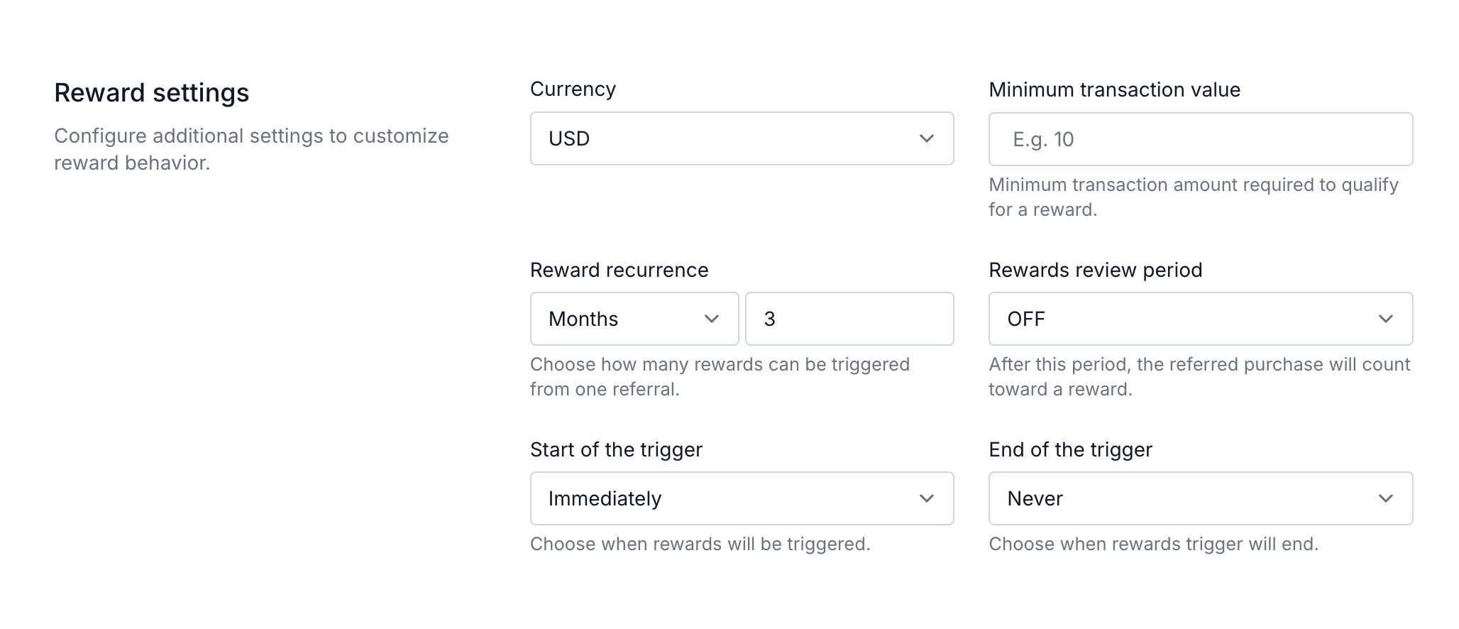 Rewards review period: set a specific time period to withhold the reward. This can be useful if you offer, e.g., a 14-day money-back guarantee and would like your customers to receive the reward after this period has passed.