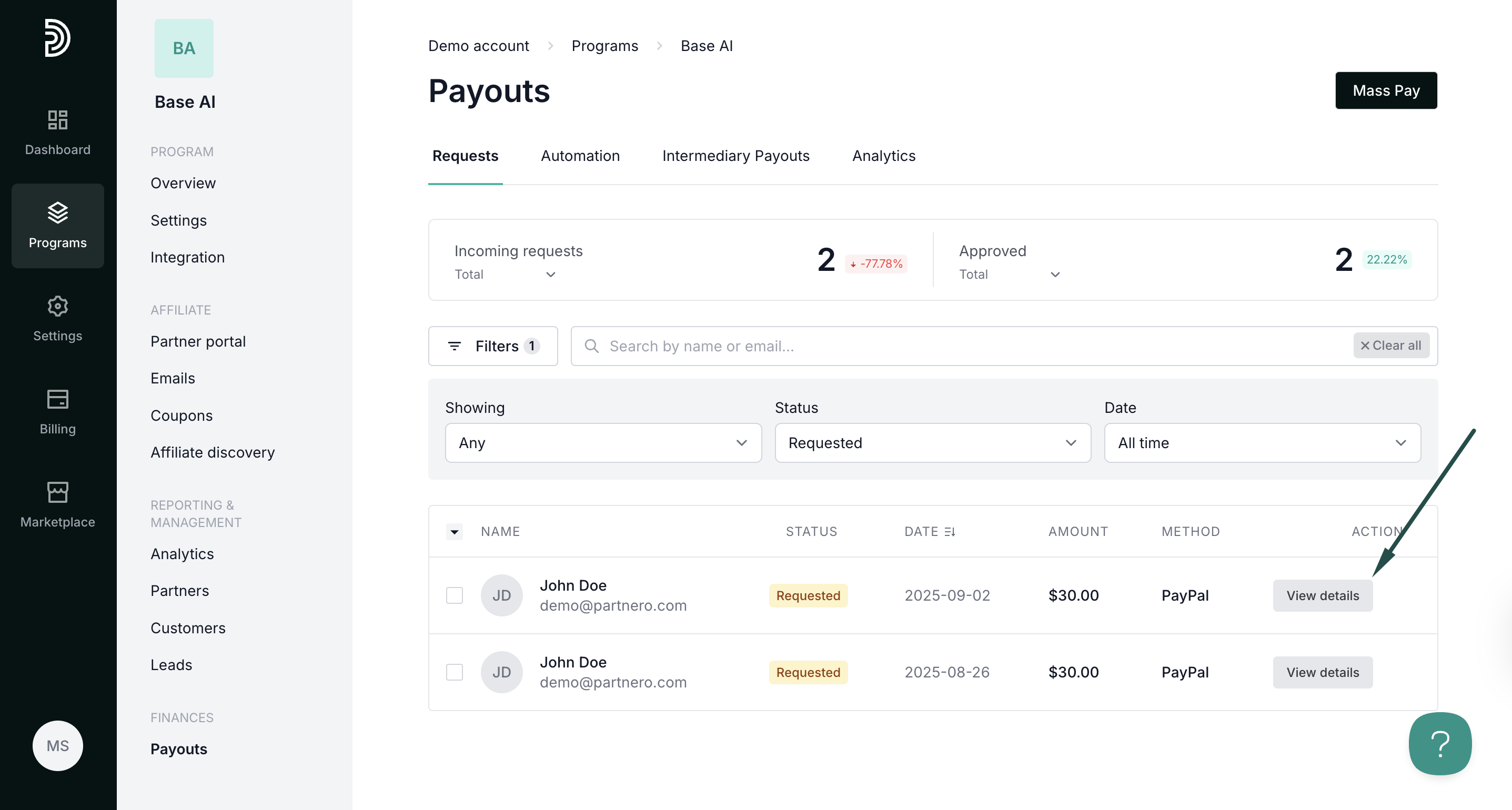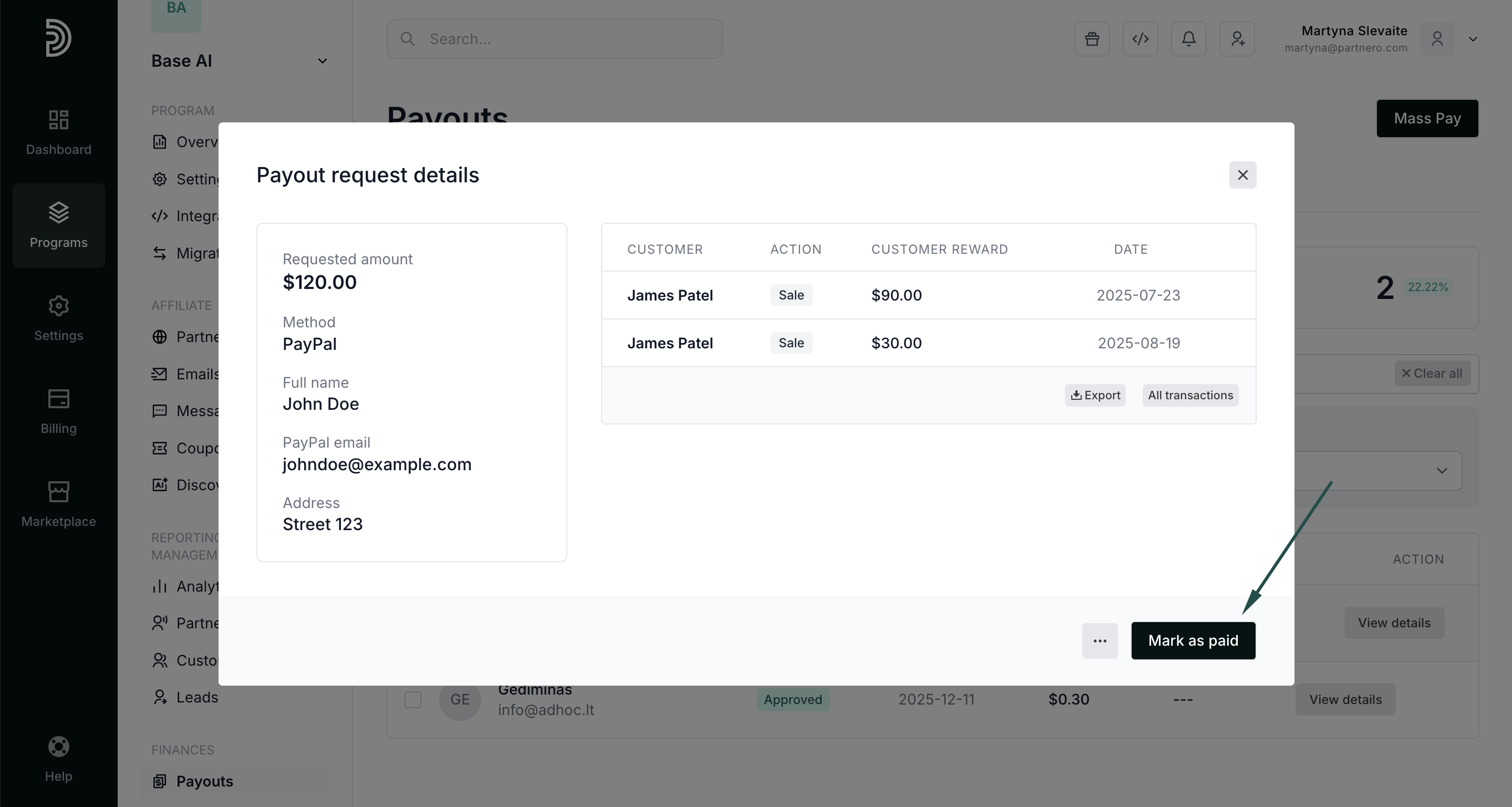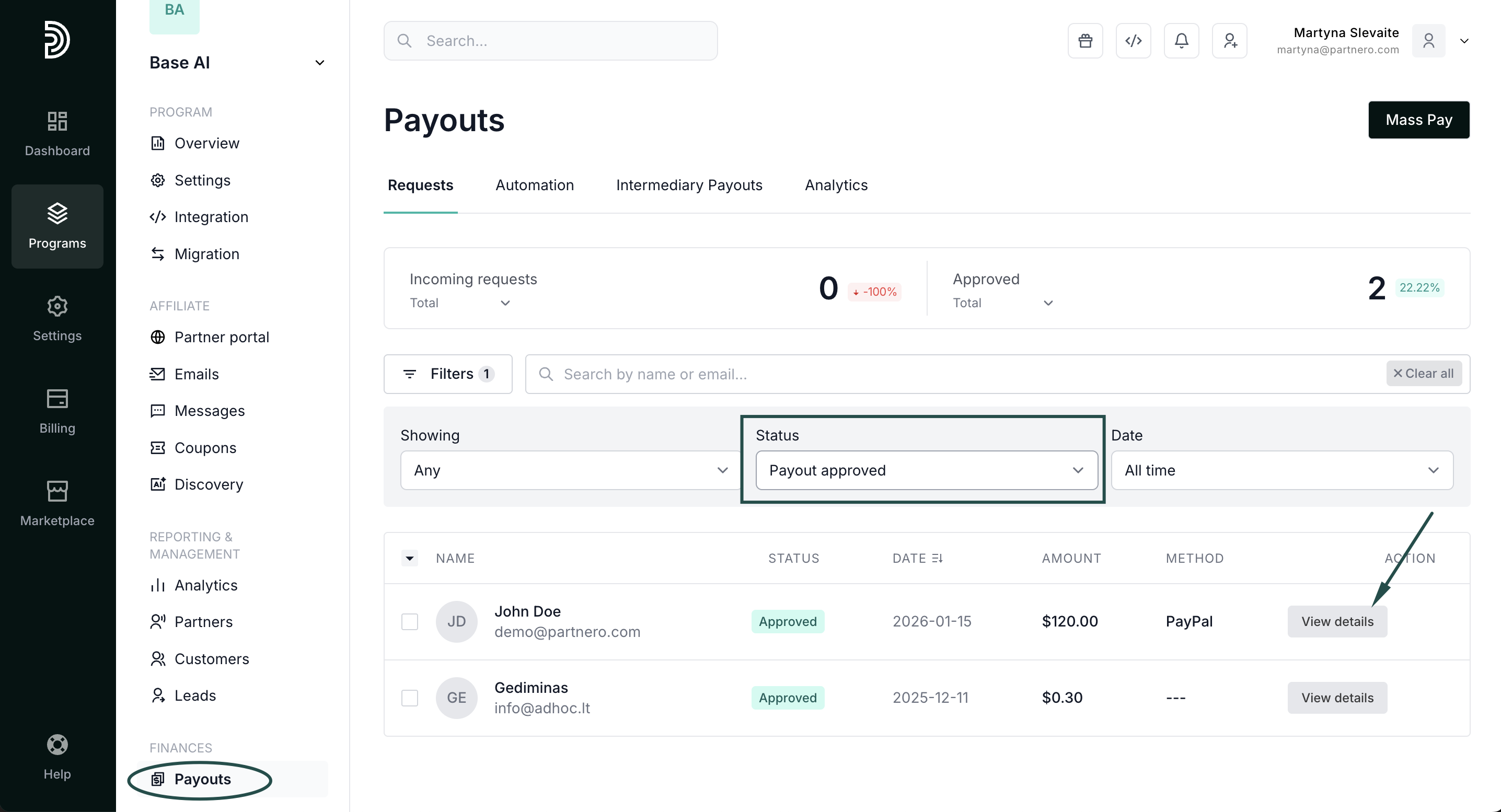 With Partnero, you can process payouts in bulk with PayPal or Wise. Additionally, you can automate payouts based on a set schedule or use the intermediary payouts feature. Read more: