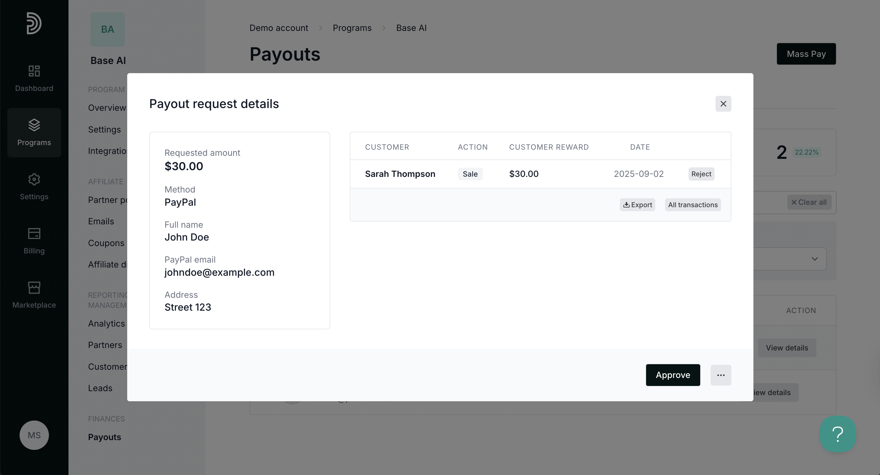 - Approve - payout request is accepted and can be paid out.