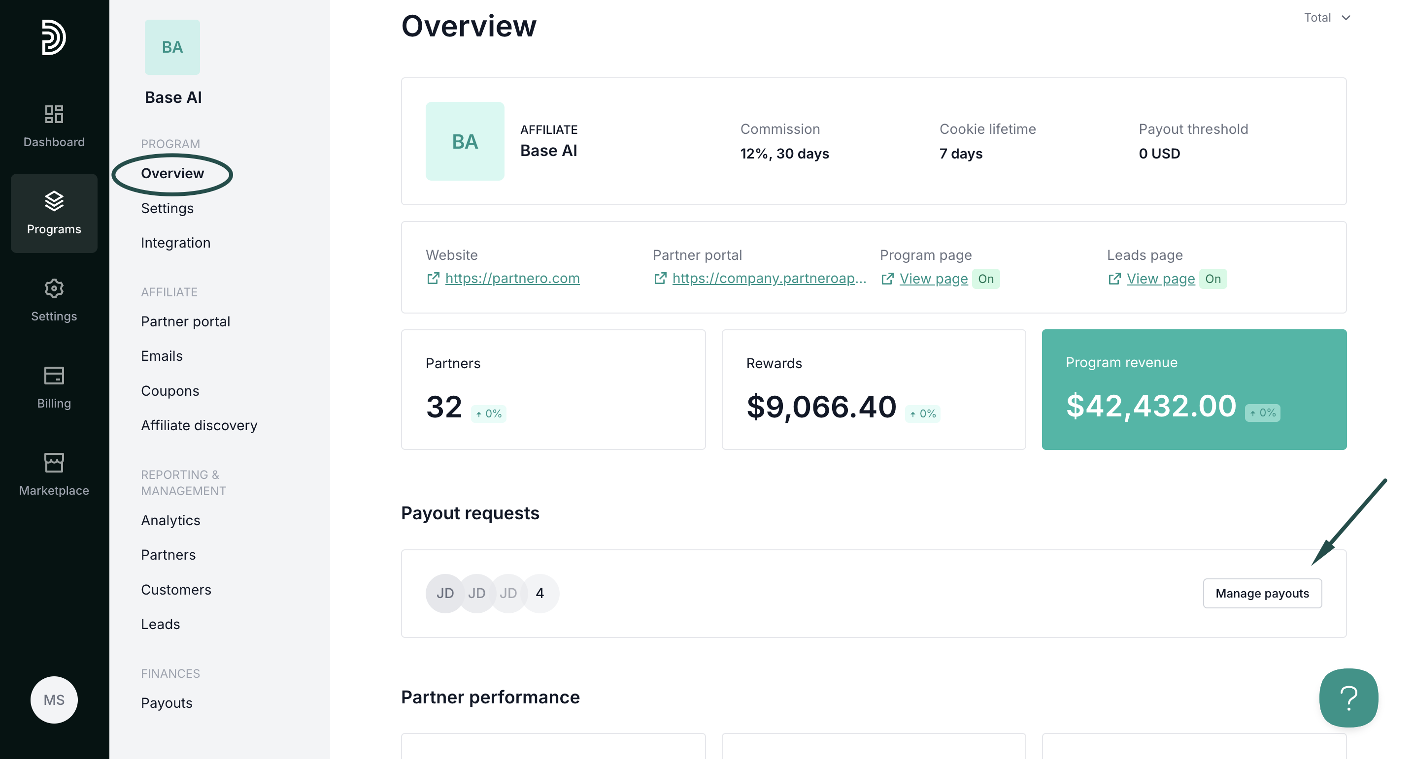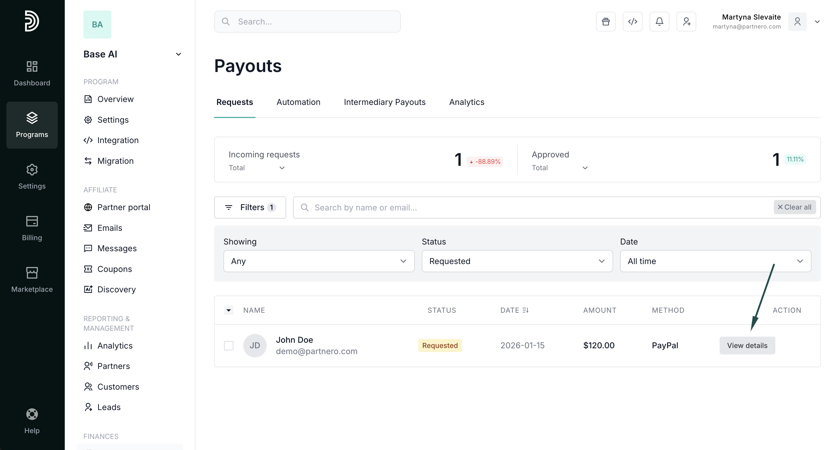 When your partners start earning commissions, they can request a payout once the payout threshold is reached.