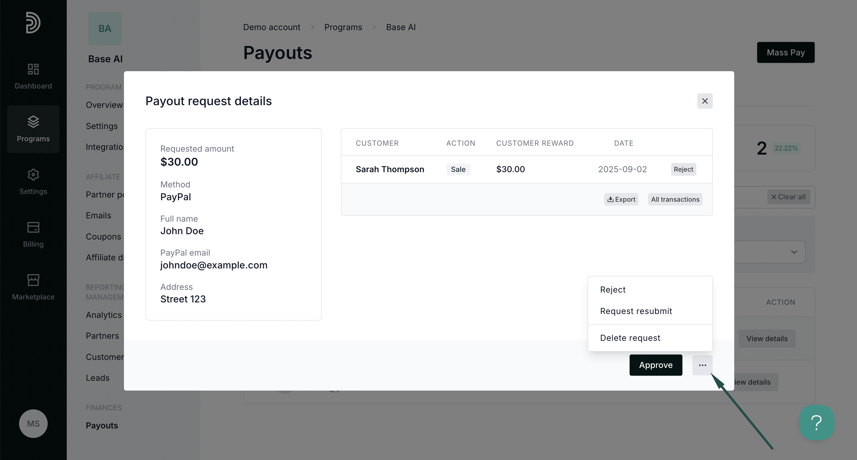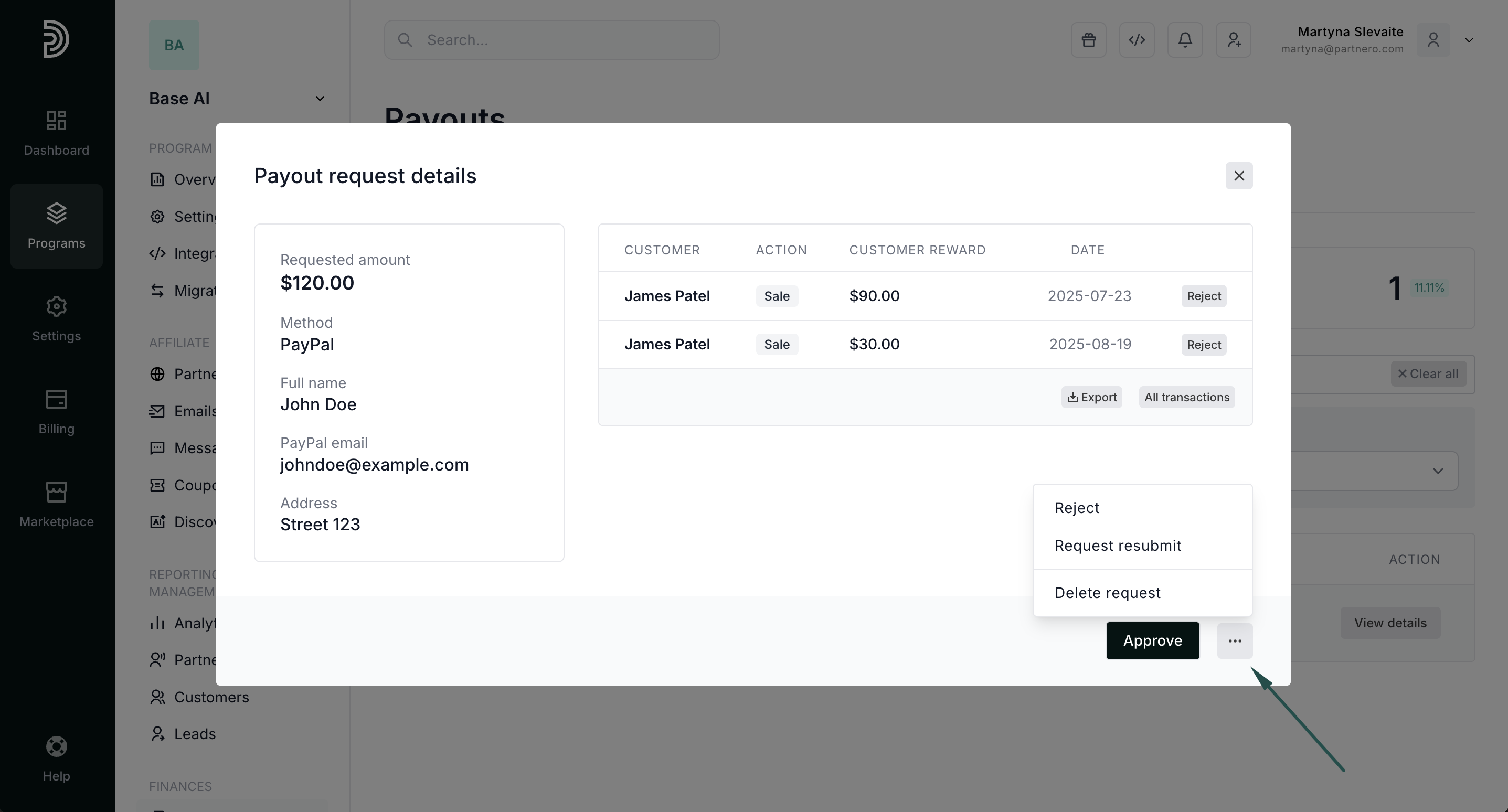 - Reject - payout request is permanently rejected, the partner will not be able to request the same commission to be paid out again.