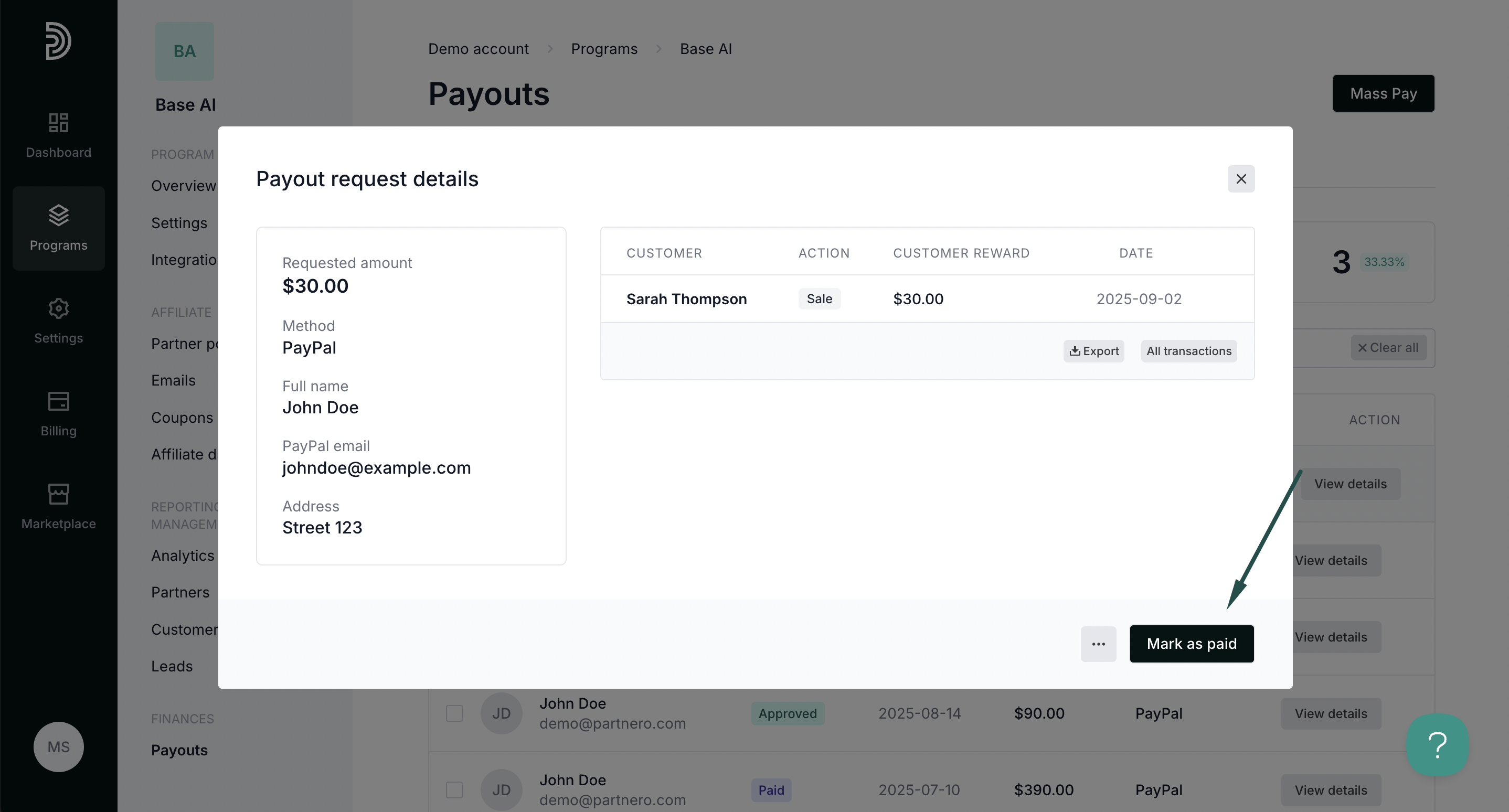 Once the payout request has been approved and you’ve processed the payment, you will be able to mark the payout as paid: