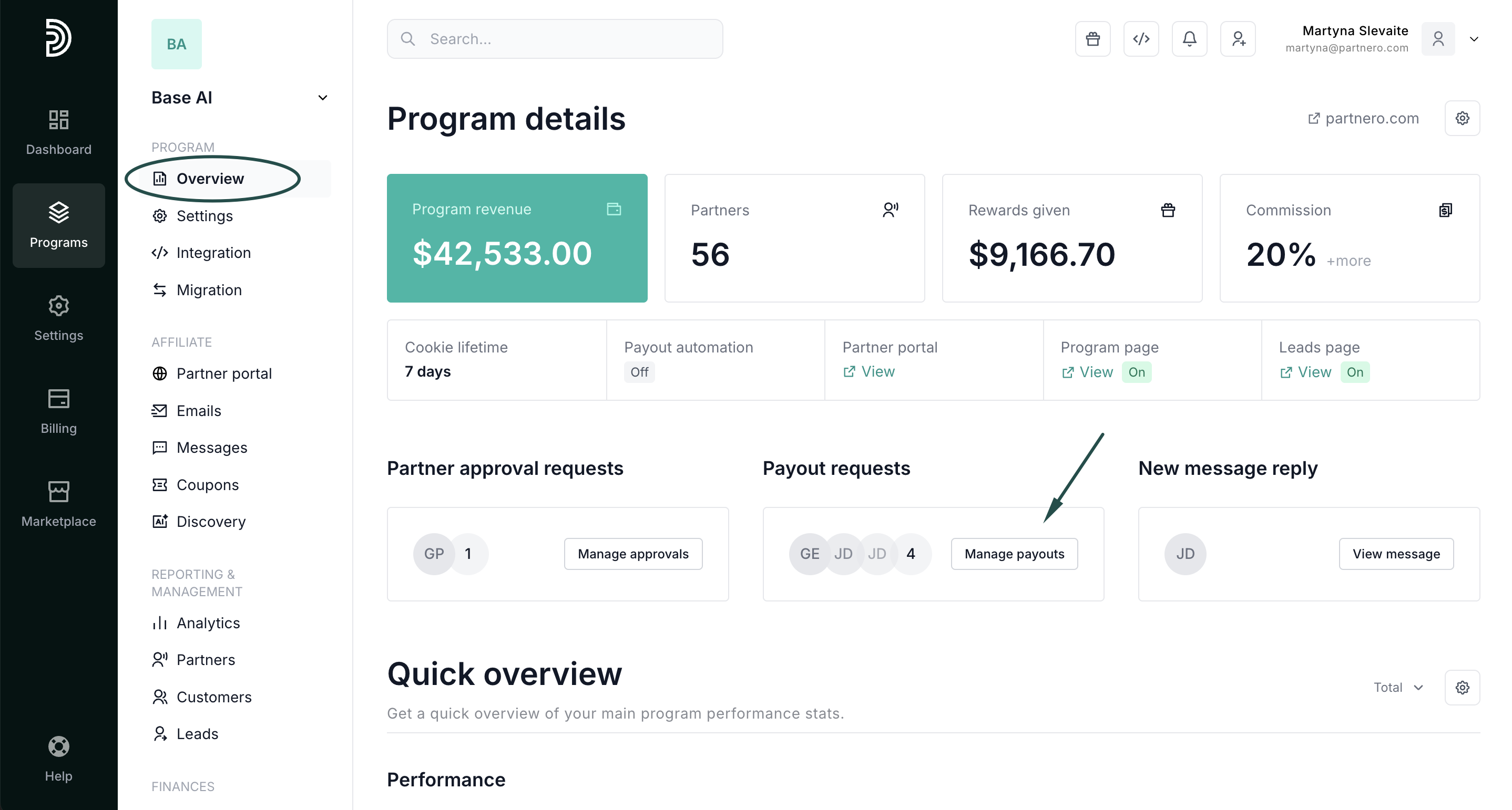 Partners can submit payout requests when they reach the minimum payout threshold you’ve defined. This article explains how to review those requests, approve or reject them, and mark payouts as paid when you’ve completed payment outside of Partnero.