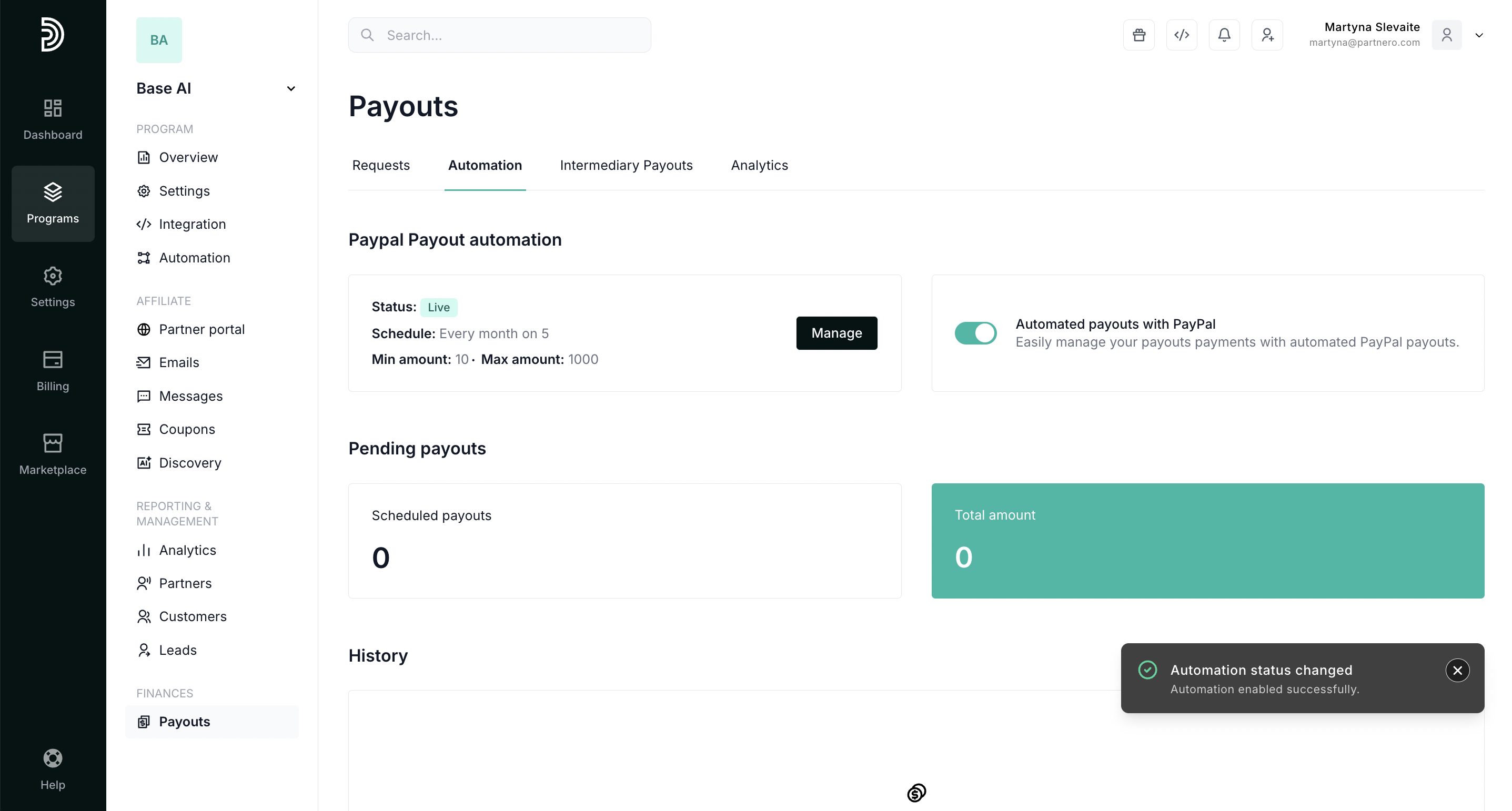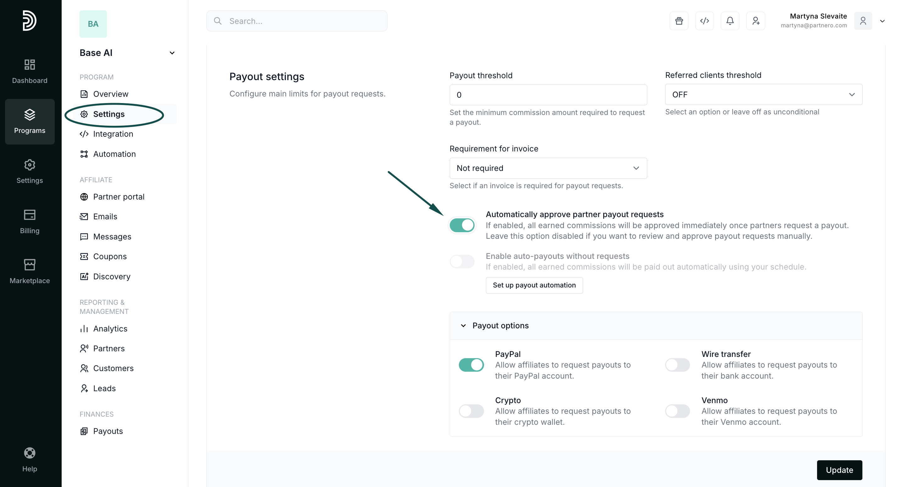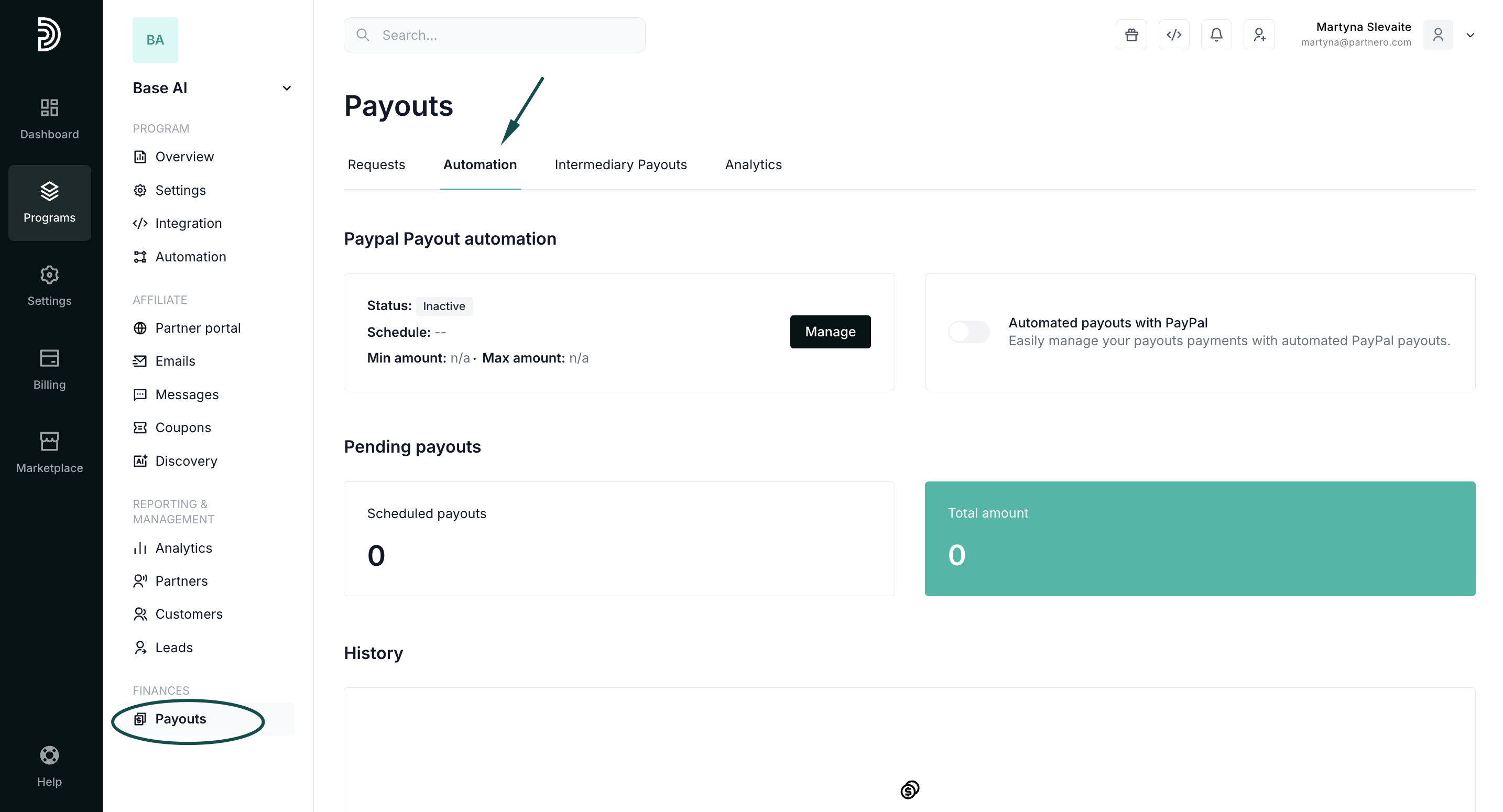 If your program is set to automatically approve payout requests (under Settings → Payout settings), all requested payouts will be processed according to the configured schedule.
