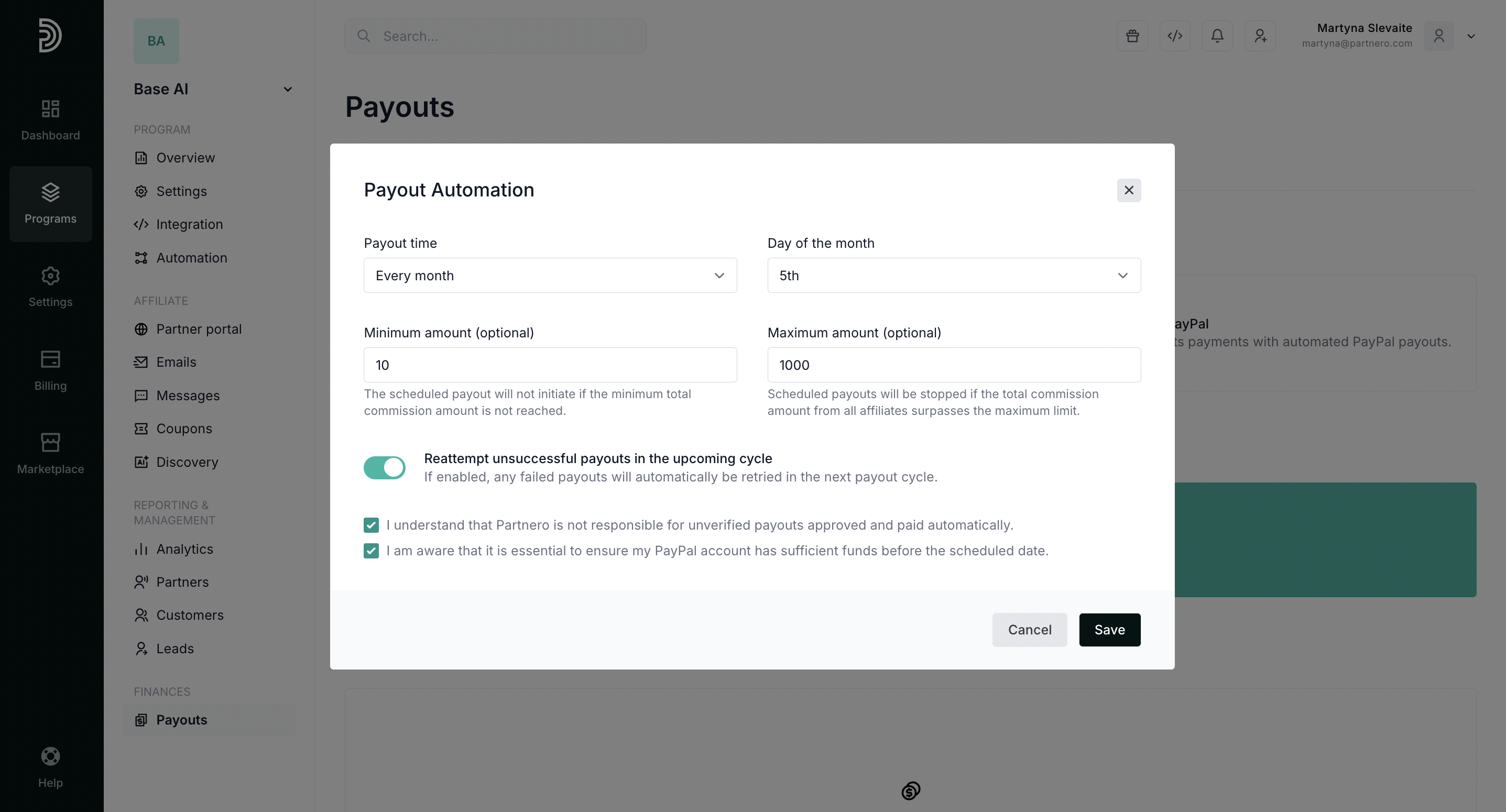 Additionally, select if you'd like us to re-attempt unsuccessful payouts in the upcoming cycle. - Click Save.