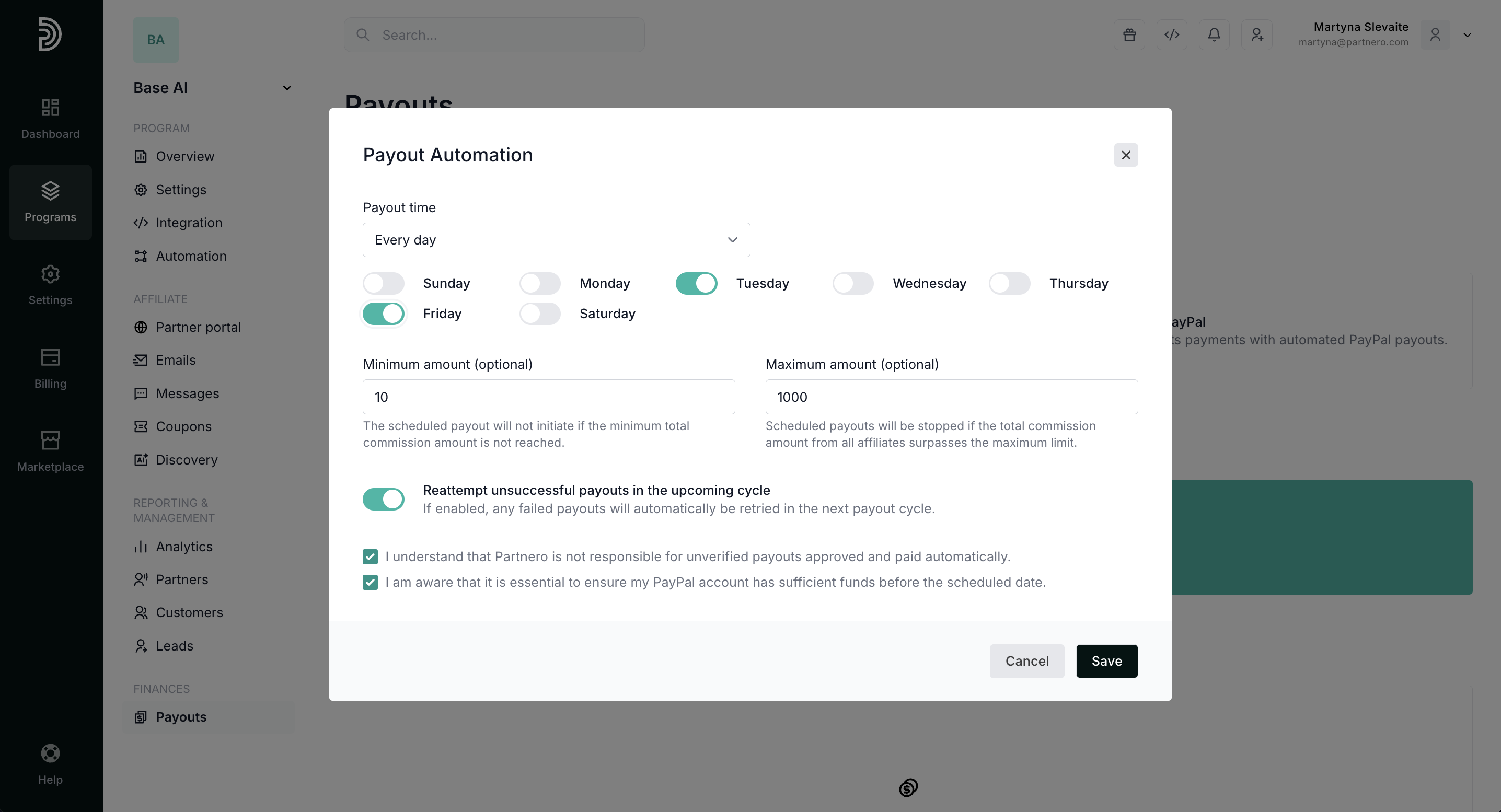 - Optional: You can also enter the minimum and maximum amounts you're comfortable paying automatically. Scheduled payouts will be stopped if the total commission exceeds the set maximum.