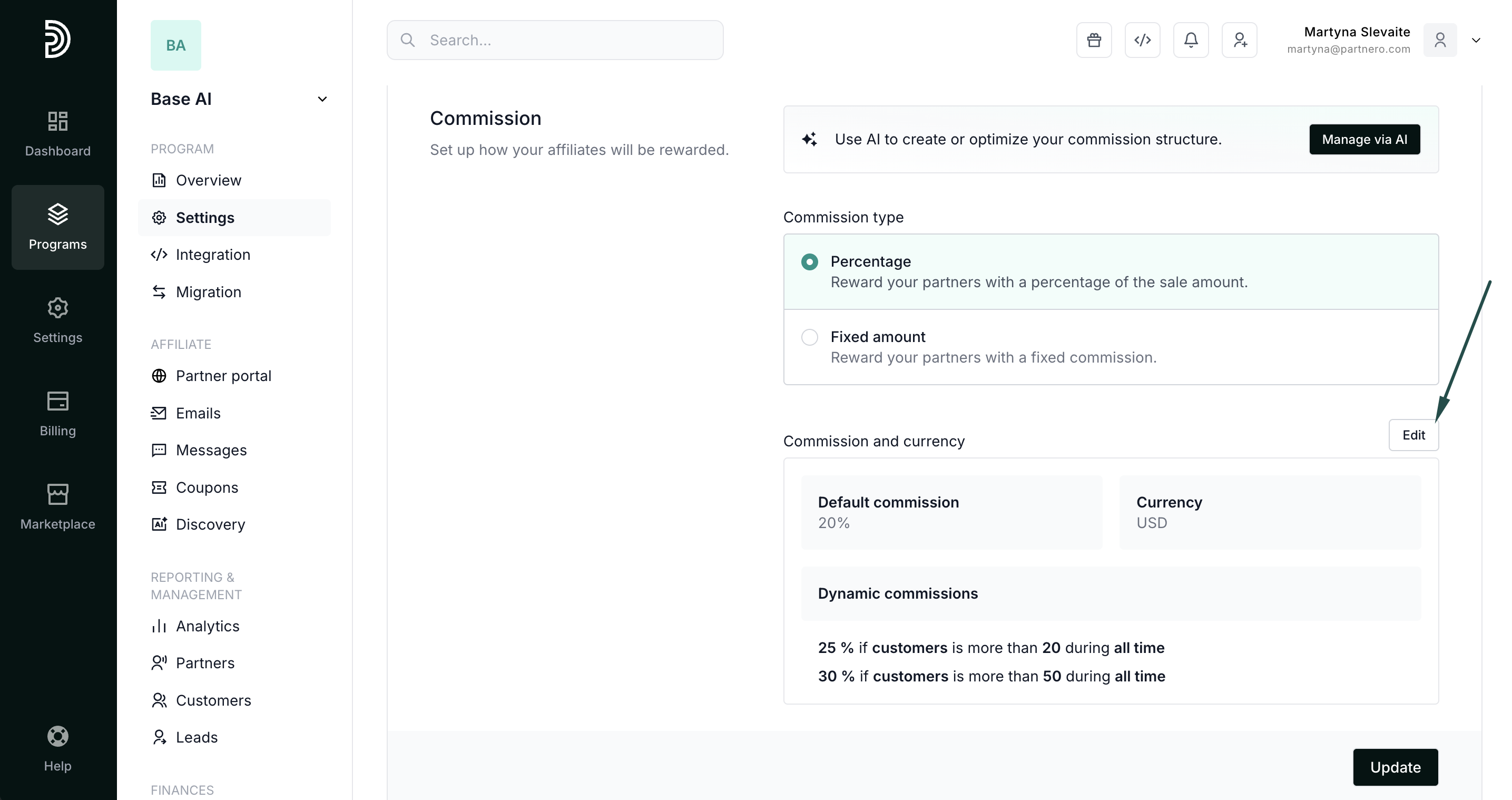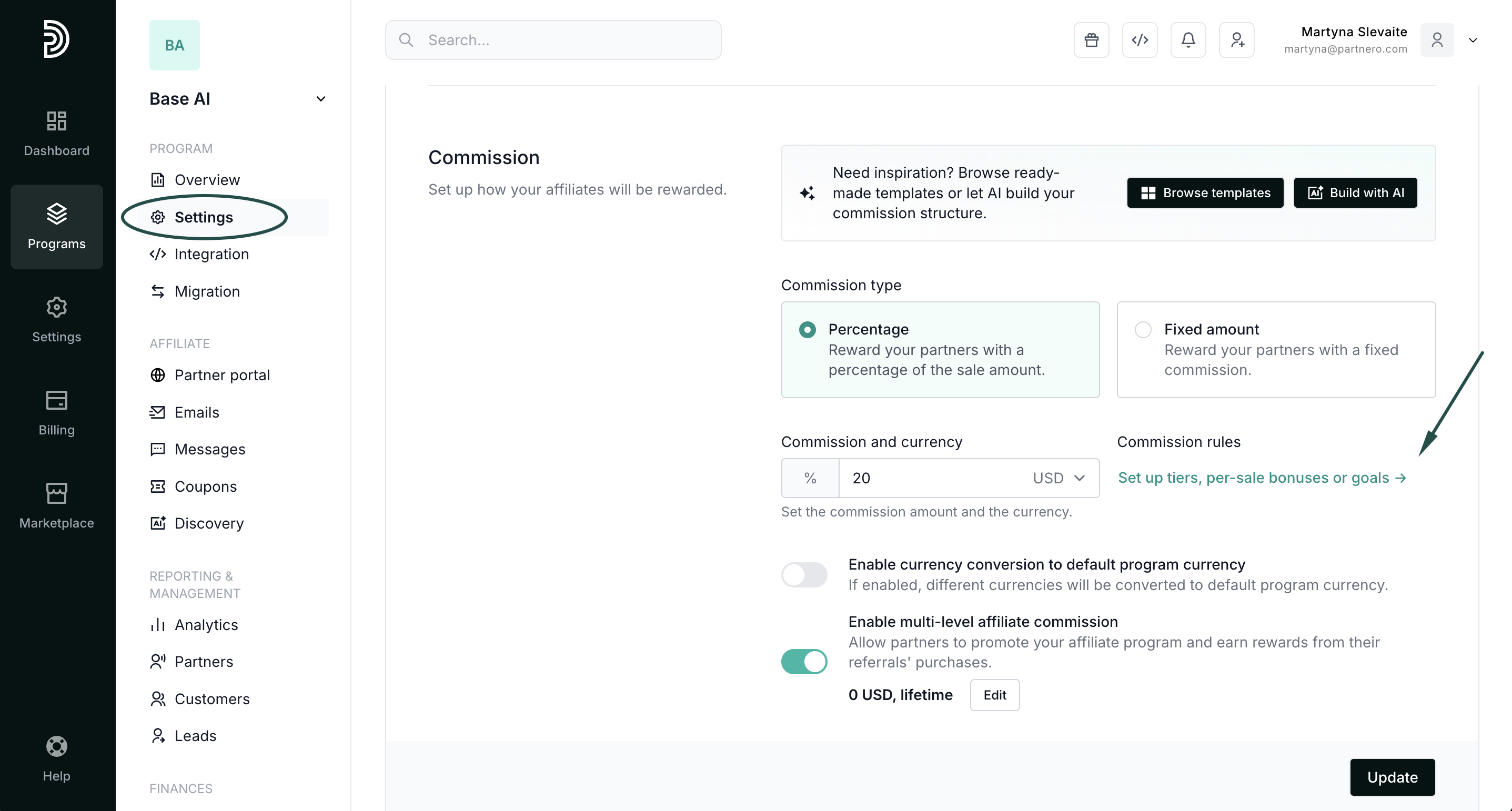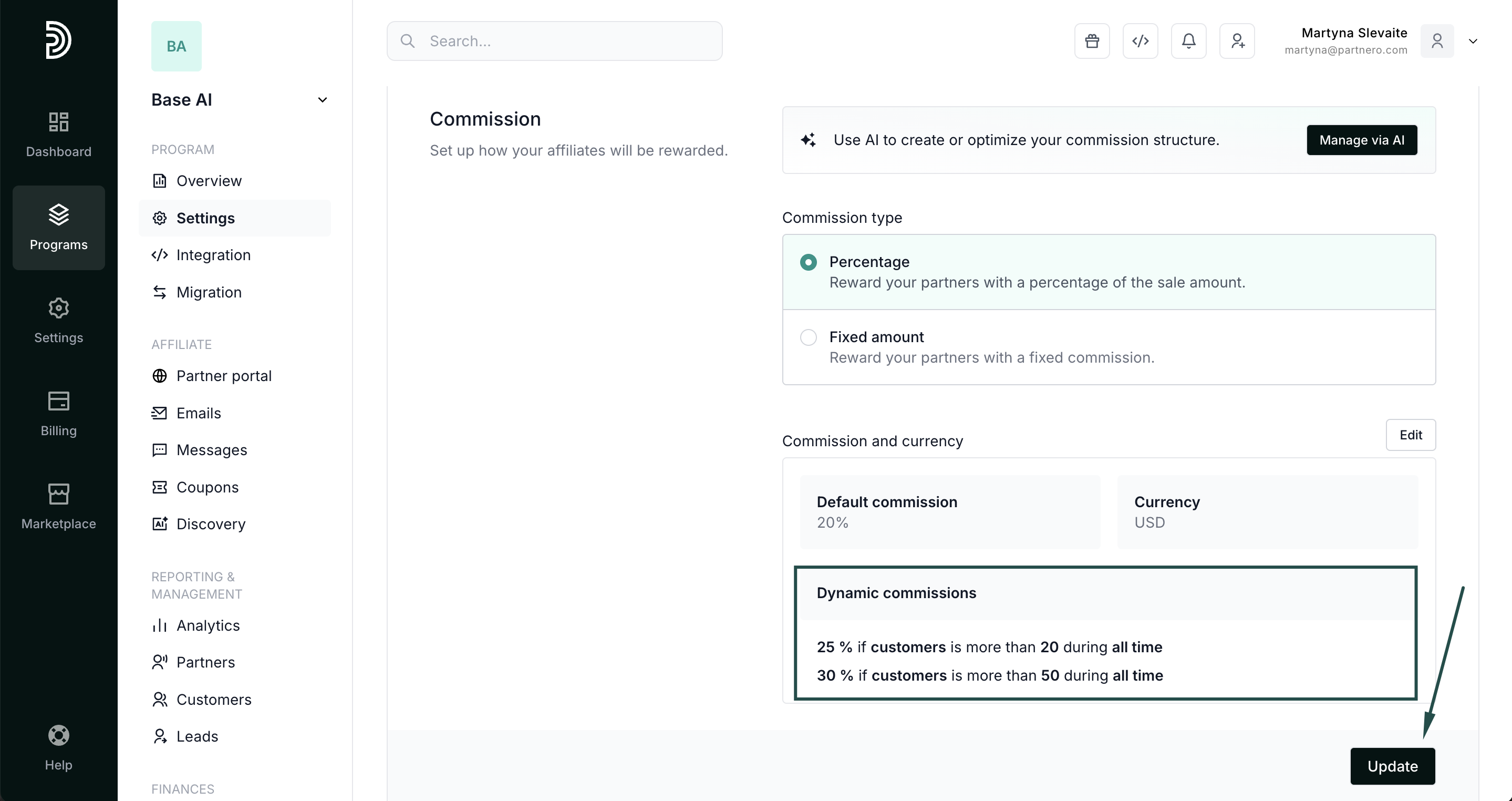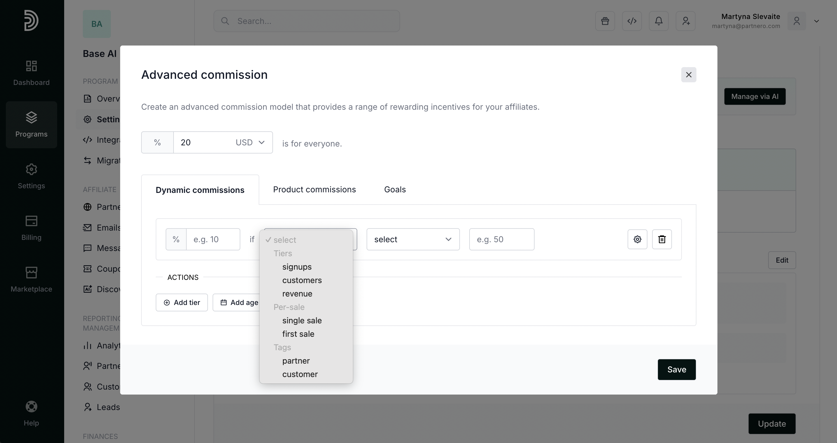 Dynamic commissions offer different incentives based on the affiliate partner's performance, partner or customer tags, and other variables, and are a great way to keep your partners motivated and engaged. For example, you can offer a higher commission rate to partners who have generated more than X sales or have brought in a certain amount of revenue.