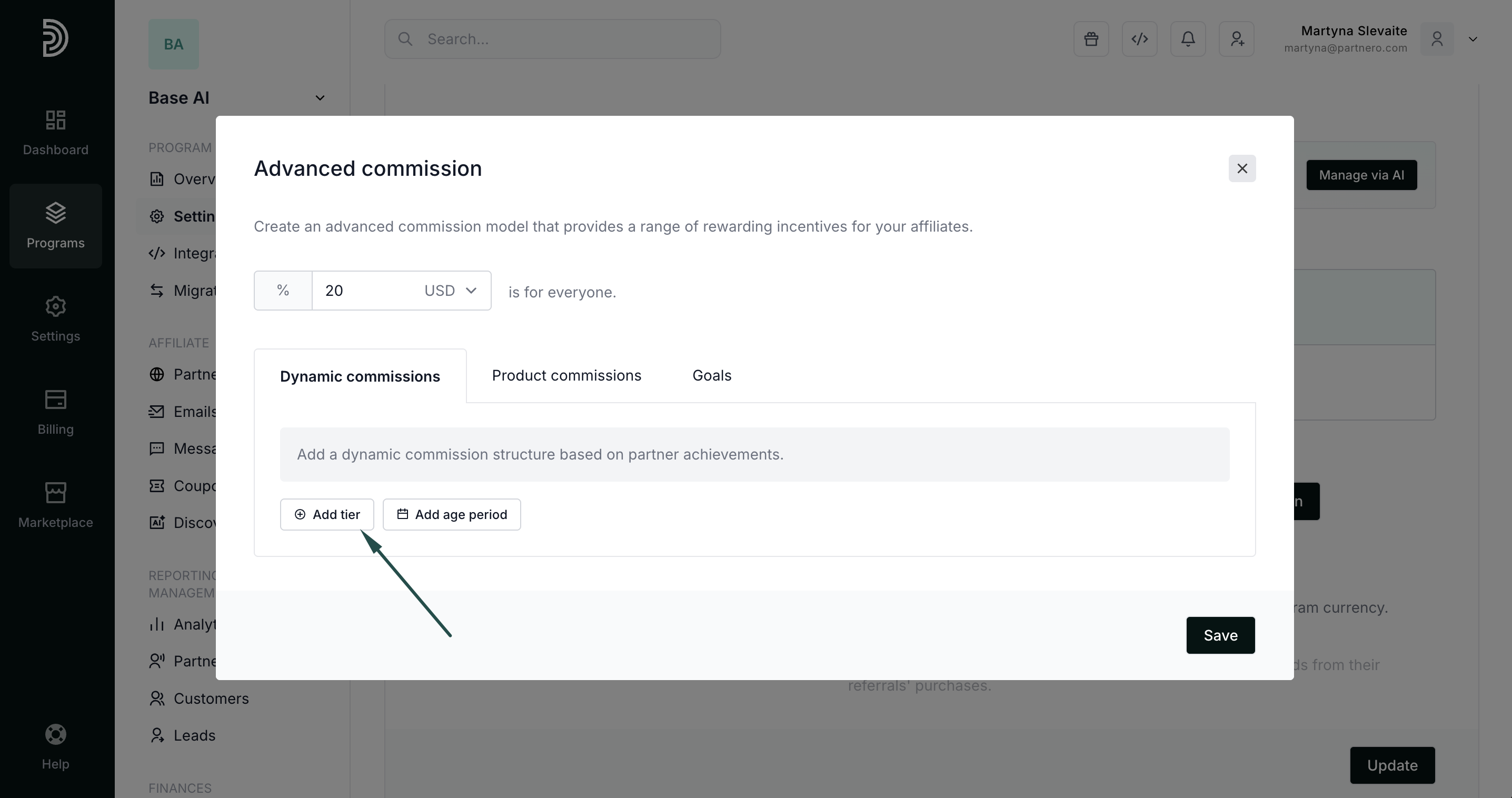 - In the modal, under the Dynamic commissions tab, click +Add tier: