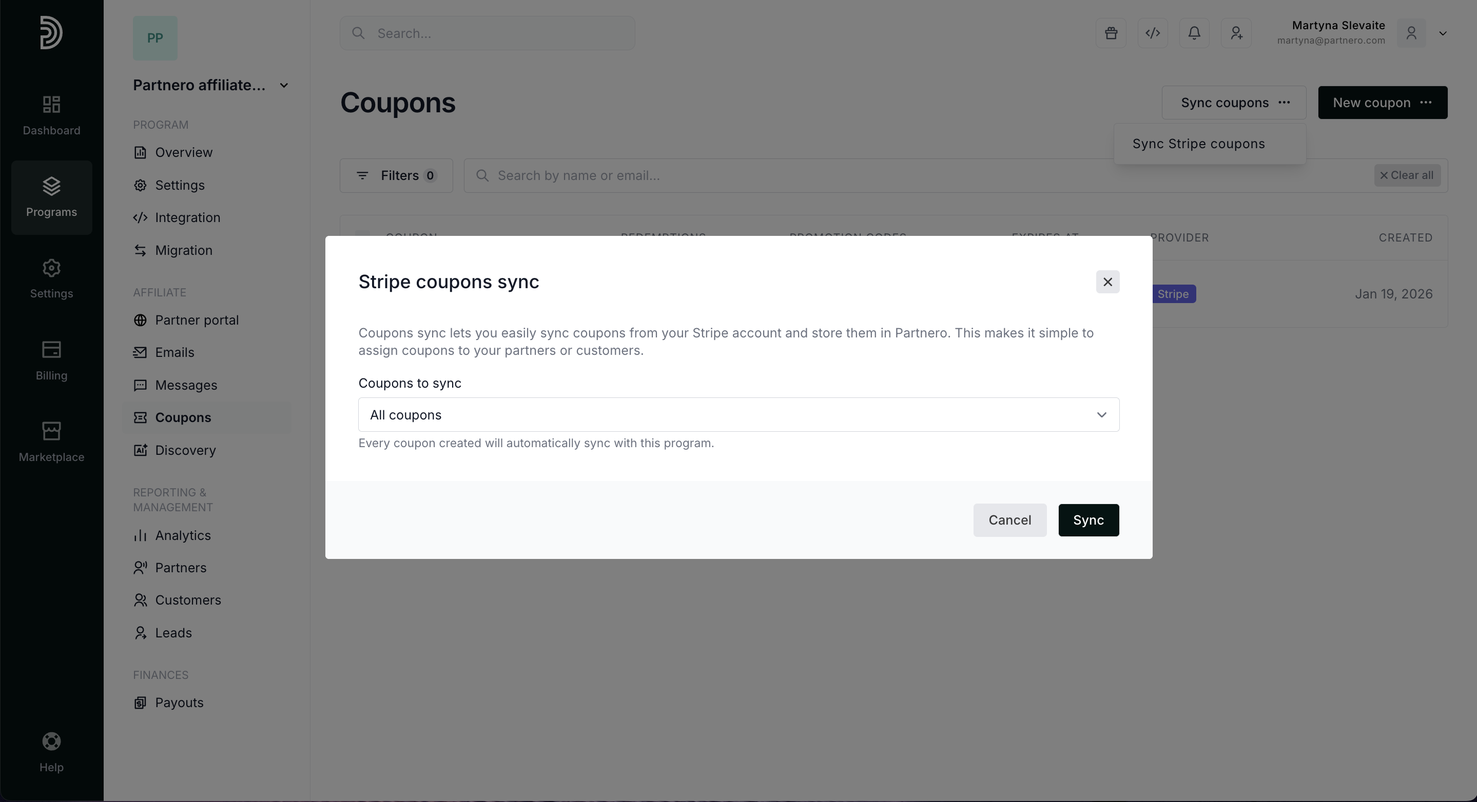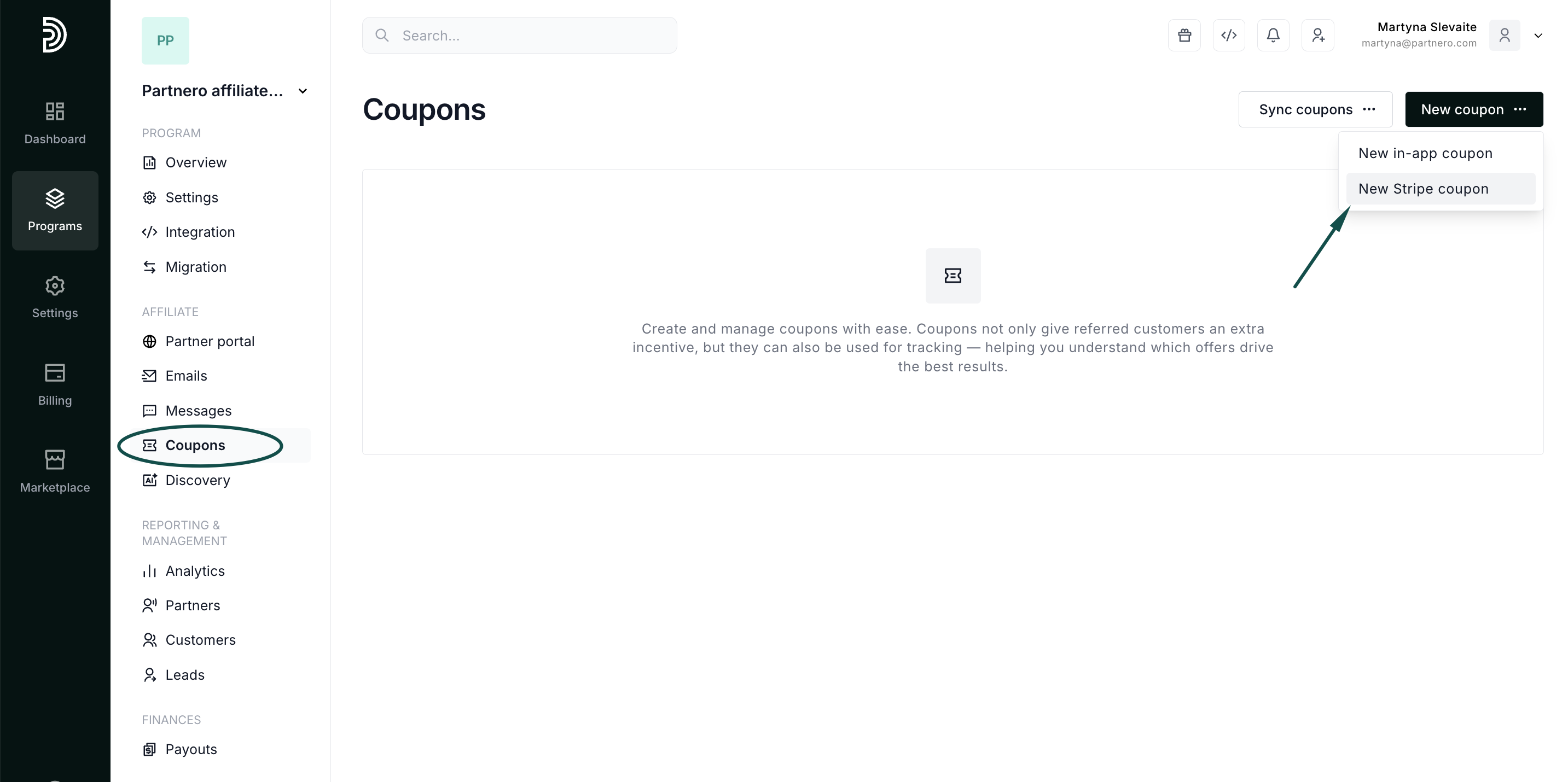 If you already have coupons on Stripe, you can sync them with Partnero: