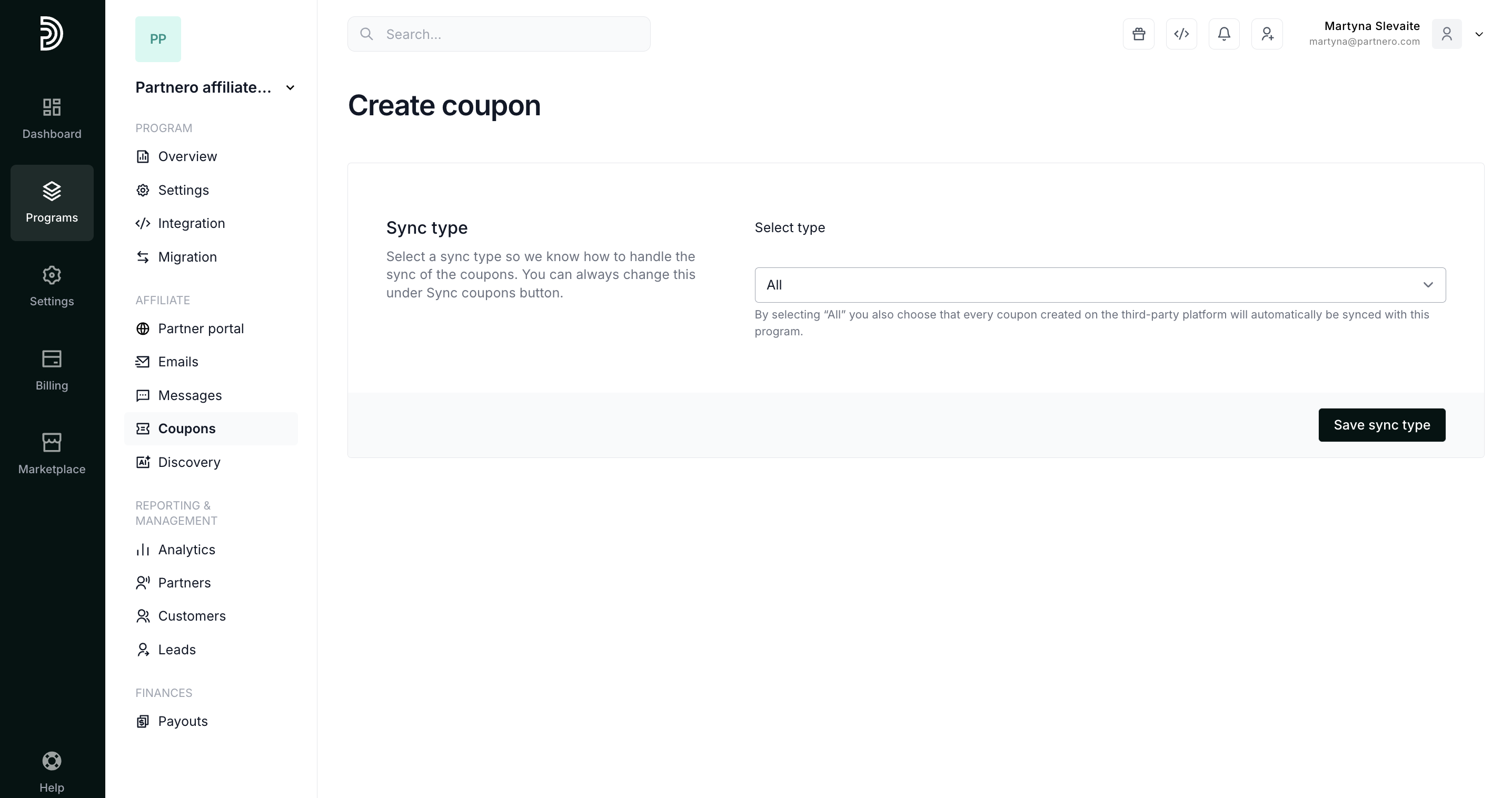 This option lets you create new coupon codes on Stripe and sync them with your Partnero account.