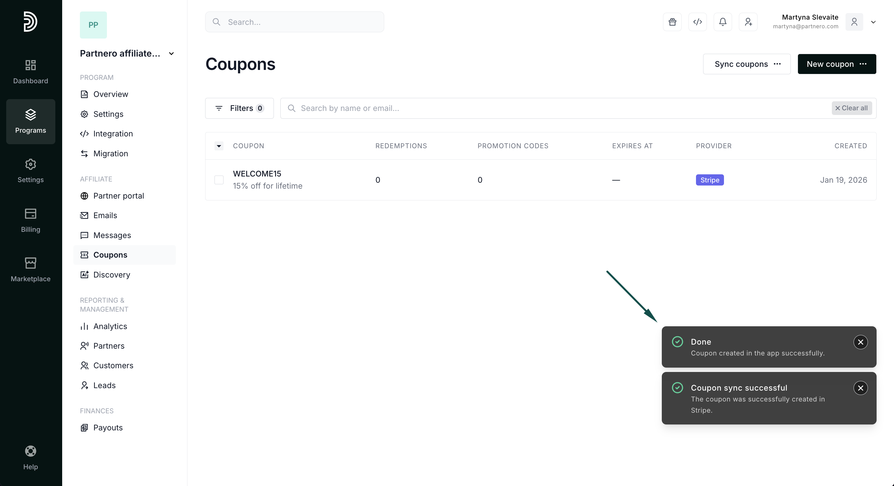 You will see a notification that the coupon was successfully created in Partnero and Stripe: