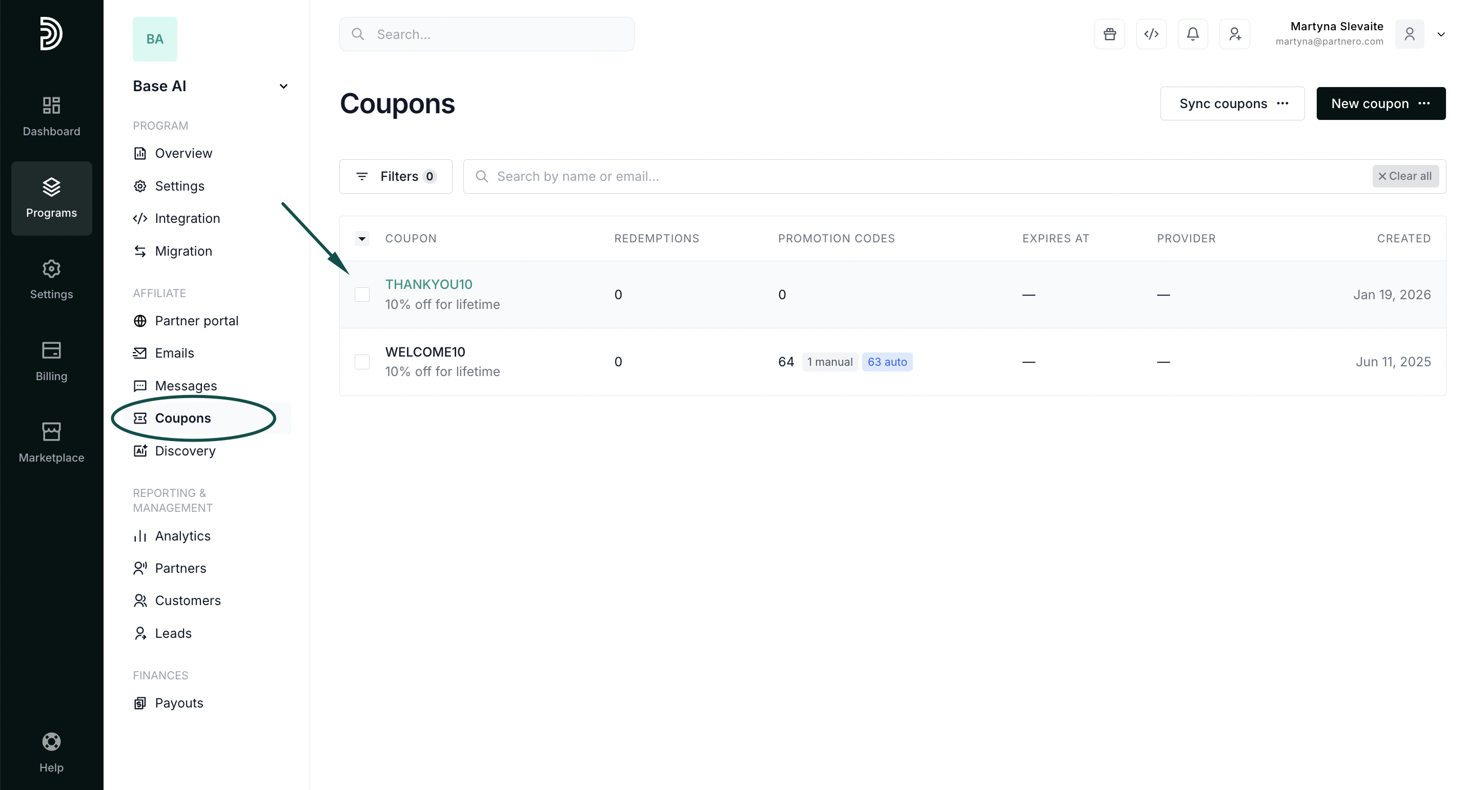 Note: For us to track the coupon code, it has to be assigned to a specific partner.