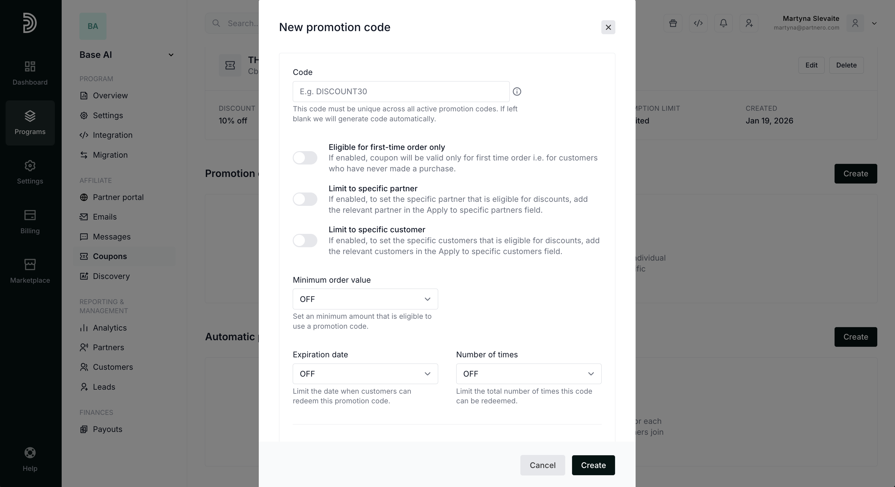 Code: You can enter a unique code name. E.g., if you're planning to share this promotion code with a specific partner, you can use their name (JOHN10). If you leave this field blank, we will generate a random name for you.