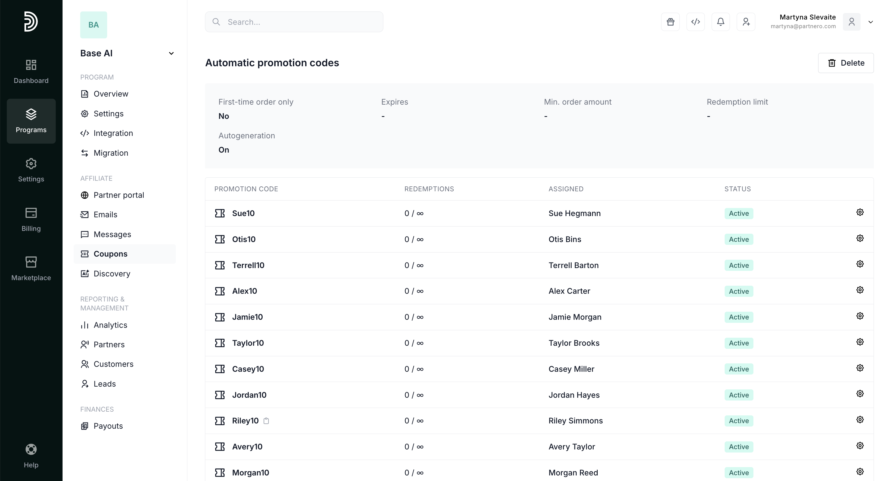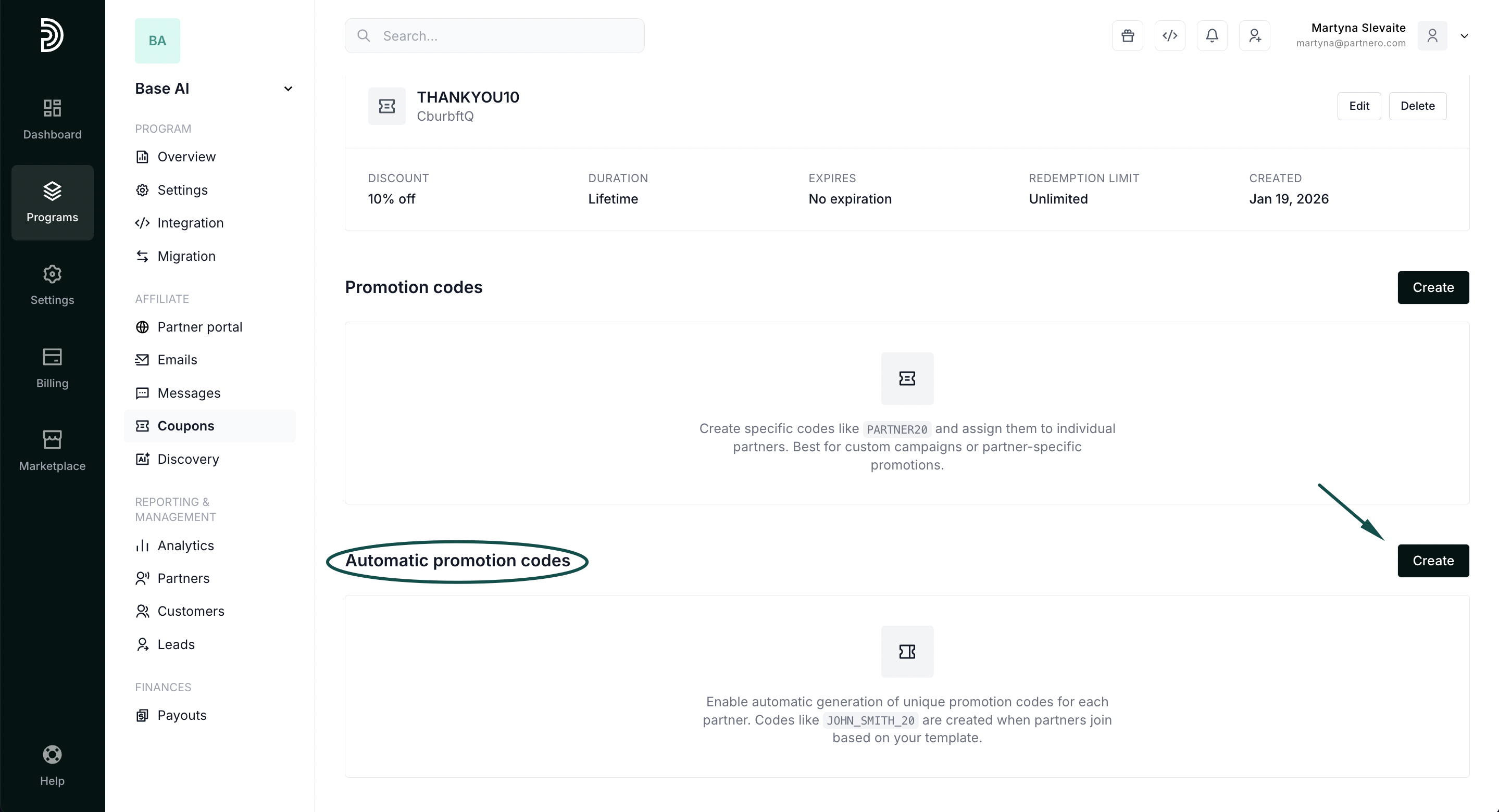 Auto-generated promotion codes allow automatically creating promotion codes for all new affiliate partners who join your program. Promotion codes will be automatically assigned to existing partners, and newly registered partners will receive one upon completing registration.