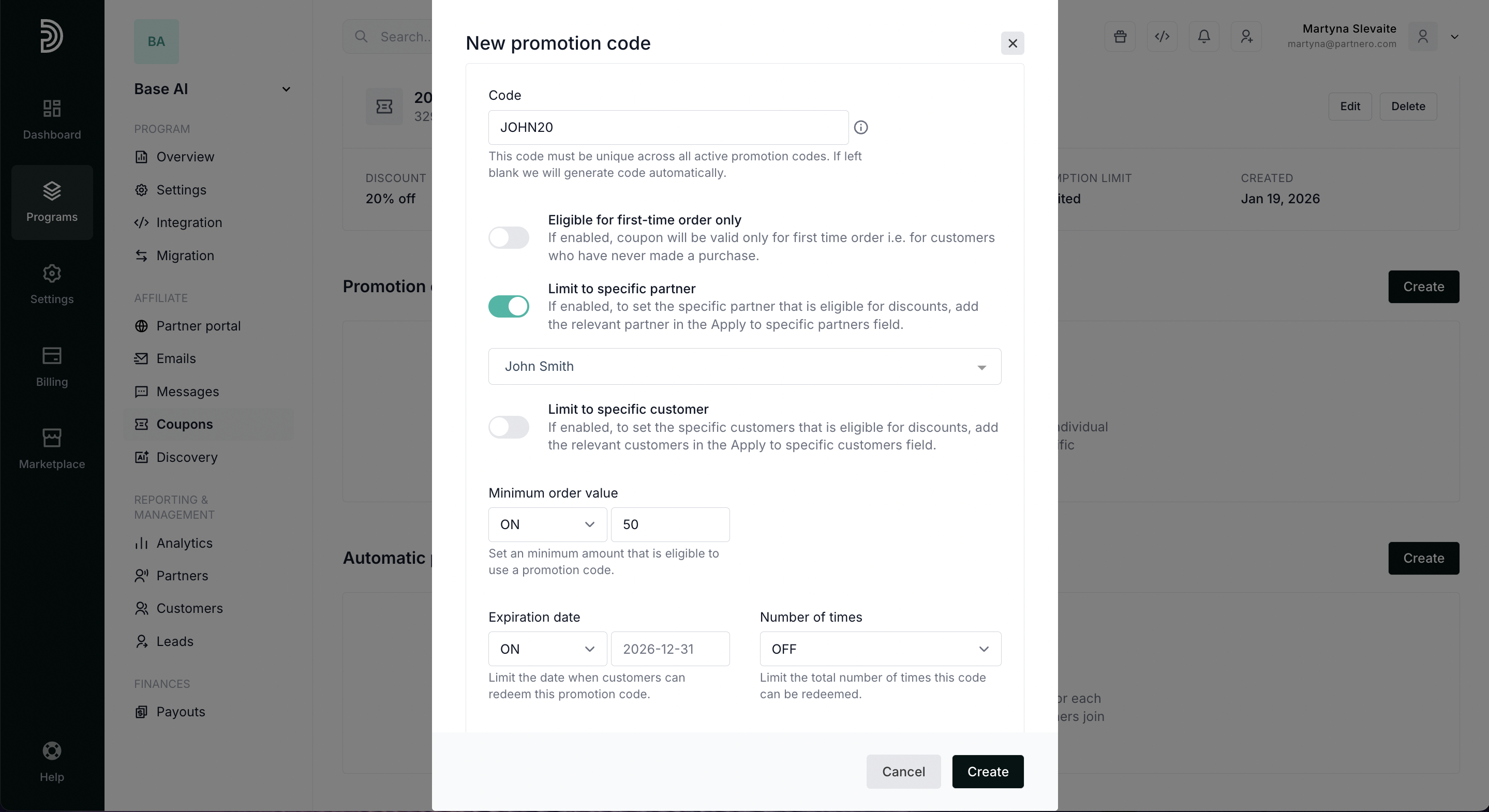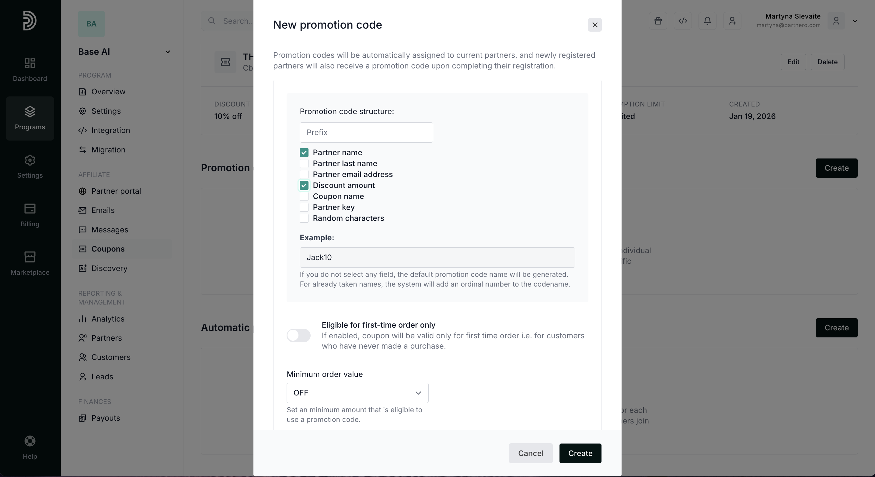 - In the presented modal, you can customize how the promotion code appears. You can either manually enter a prefix, or choose the promotion code to be generated with partner details (for example, their name and the discount):