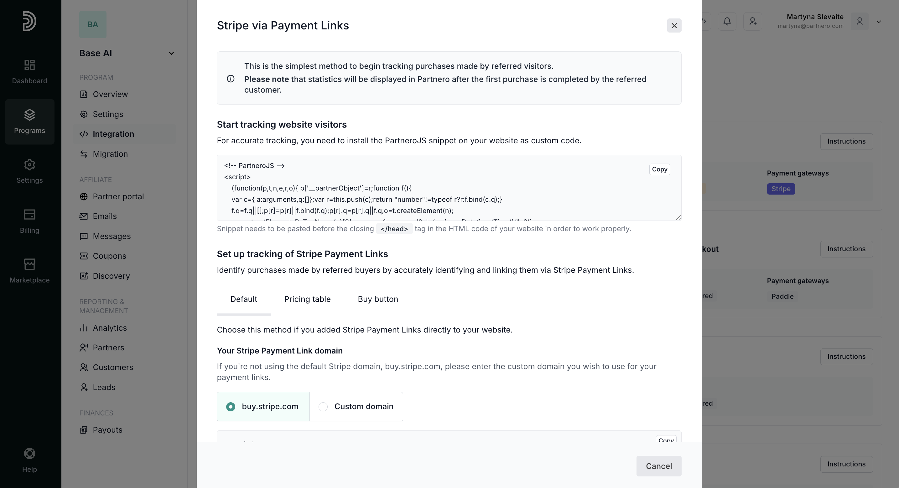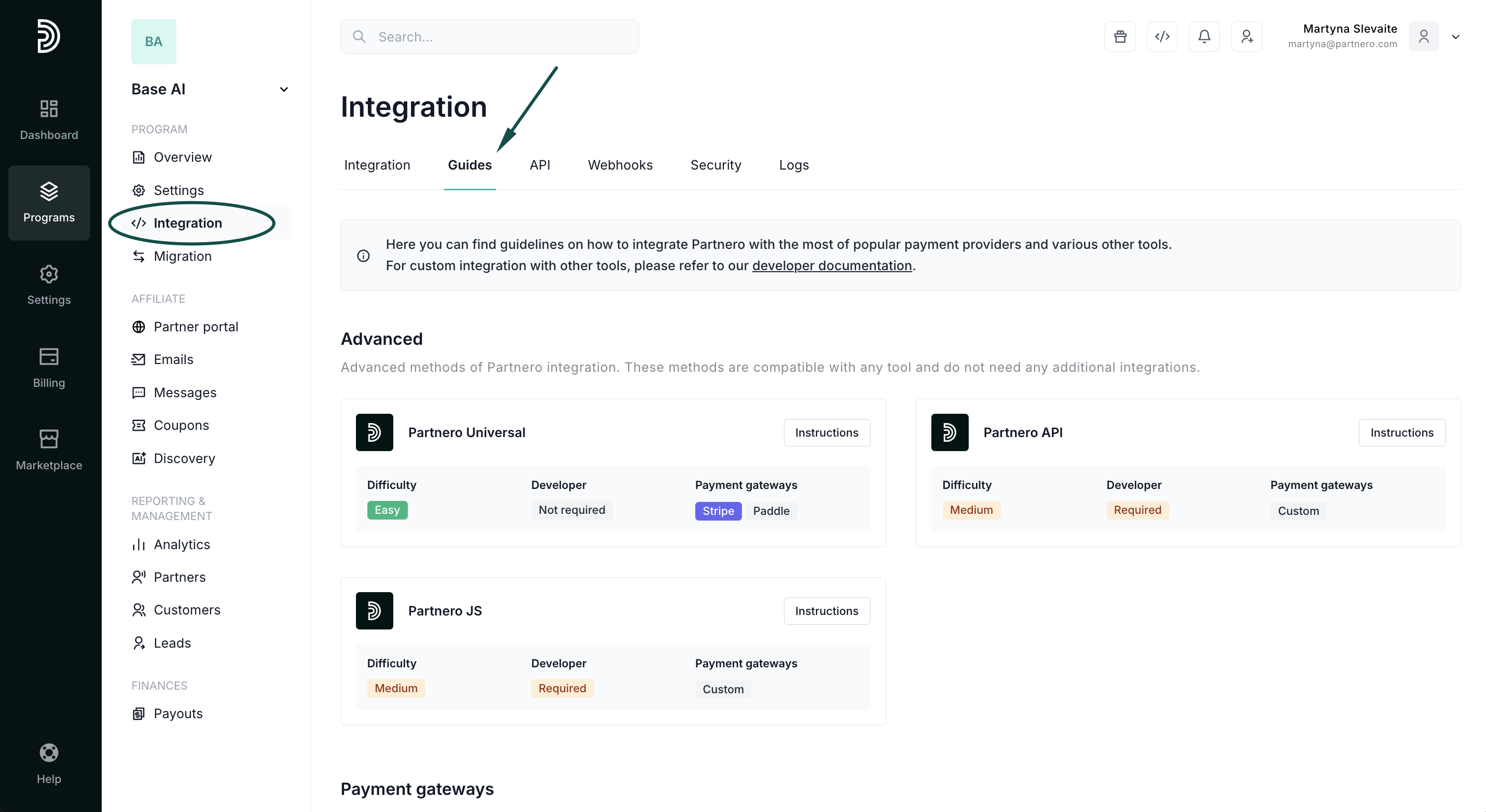Integration guides are step-by-step instructions that help you connect Partnero with your website, e-commerce platform, payment gateway, or other systems. These guides provide ready-to-use setup steps and code snippets tailored to specific tools, so you can start tracking referrals, sign-ups, and transactions with minimal development effort. Using integration guides can simplify implementation, ensure accurate tracking, and reduce setup time by providing a clear path for connecting Partnero to the tools you already use