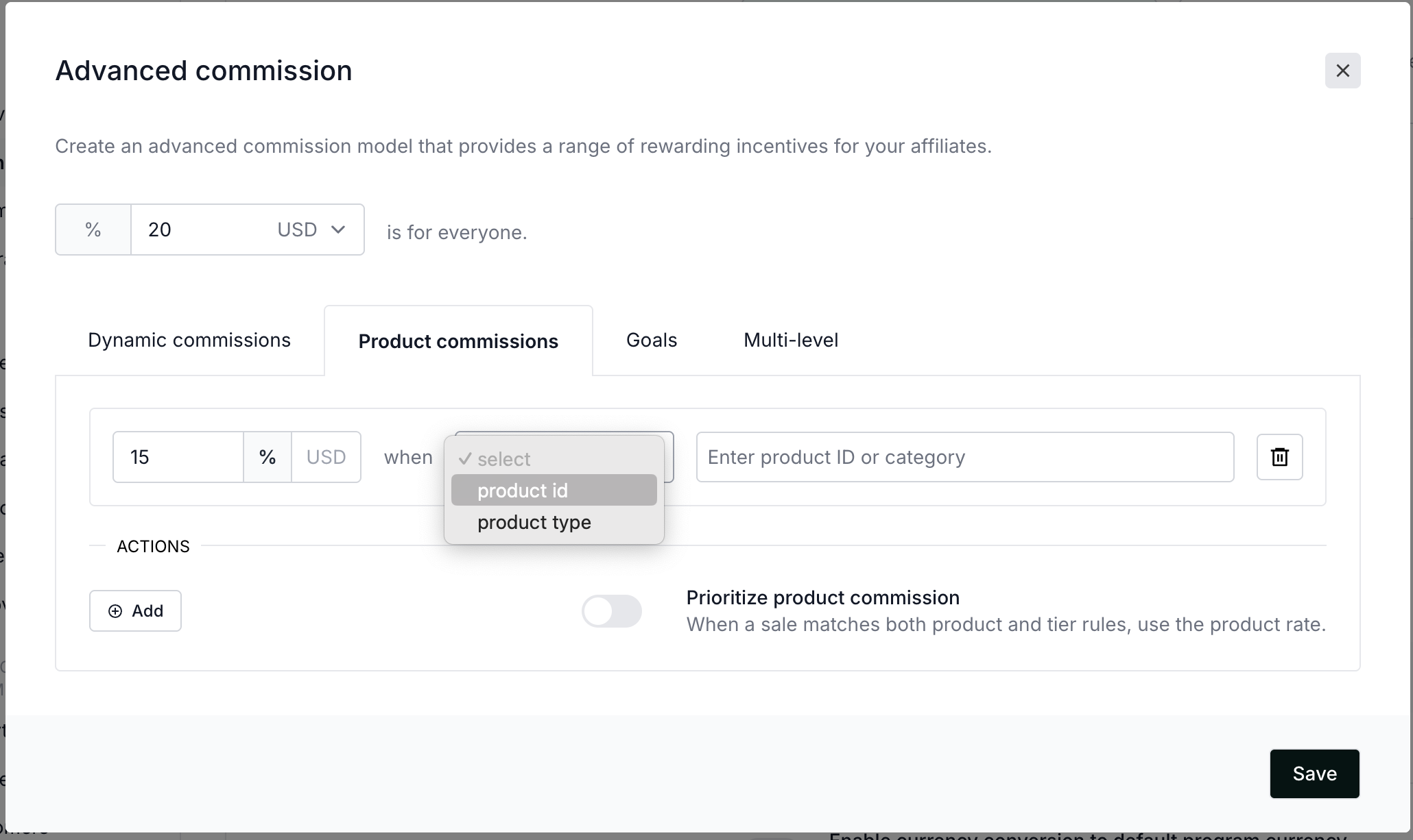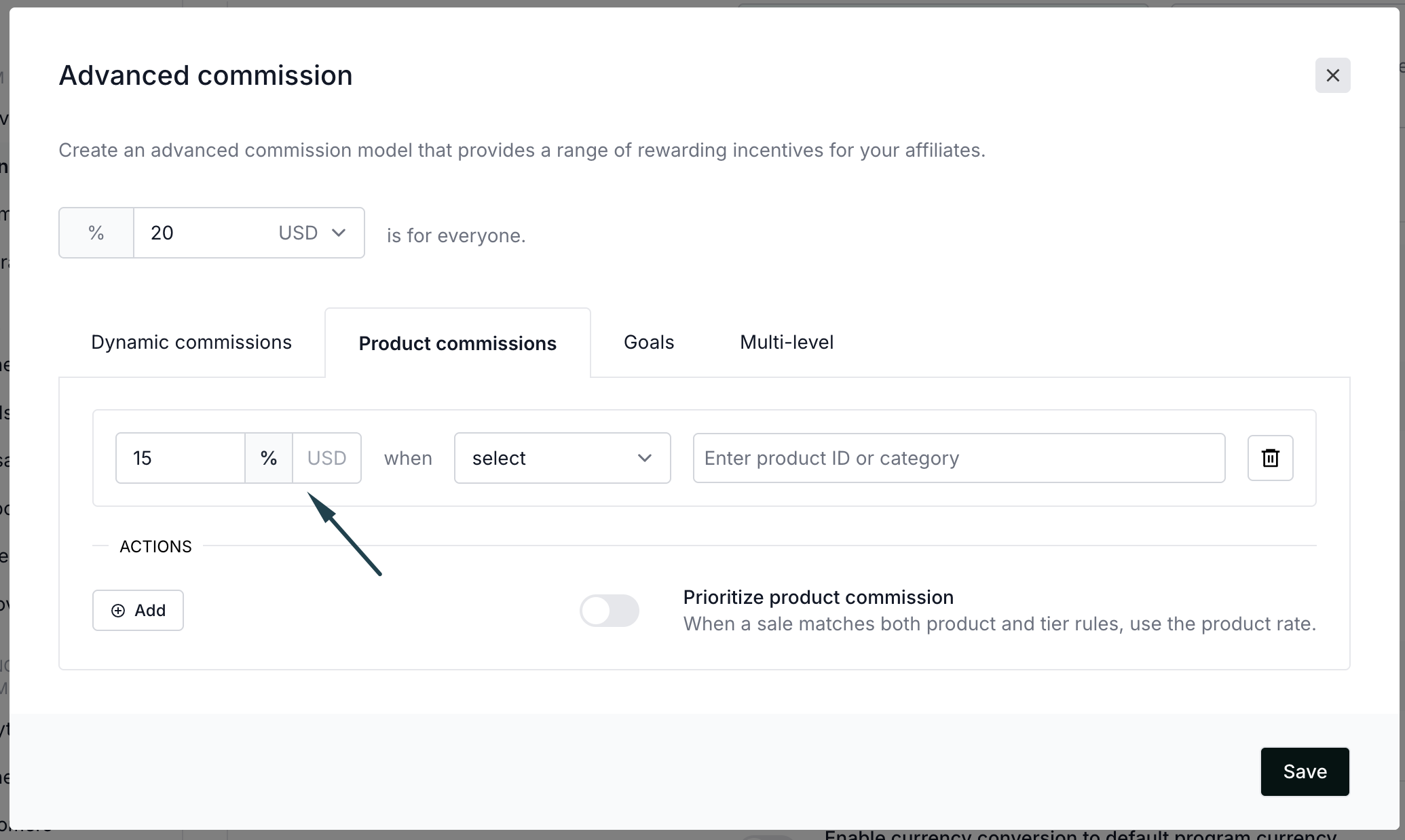 - Click on the Product commissions tab and click +Add: