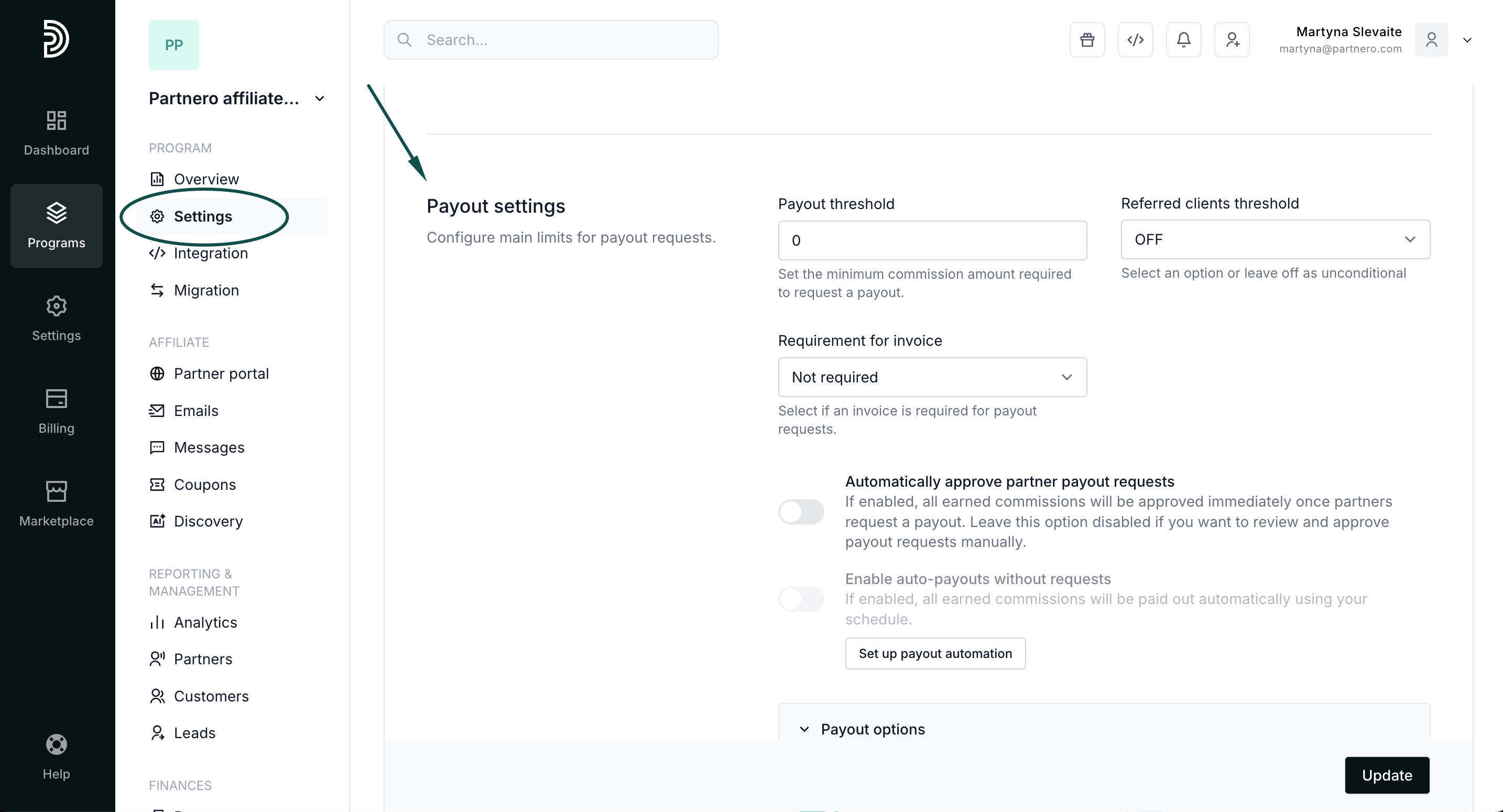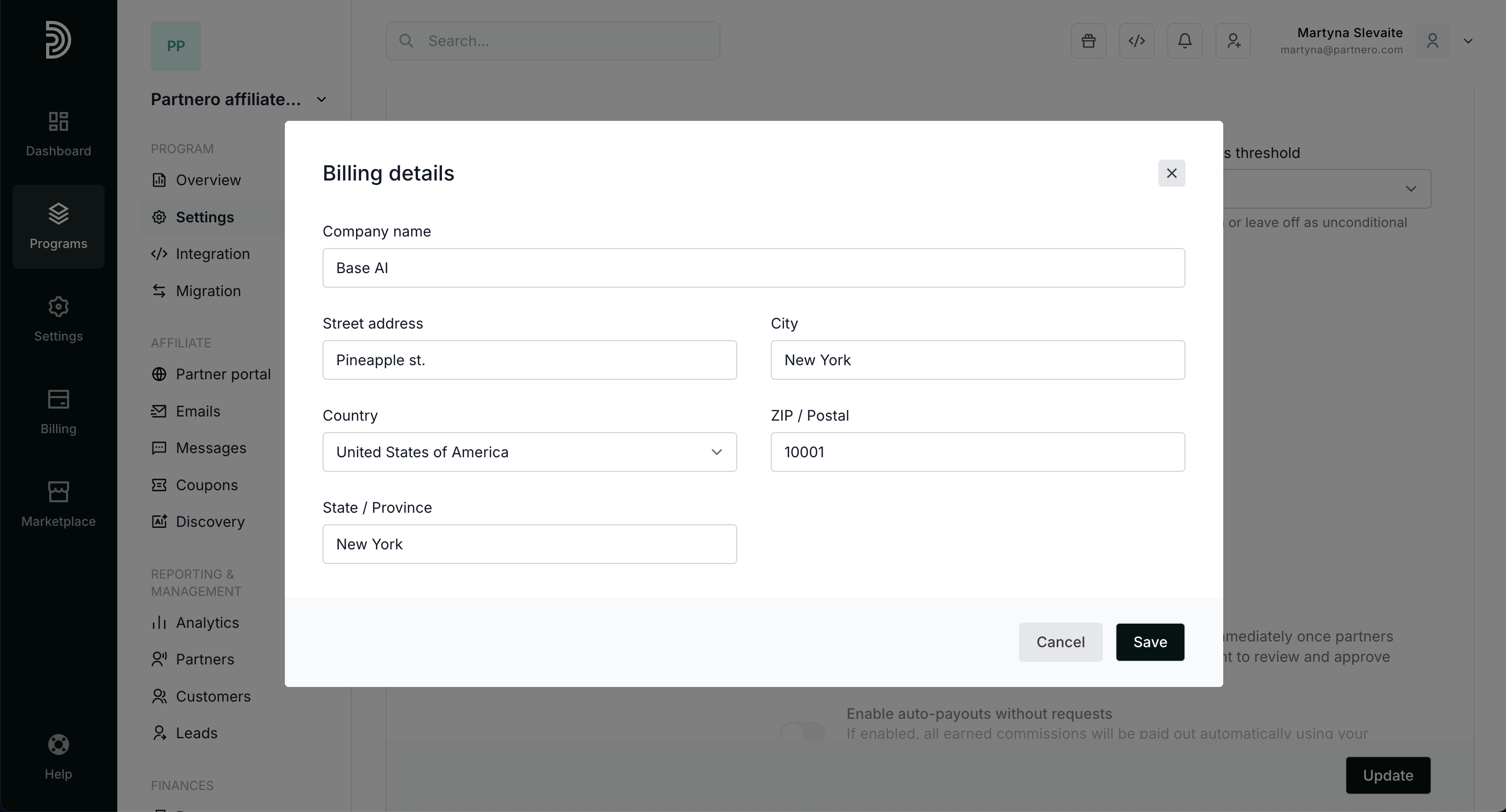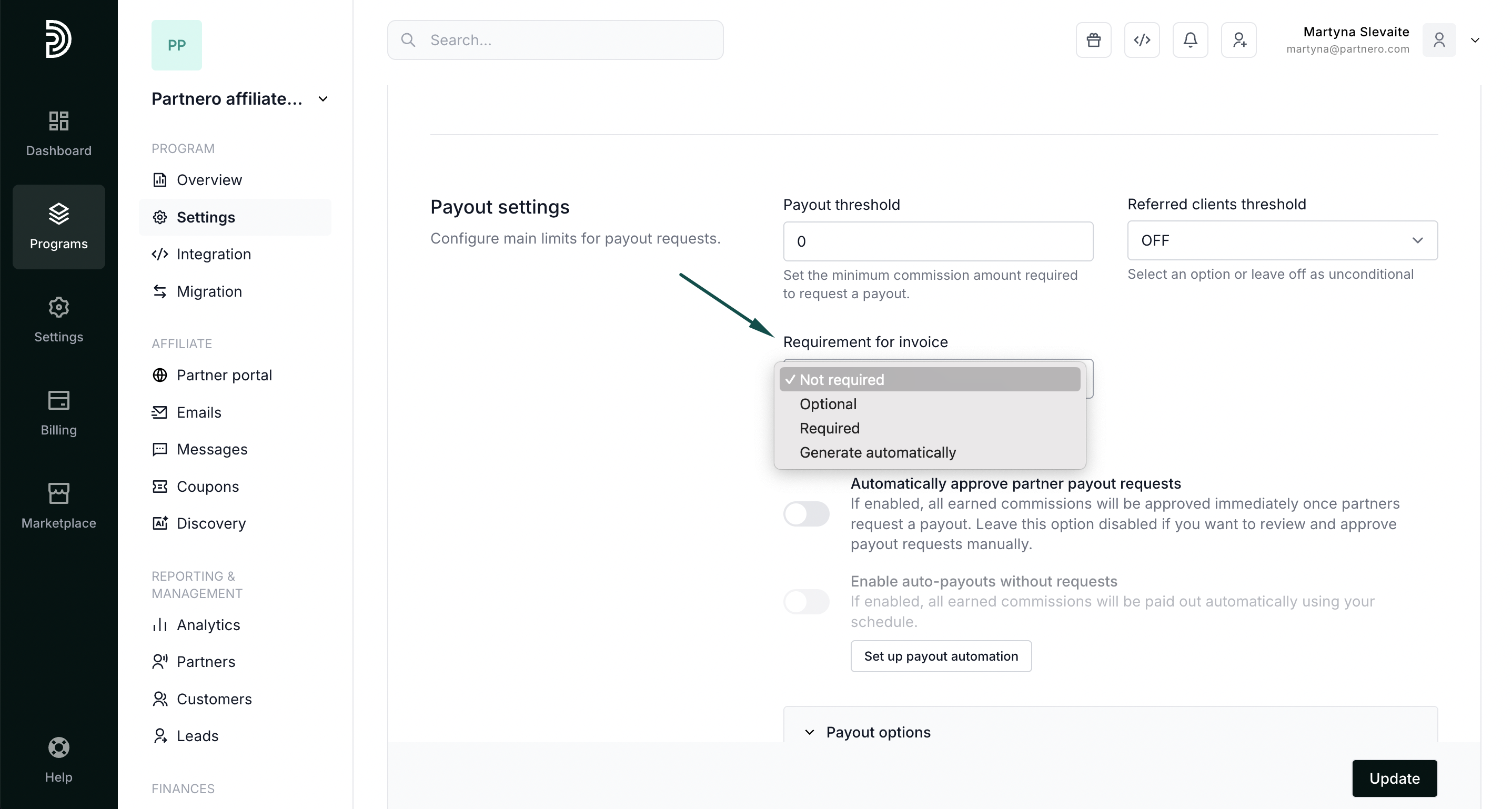With Partnero, you can ask your partners to upload an invoice when they submit a payout request. Alternatively, you can auto-generate invoices to simplify the process.