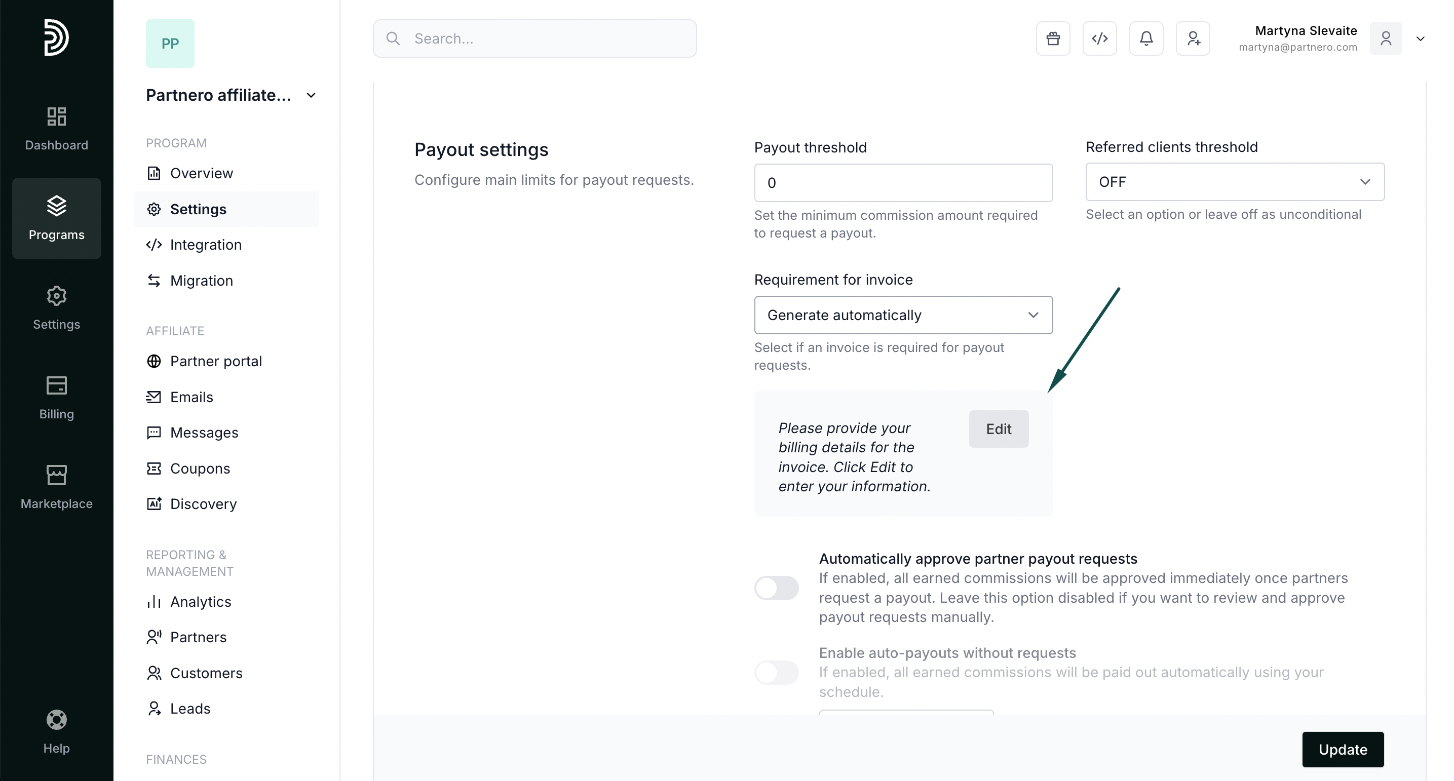 If you're using the Auto-generate invoice option, a partner will be able to preview and attach an auto-generated invoice that will contain your billing details as well as the details the partner provides in the payout request: