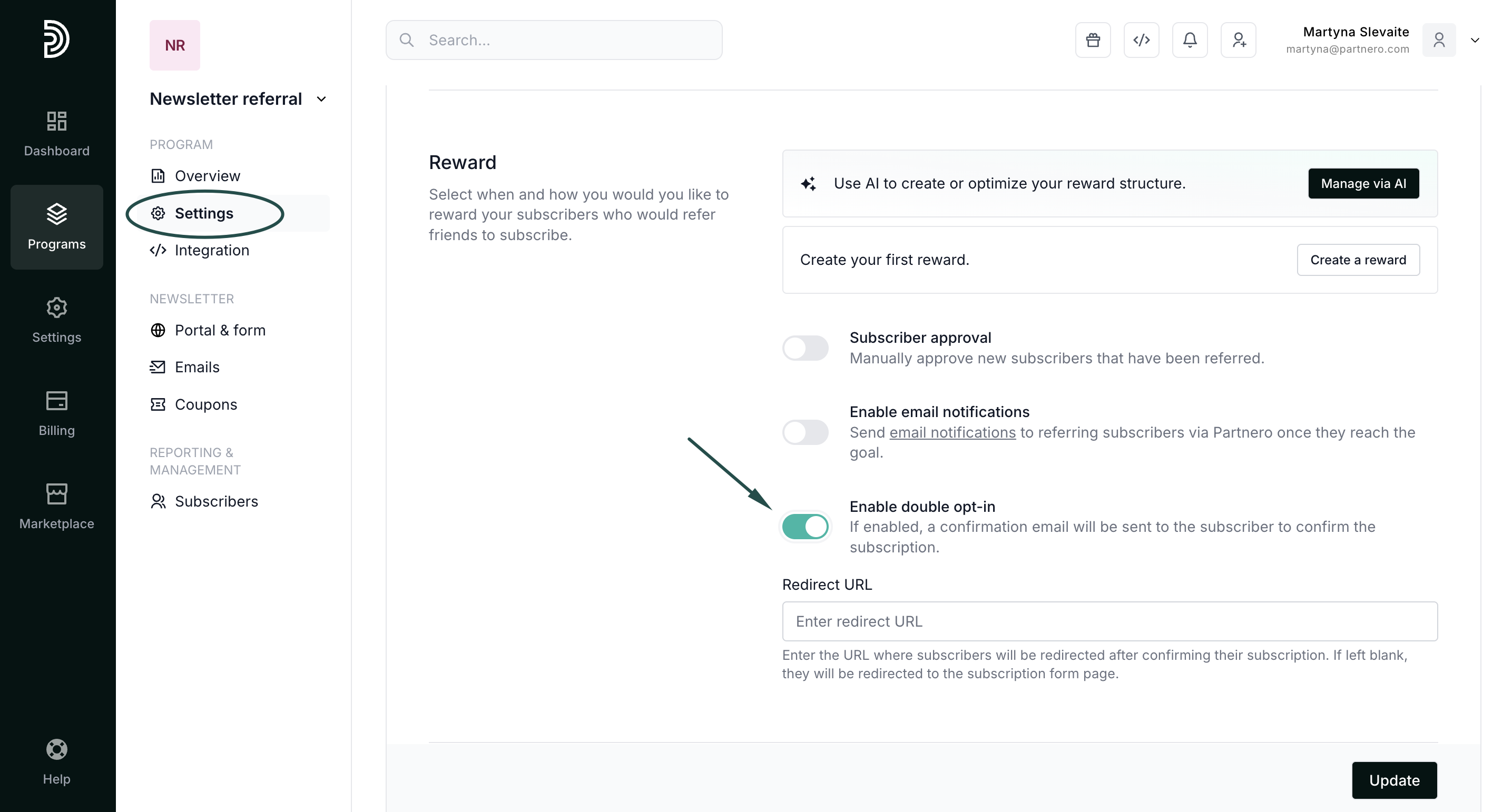 - Go to Settings and scroll down to the Reward section. Toggle Enable double opt-in: