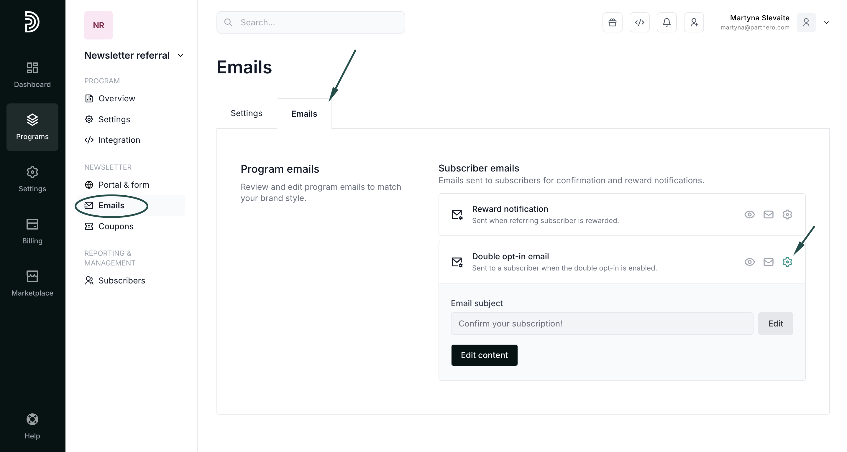 - Switch to the Emails tab and click the cog icon next to the Double opt-in email: