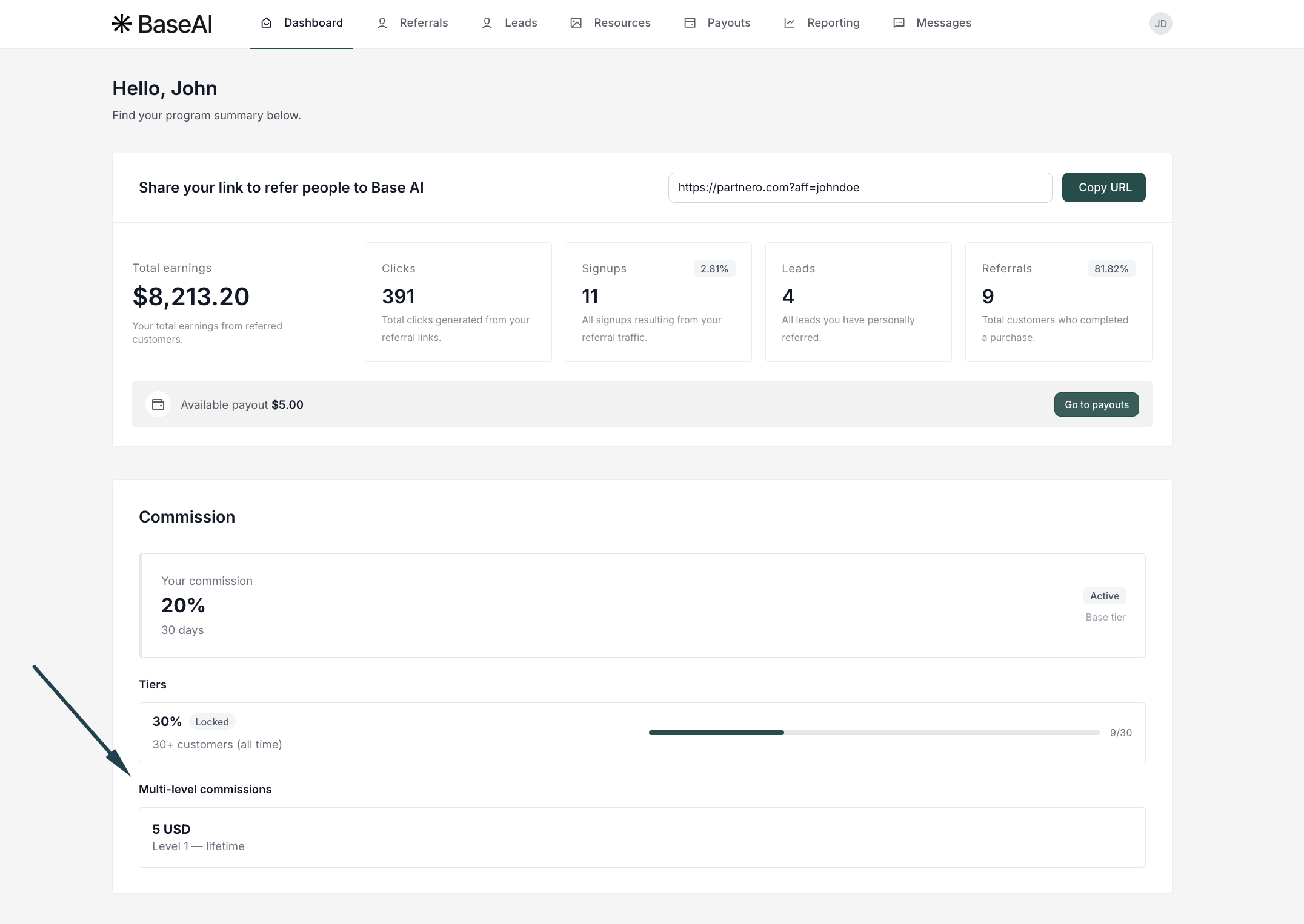 In the Referrals activity list, multi-level commissions are labeled with their level (e.g., "Multi-level commission (Level 1)") so partners can easily identify which tier the commission came from.