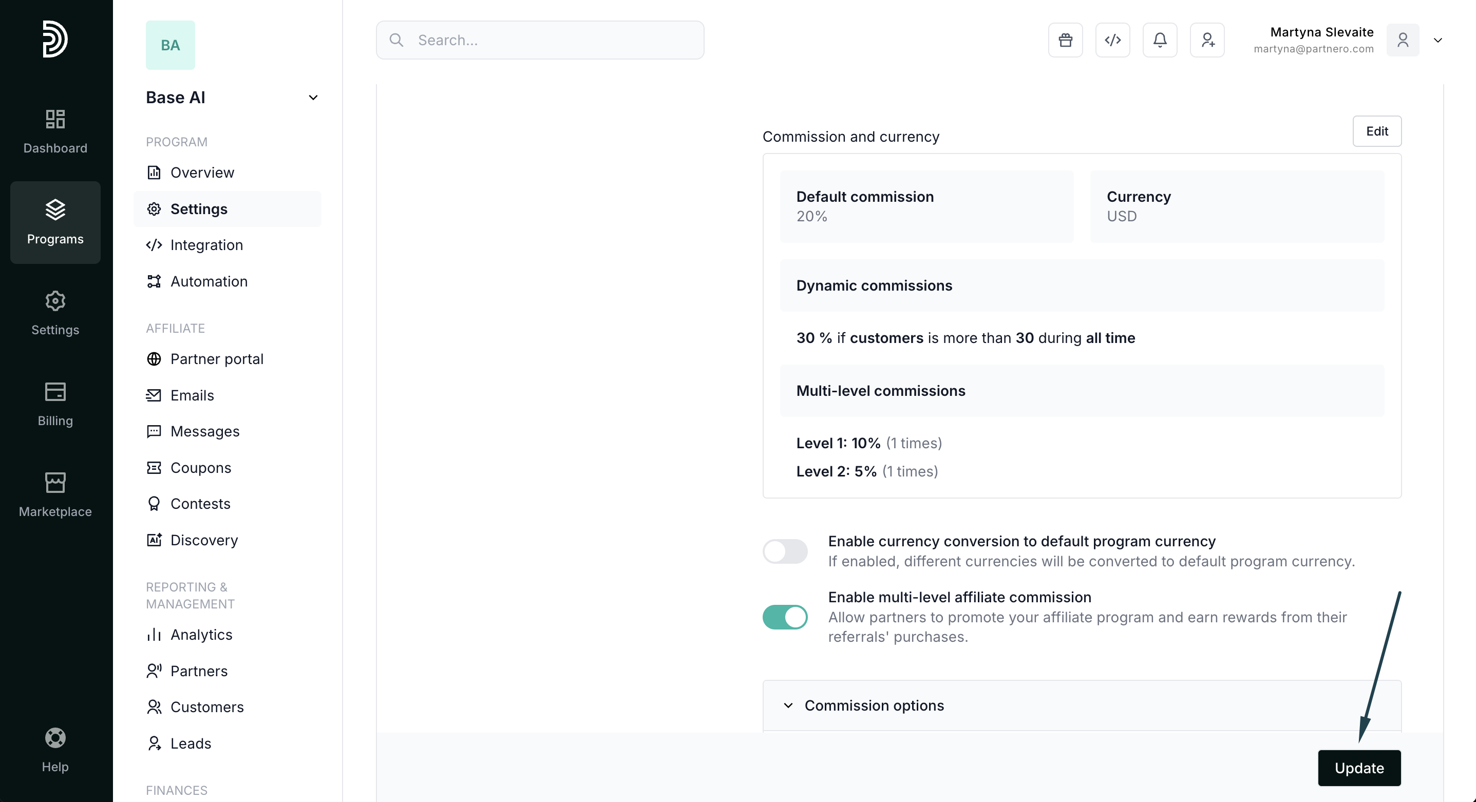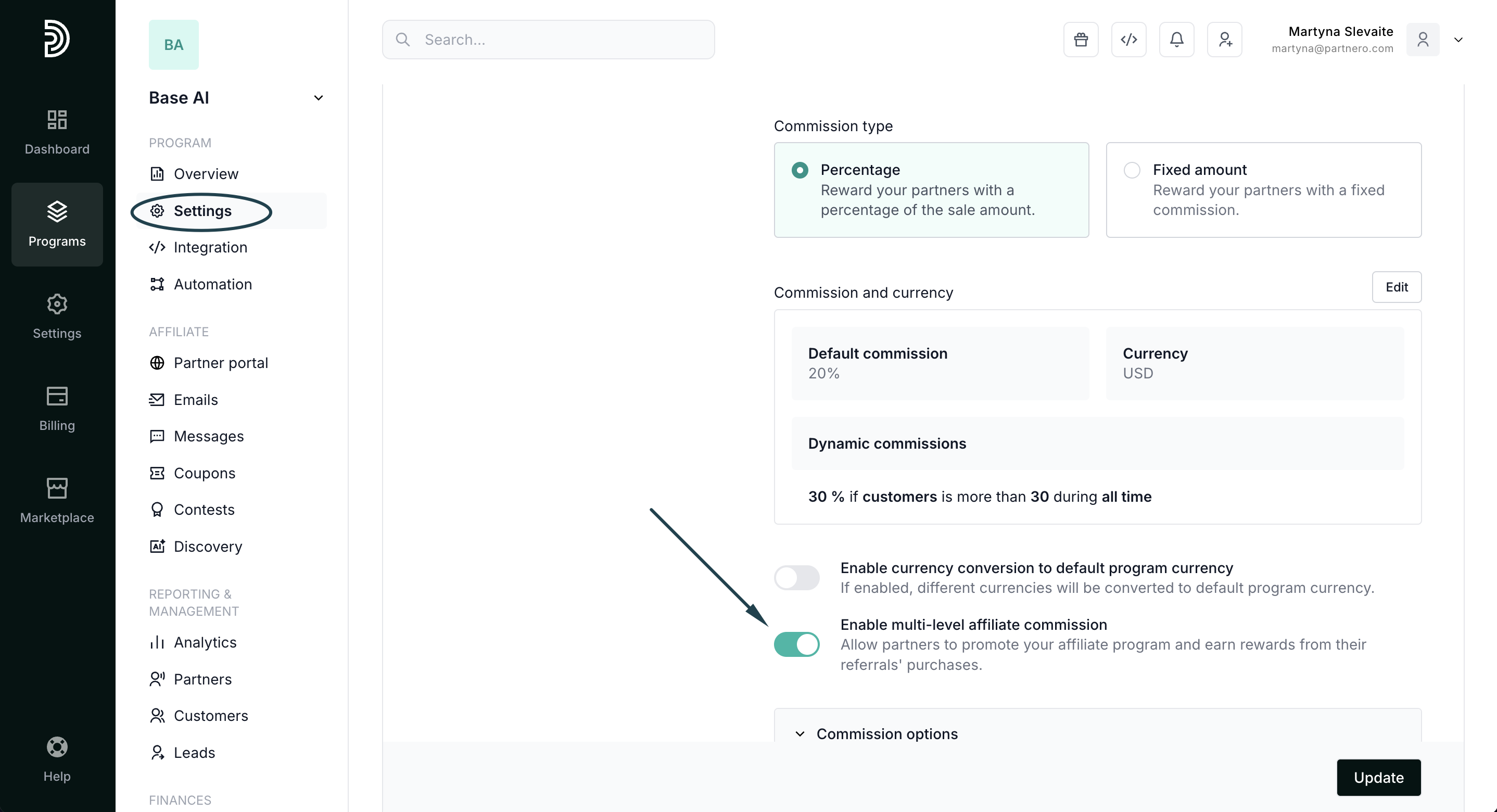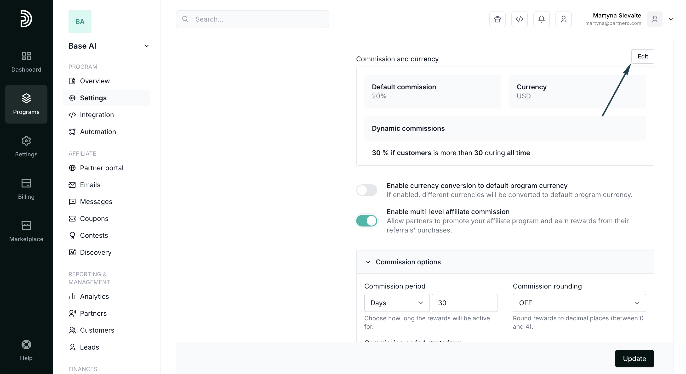 - Open your affiliate program and go to Settings under Program, and scroll down to Commission.