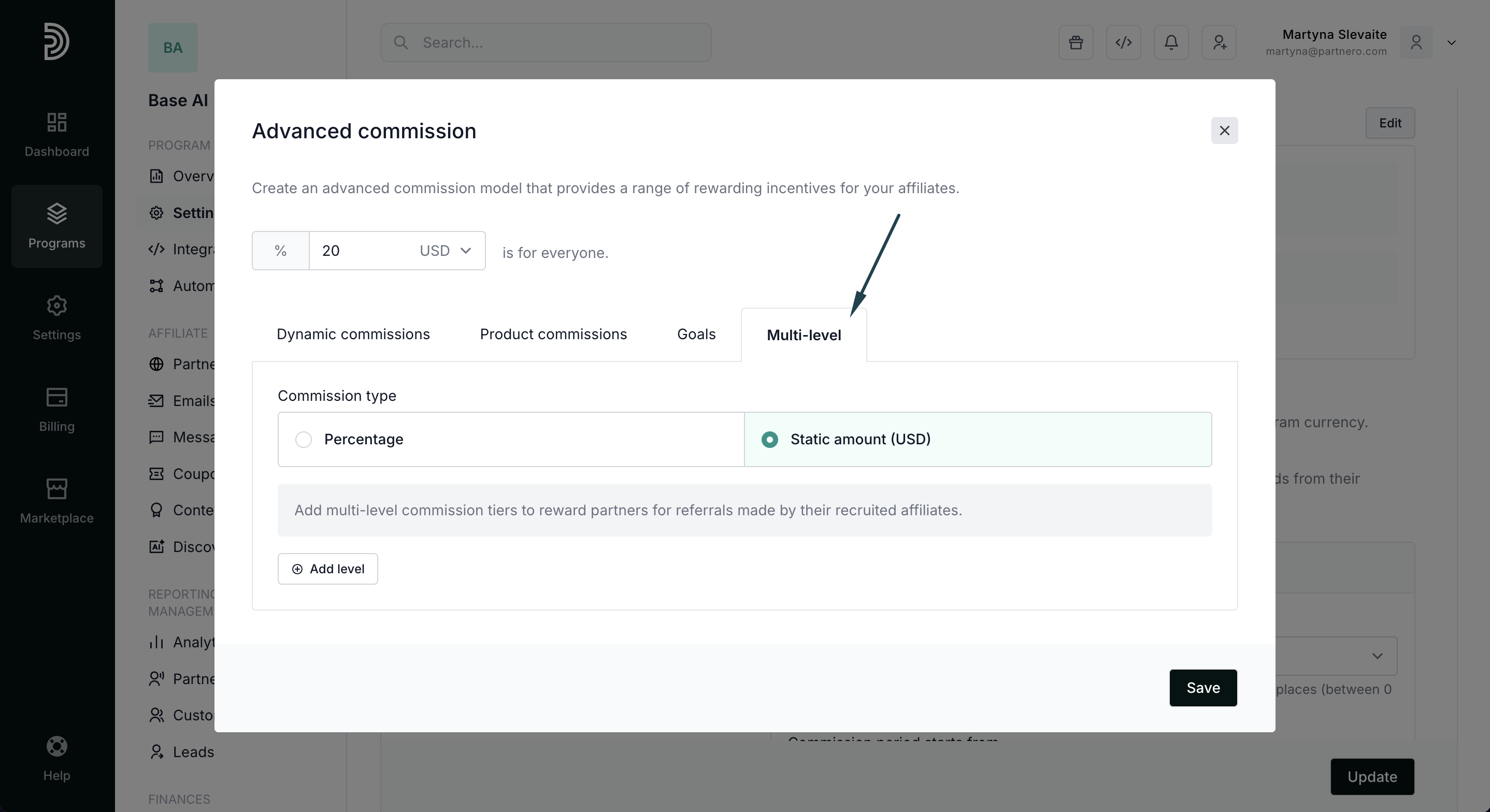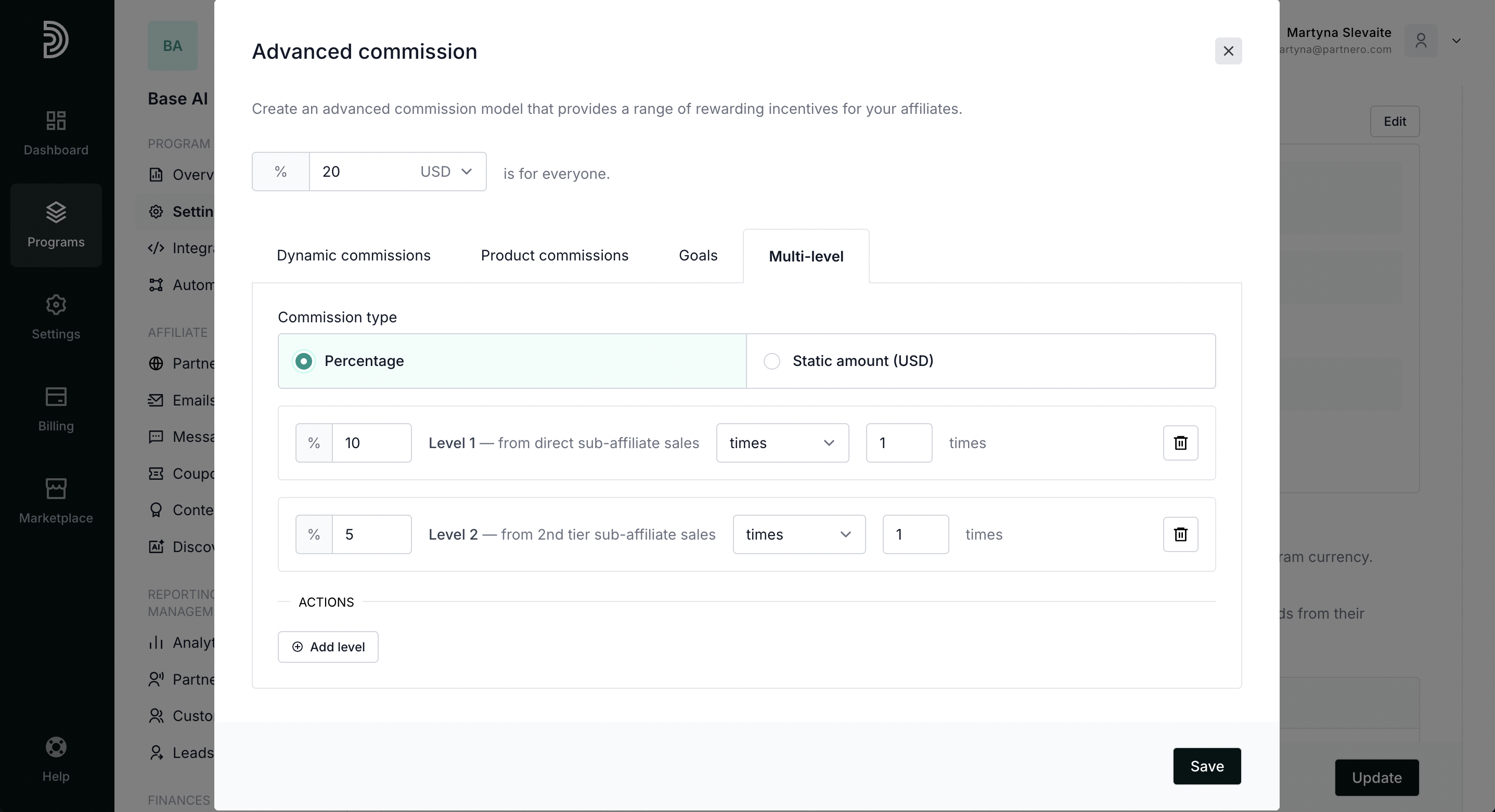 - Choose the Commission type (Percentage or Static amount) - this applies to all levels.