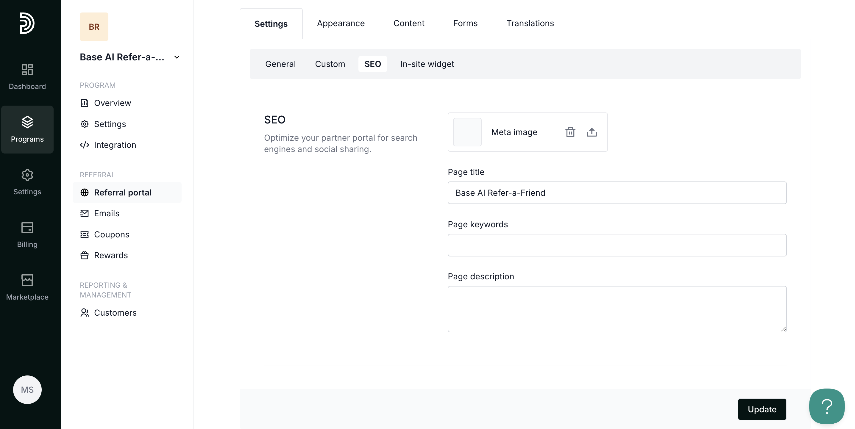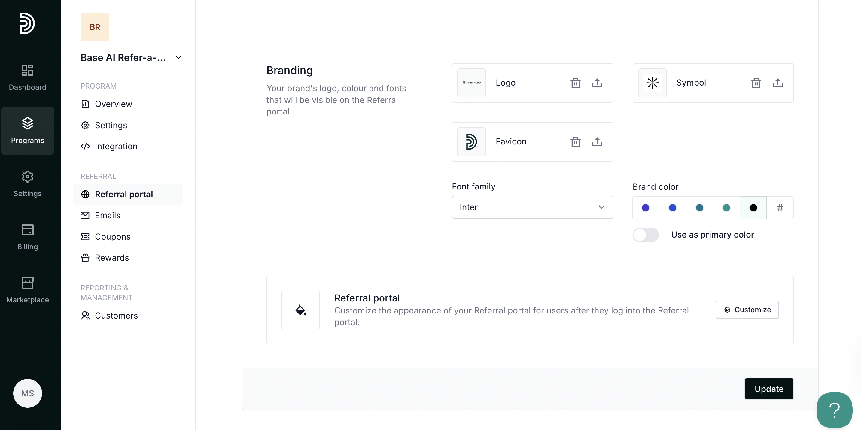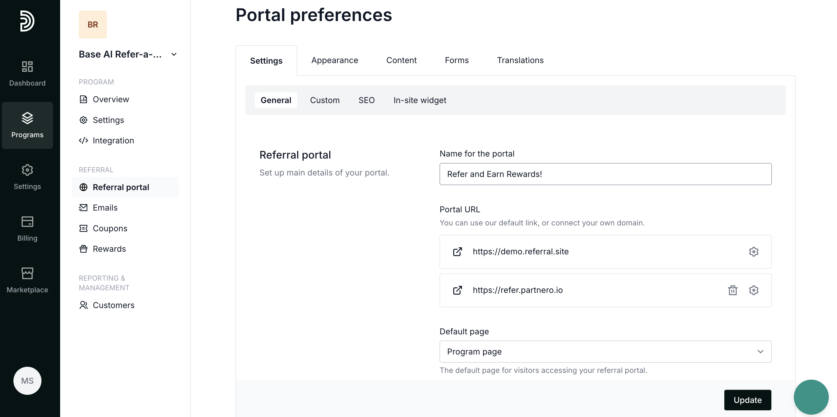 Here, you can add the referral portal name and connect a custom portal domain. Read more.