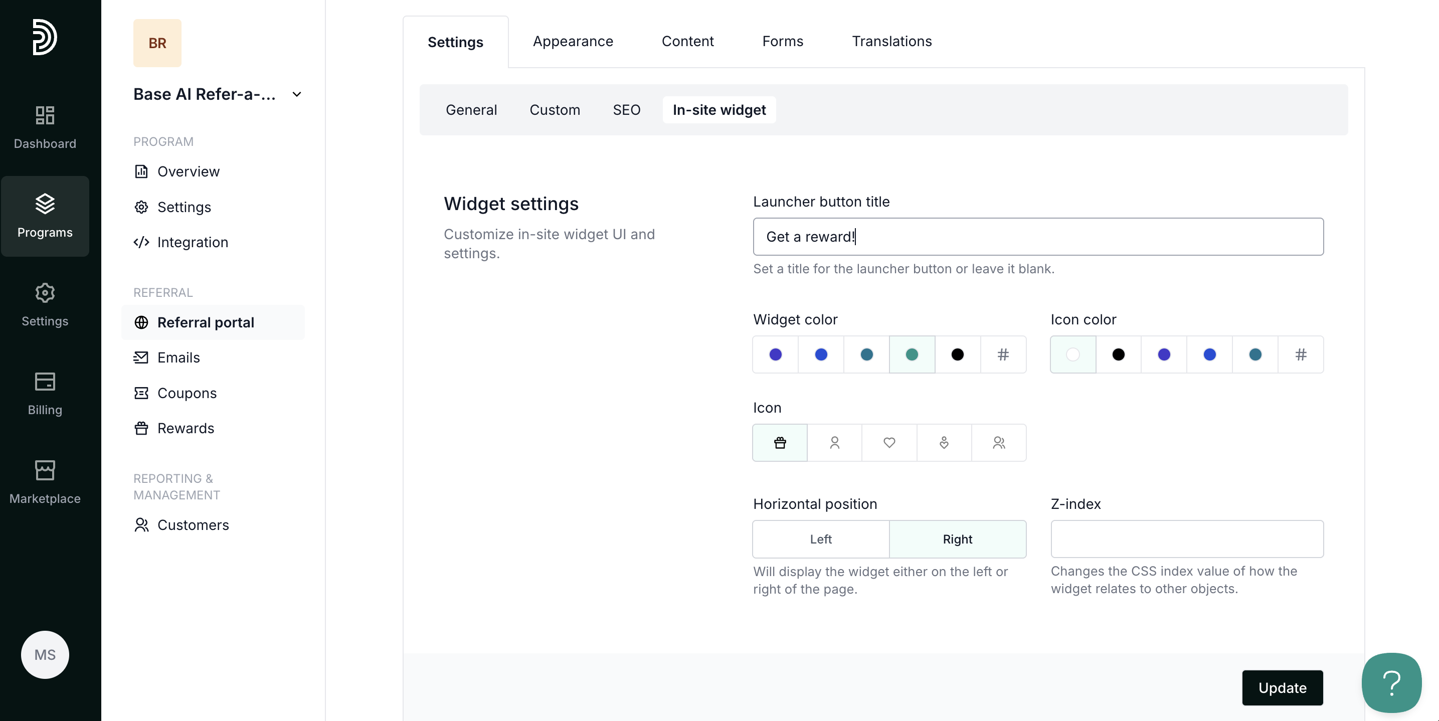 Here, you can customize the in-site widget, including the colors, icon, and positioning.