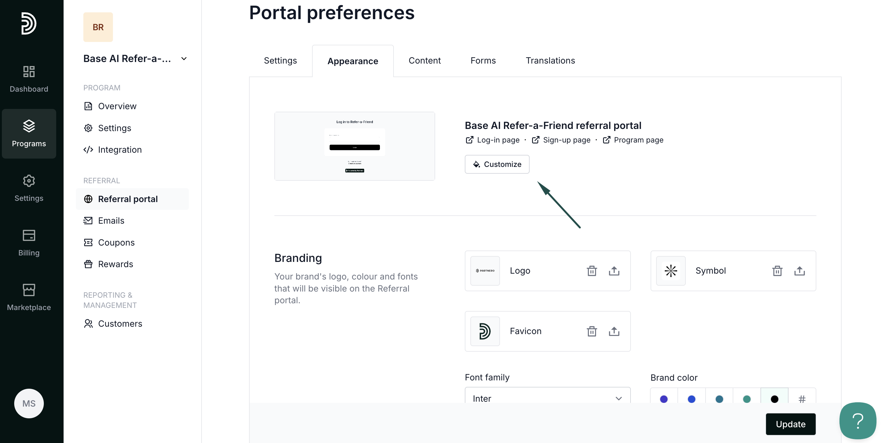 The Appearance tab is where you can customize the referral portal branding. Click Customize to edit the portal using our Live Designer feature.