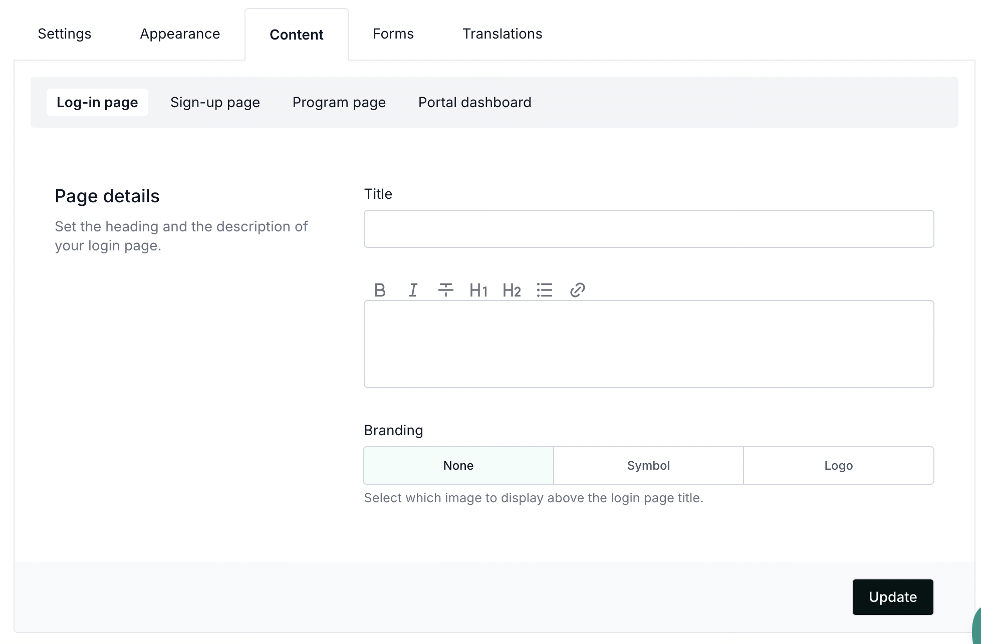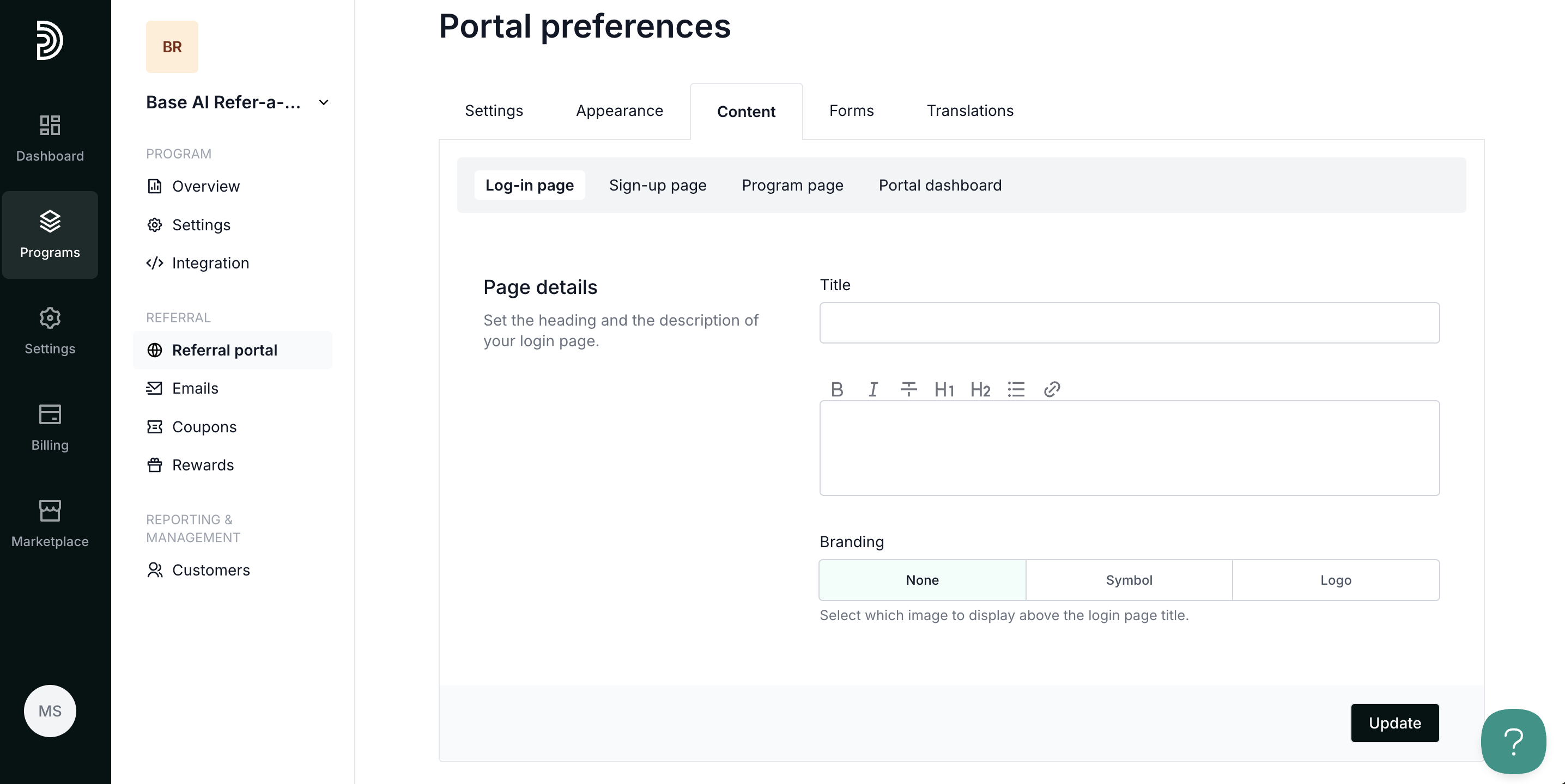 Here you can build the program page for promoting your referral program. Add title and description, choose whether you'd like to show sign-up and log-in links on the page.