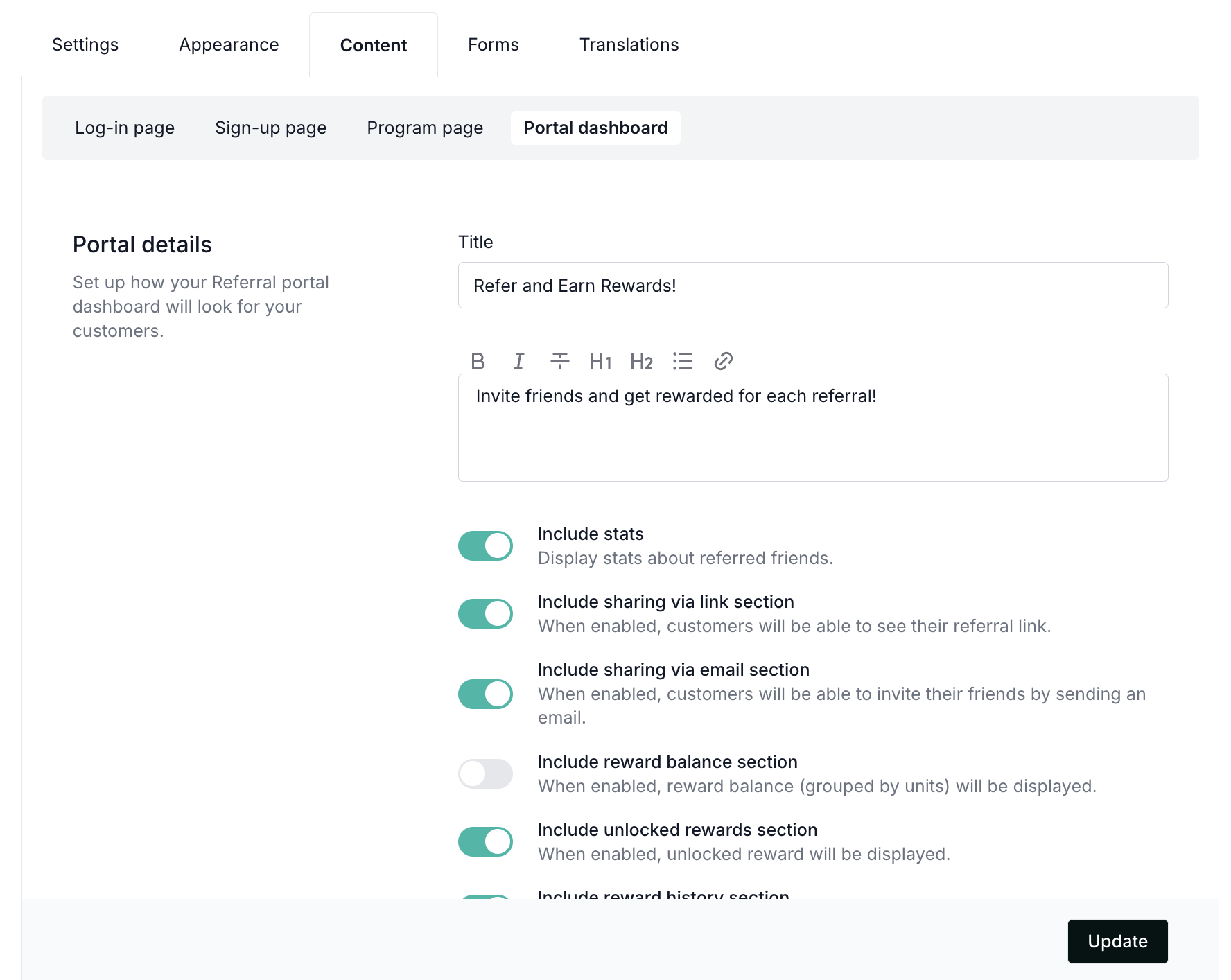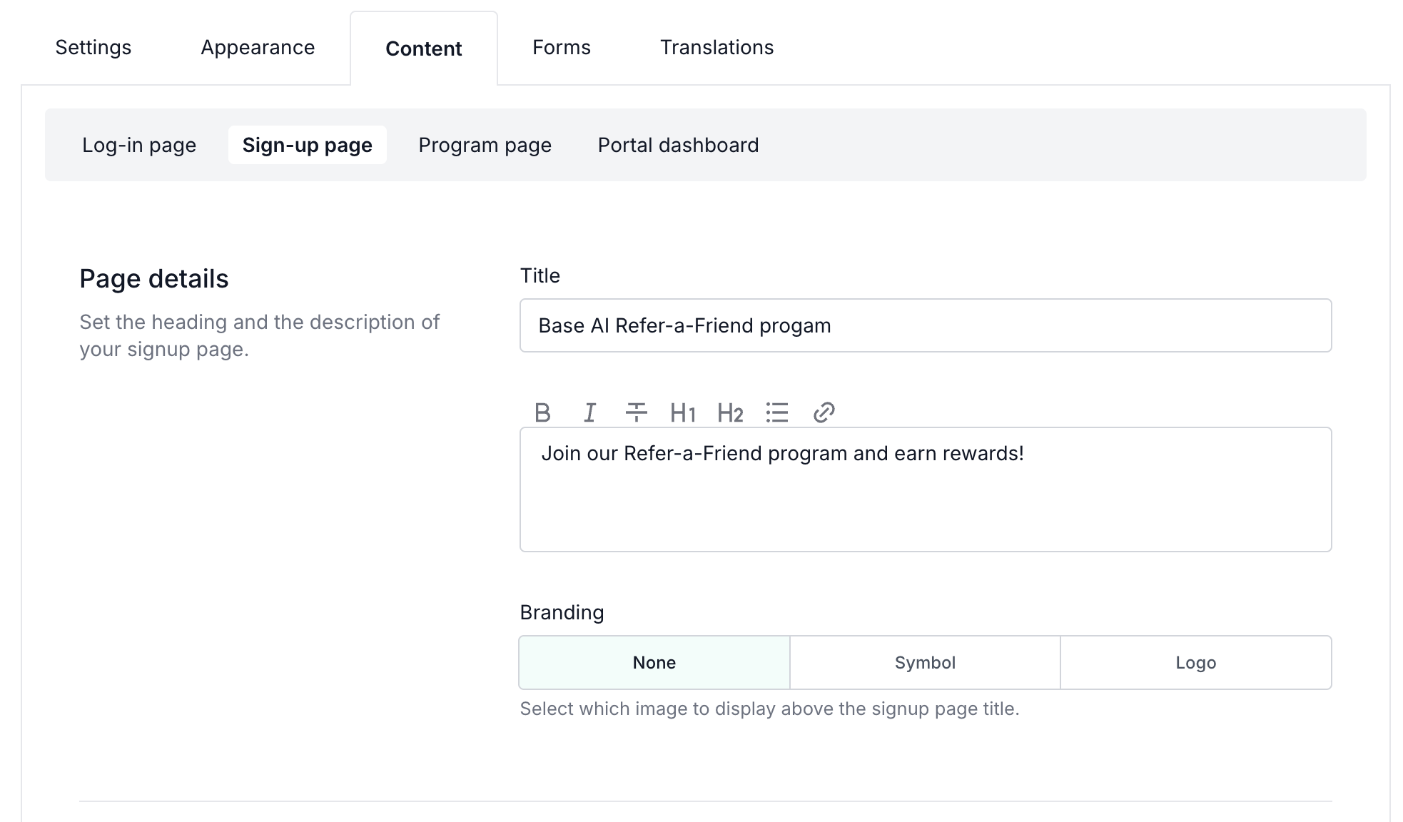 The Content tab is dedicated to adding your copy and customizing text throughout the referral portal and program page.