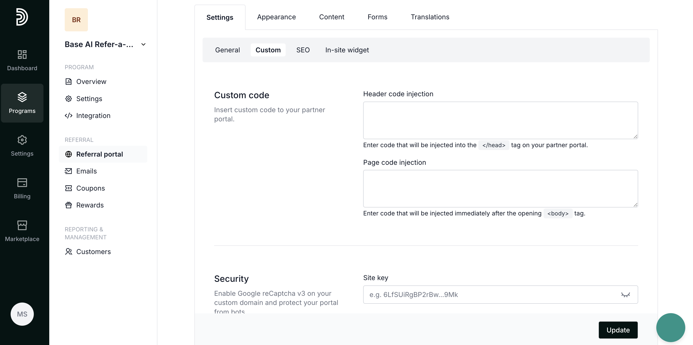 Custom code: Here, you can insert custom code into the header or the page of your referral portal.