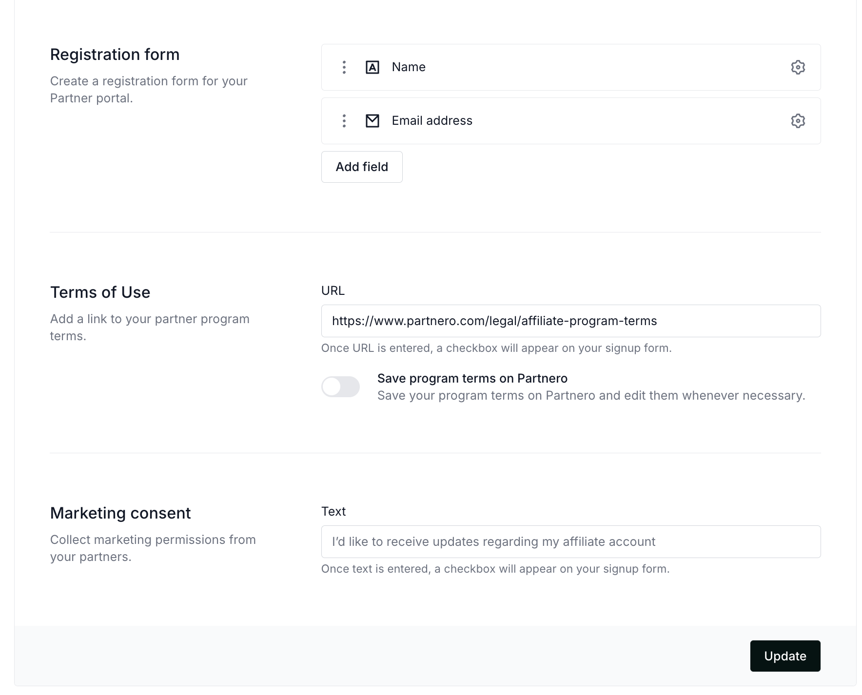 Terms of Use: link to your referral program ToS. When added, a checkbox with a link will appear on the signup page.
