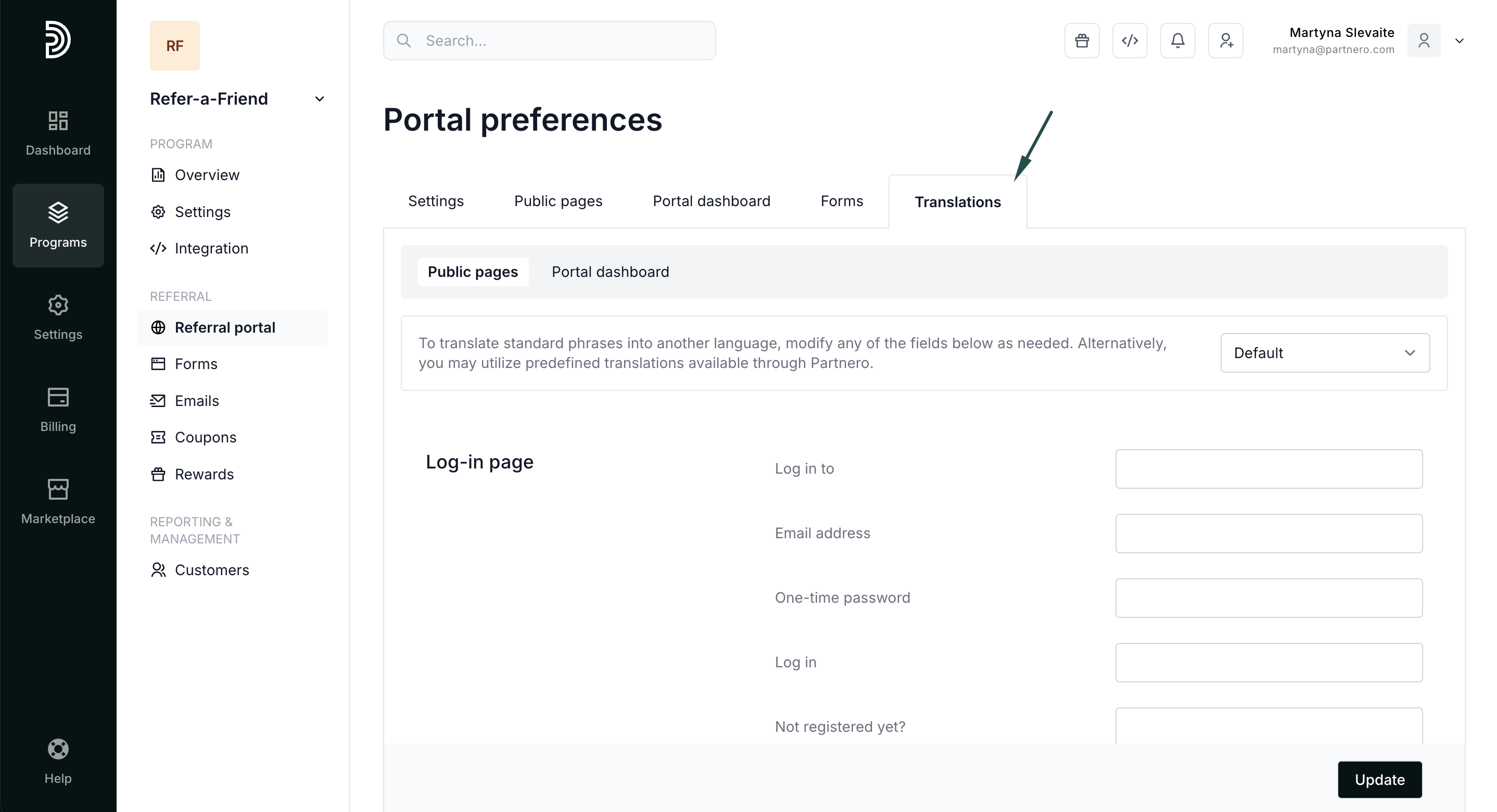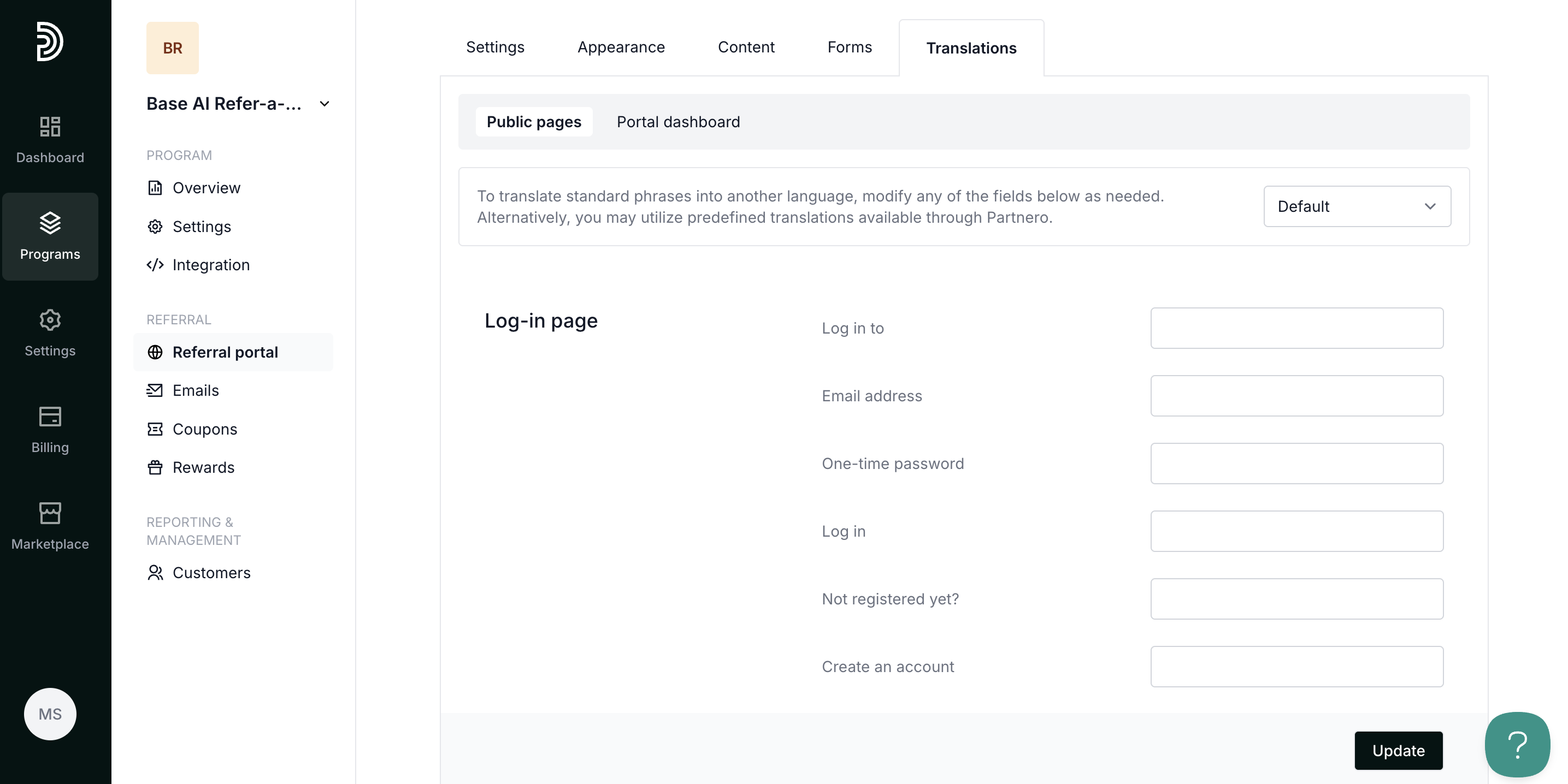 By default, all referral portal content will be displayed in English. However, you can manually change the content to a different language or wording, or utilize predefined translations available through Partnero. Read more about translations here.