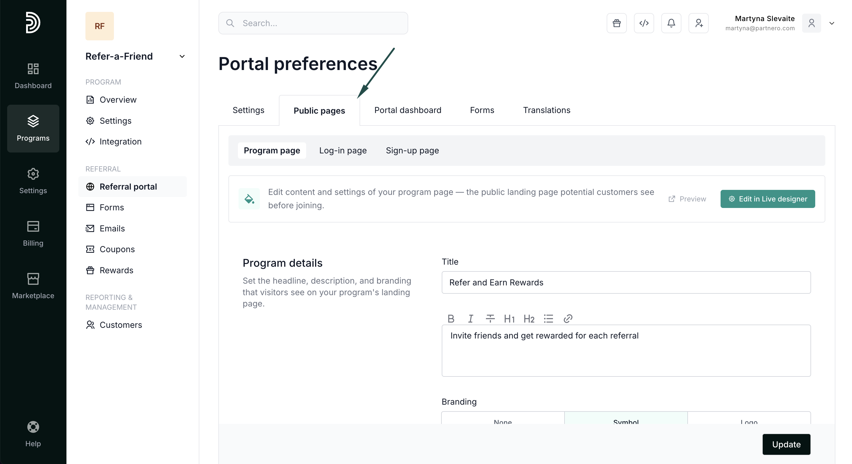 Next, you'll find the Public pages tab, where you can configure the program, log-in and sign-up pages.