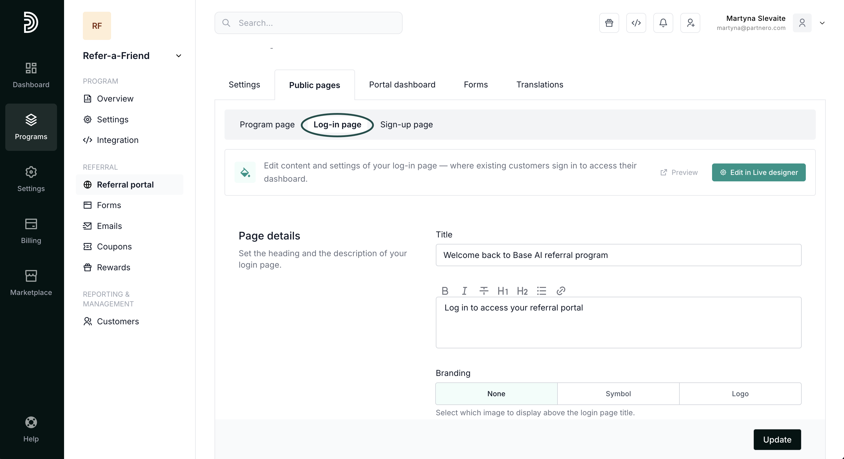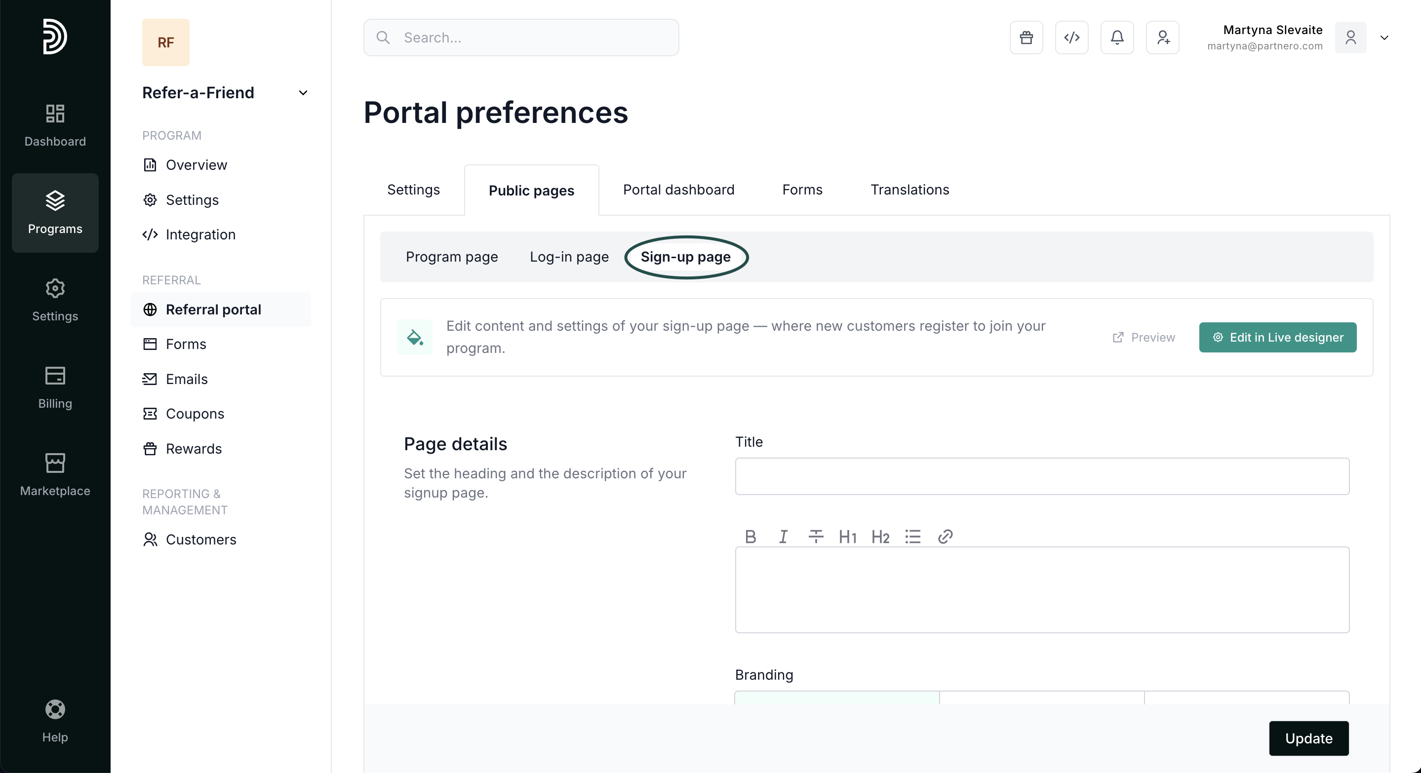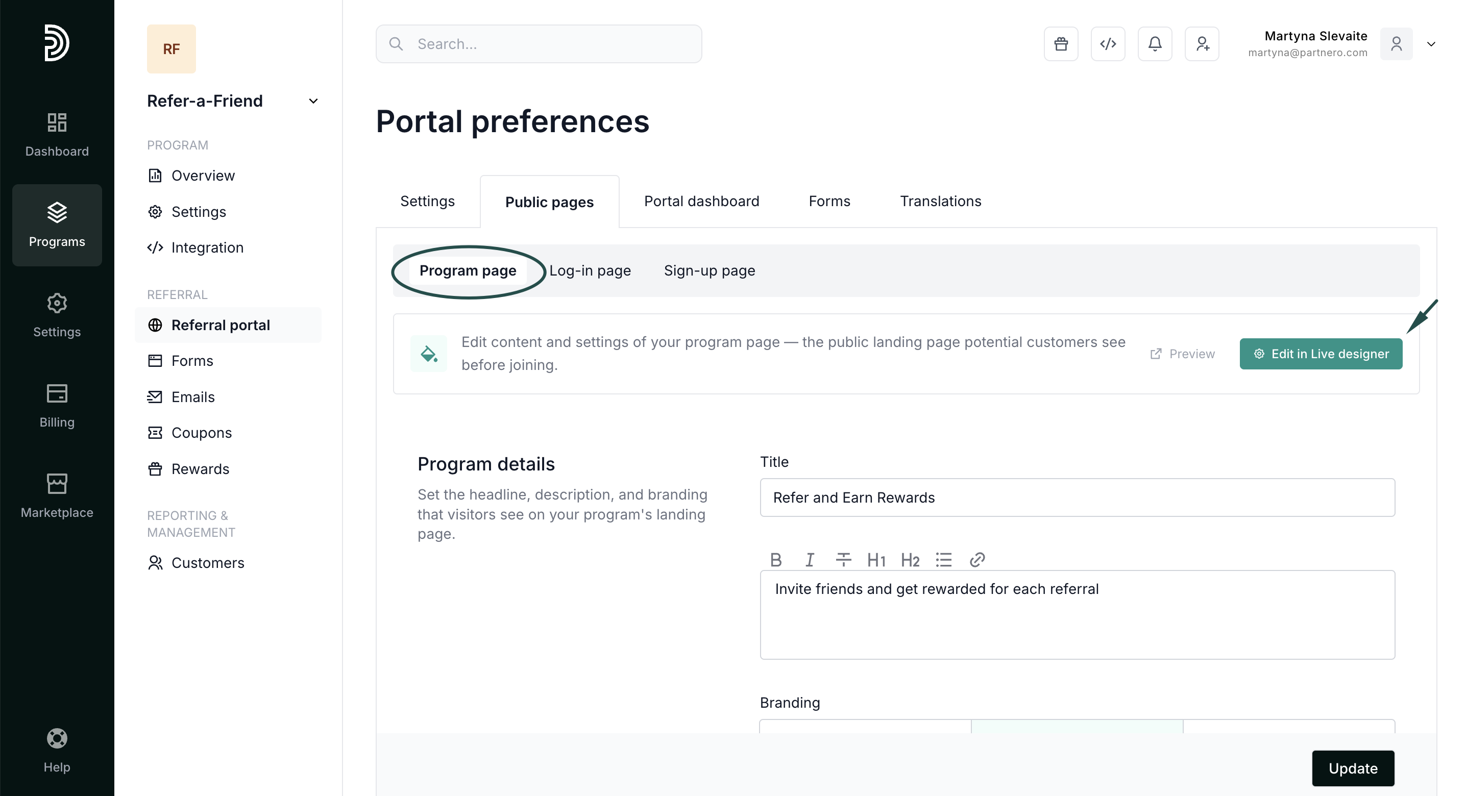 Here, you can build the program page to promote your referral program. Add title and description, and choose whether you'd like to show sign-up and log-in links on the page. For easier editing, we recommend using our live designer editor.