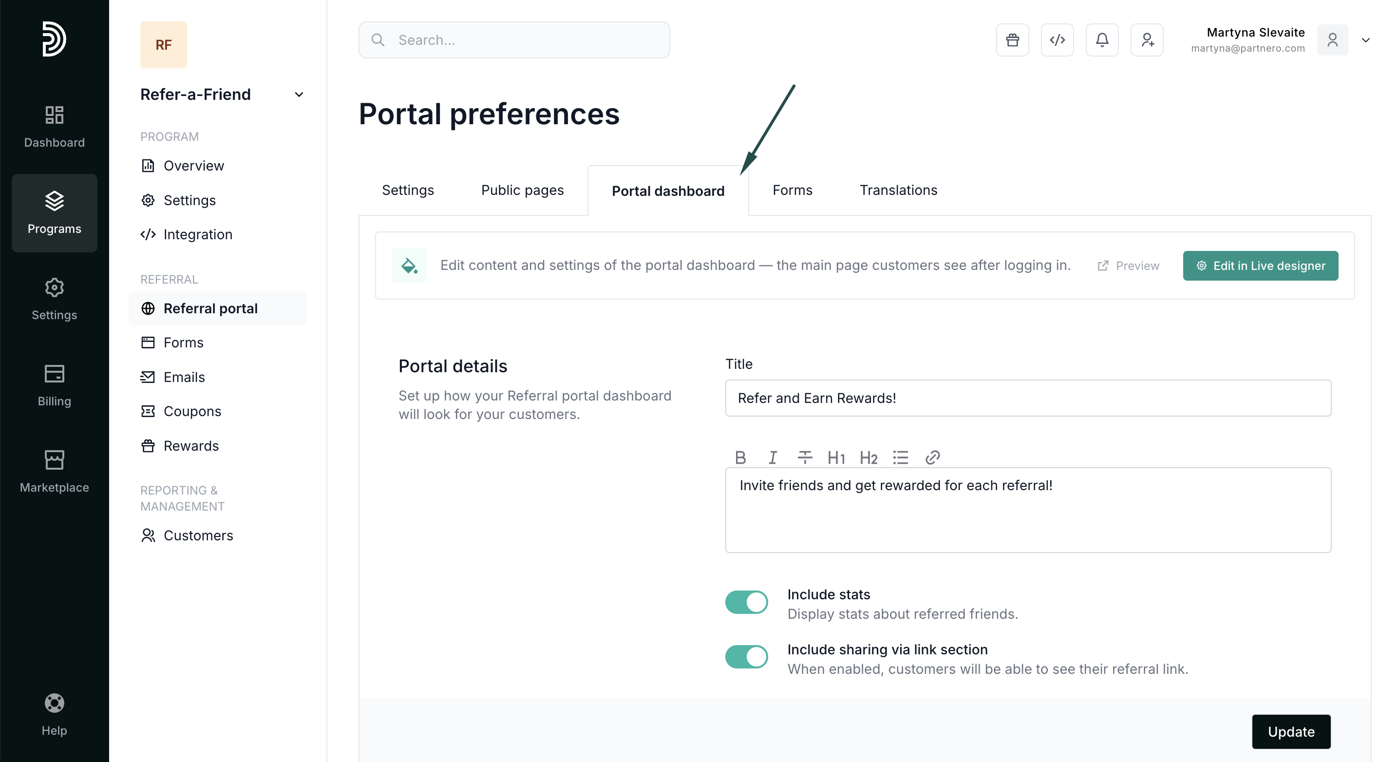 Here, you can decide what will be included in the referral portal dashboard:
