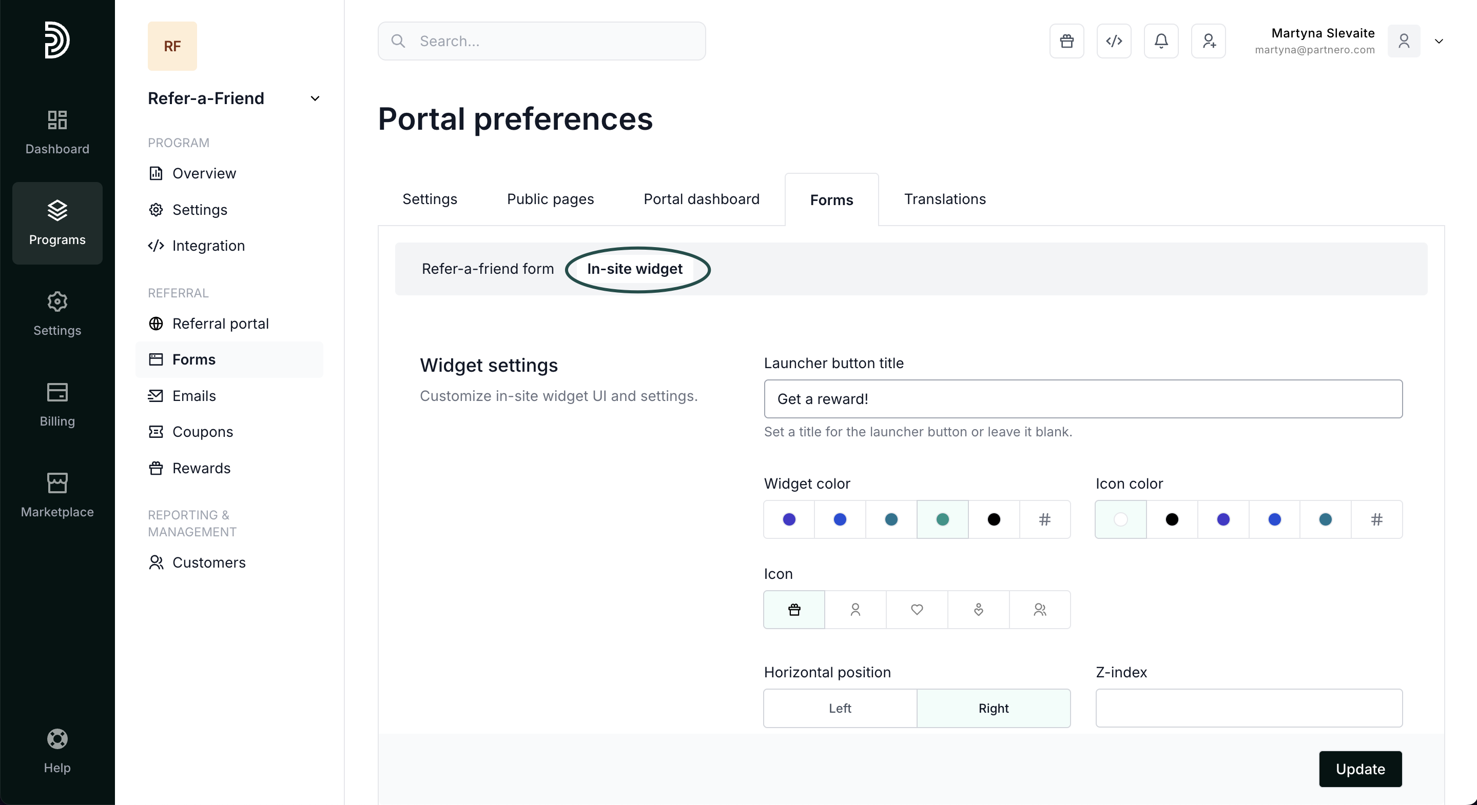When enabled, the portal can be accessed via an in-site widget on your site or app. Read more. - Enable Partnero branding on the portal